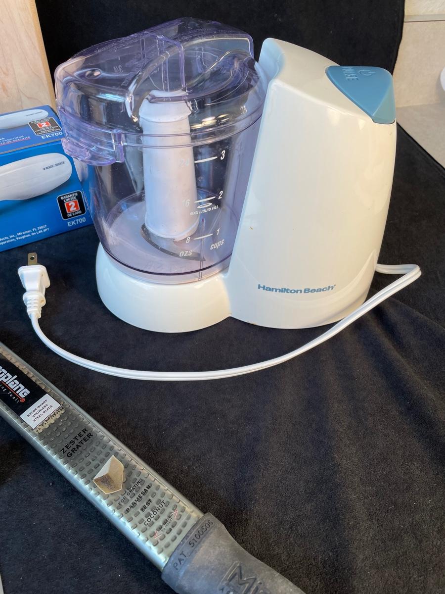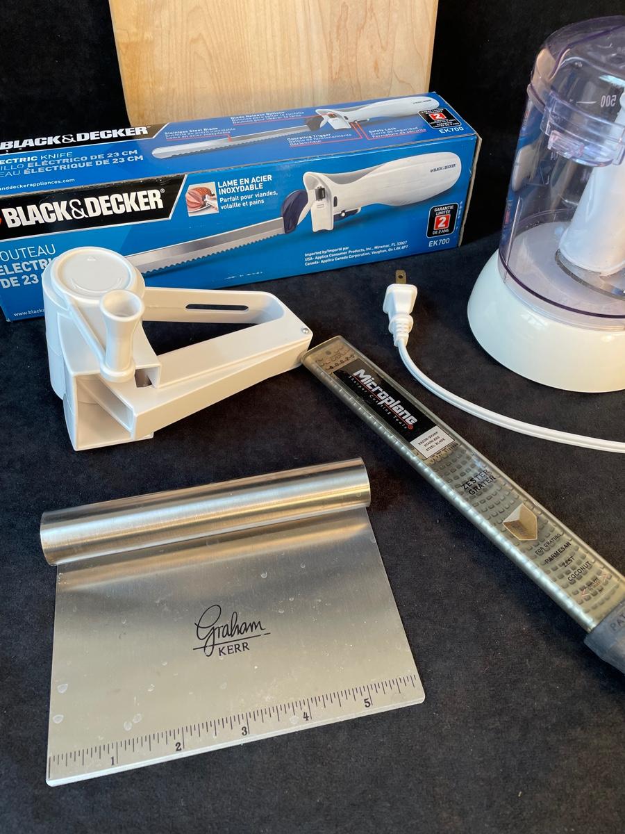 Includes electric carving knife, rotary cheese grater, Microplane grater, cutting board and metal kitchen tool