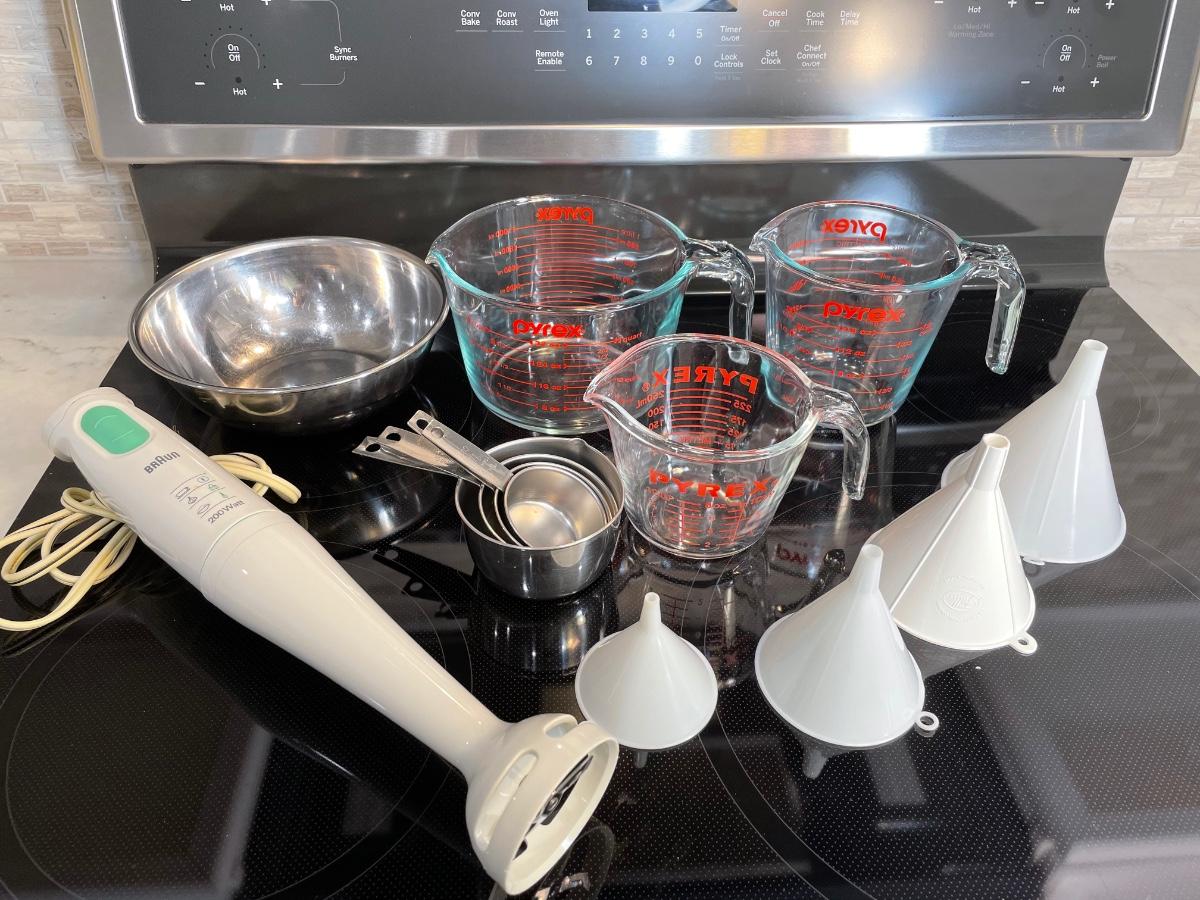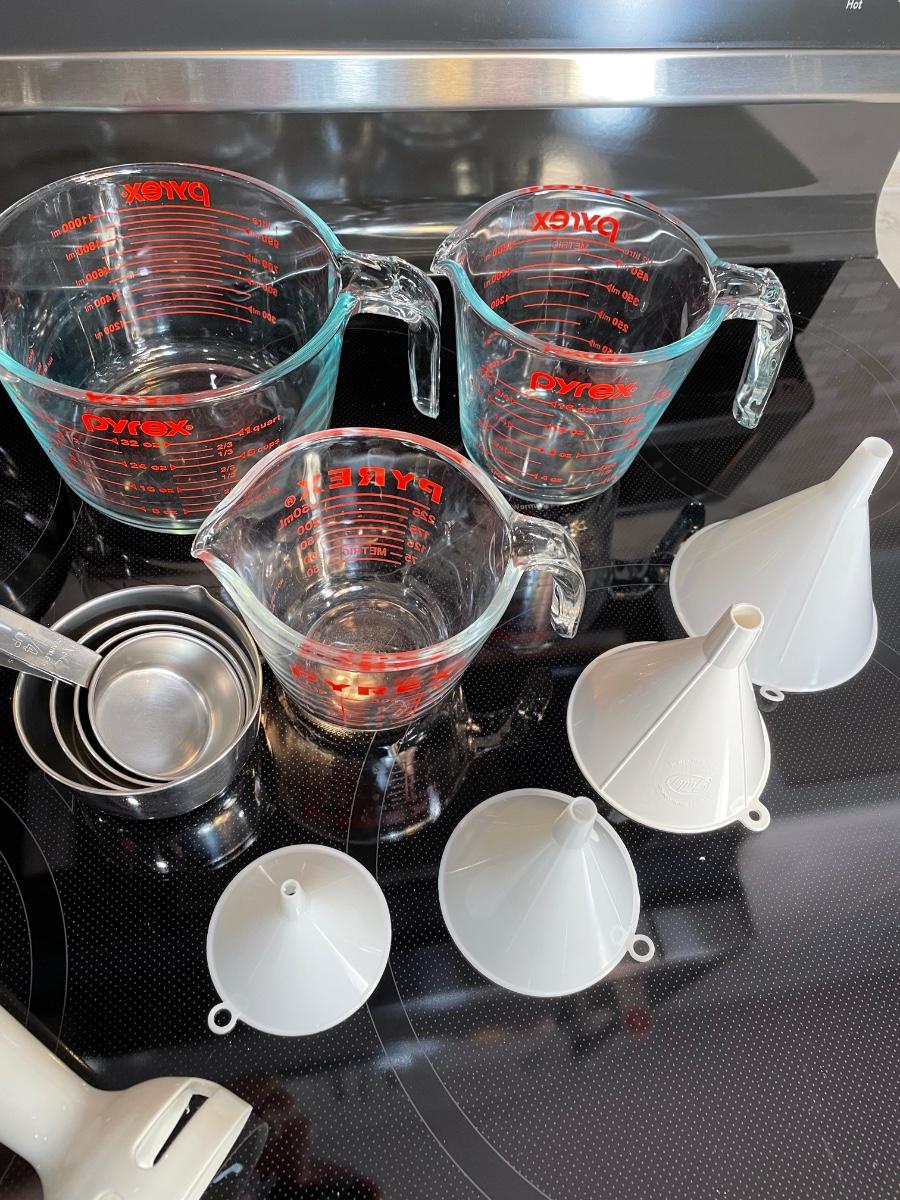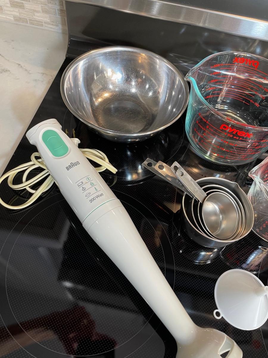 Braun hand Blender, 3 Pyrex glass measuring cups, a set of metal dry measuring cups, set of 4 funnels and a small metal bowl