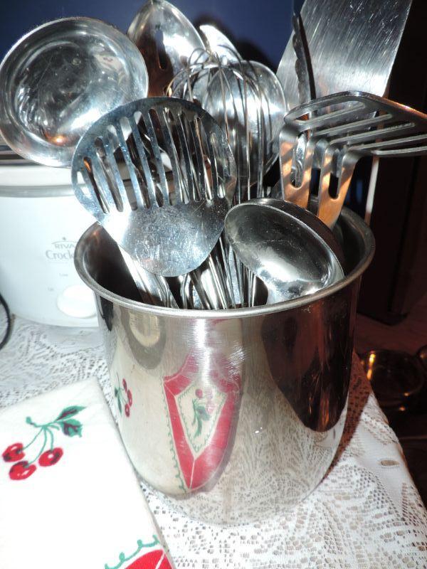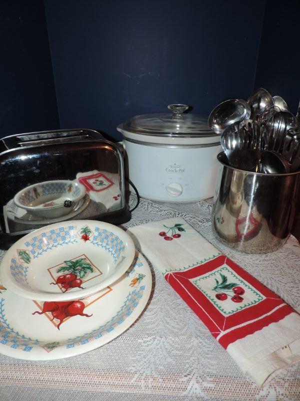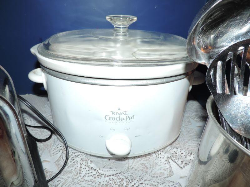 GE STAINLESS STEEL TOASTER, CROCKPOT. STAINLESS STEEL CANISTER WITH COOLING UTENSIL'S, MORE