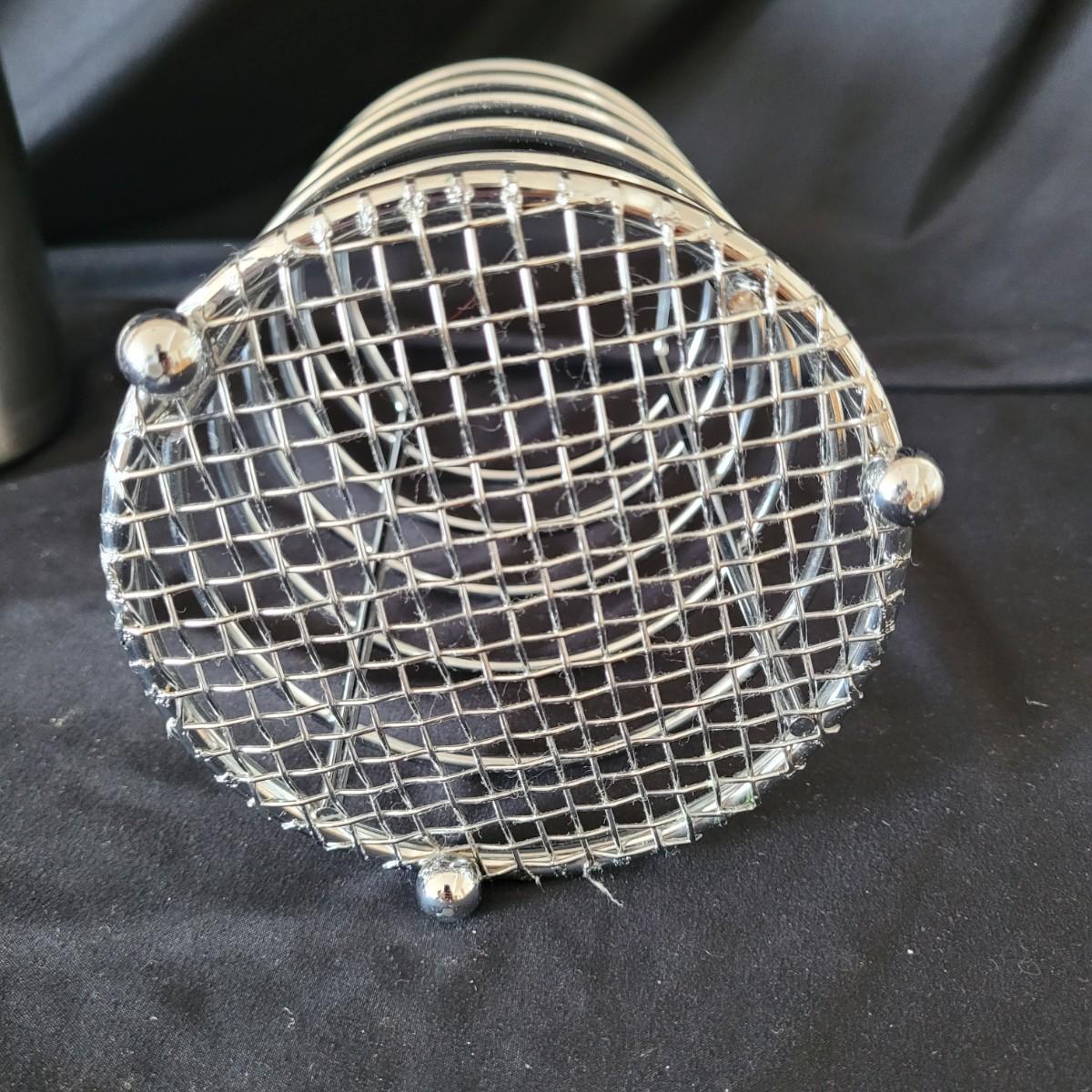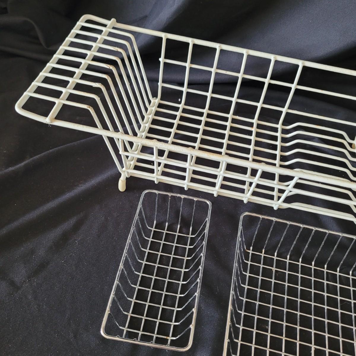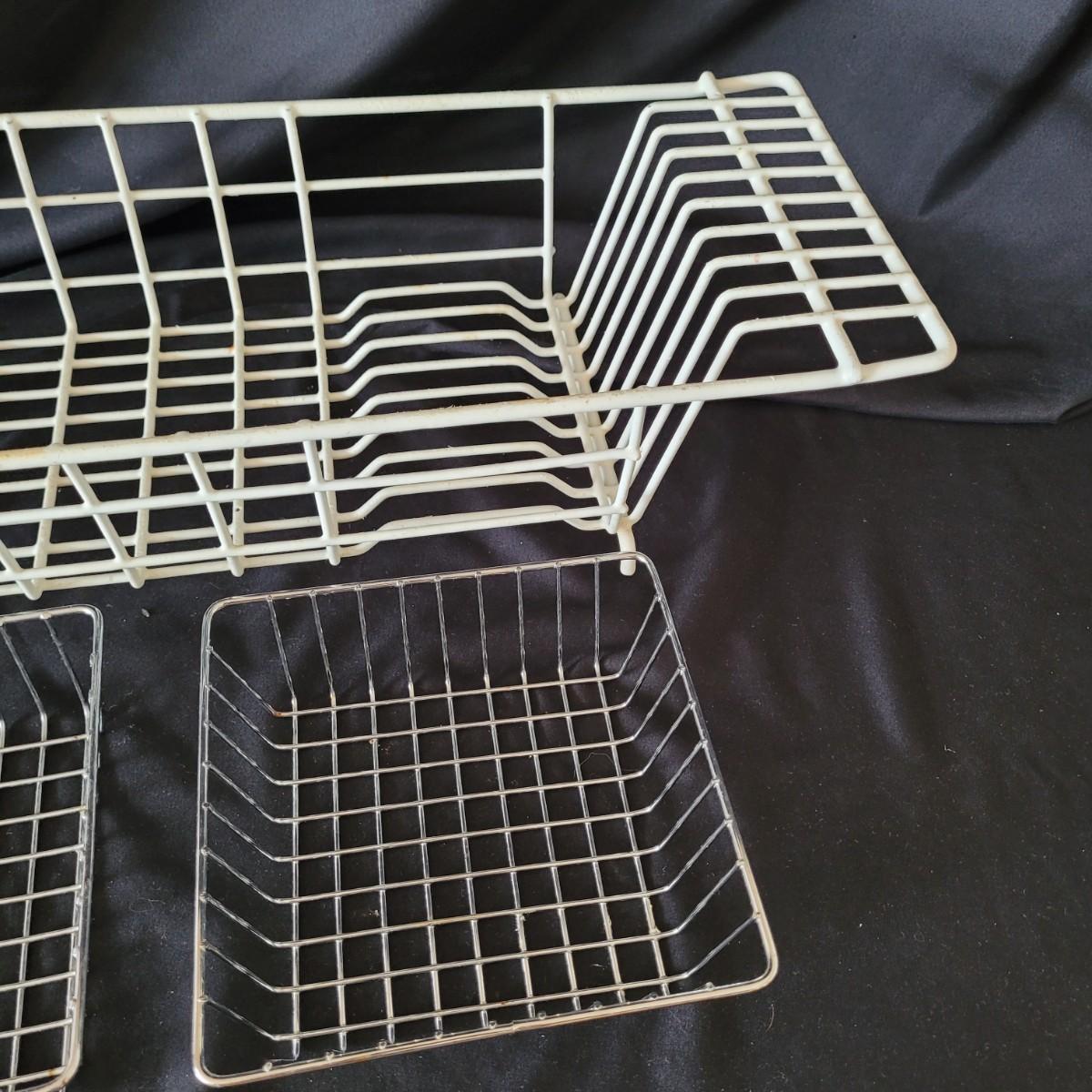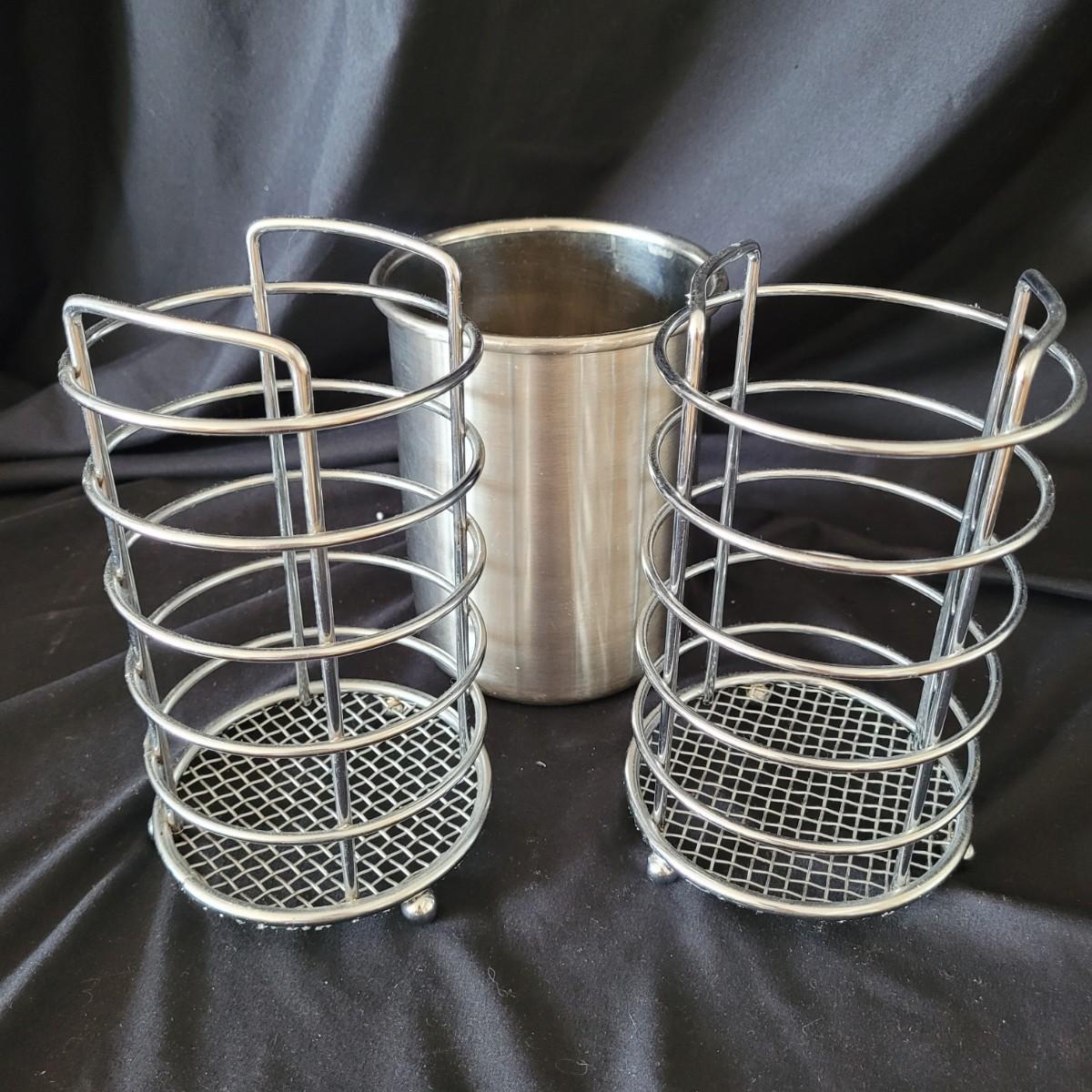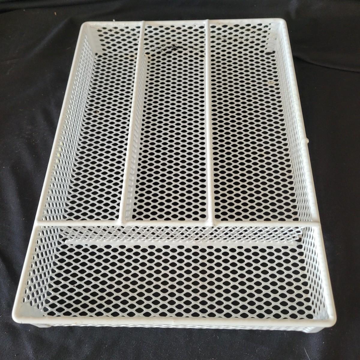 This lot includes 11 pieces of kitchen organization essentials. There are four drawer organizers, three standing utensil organizers, three mesh baskets, and a paper towel holder. All items are made from metal. For reference, the drawer organizers measure 10" x 14.5" x 2.5"H.