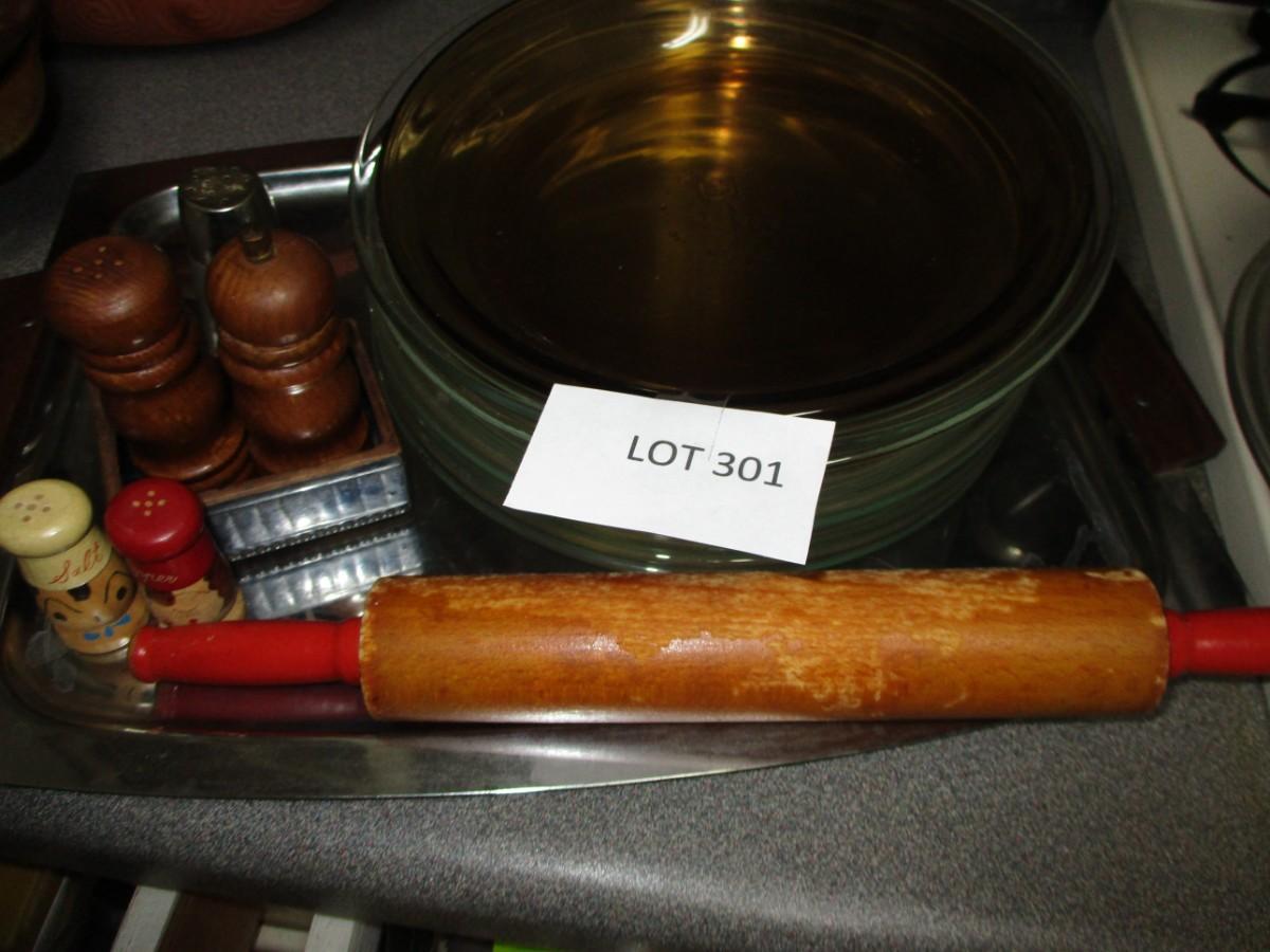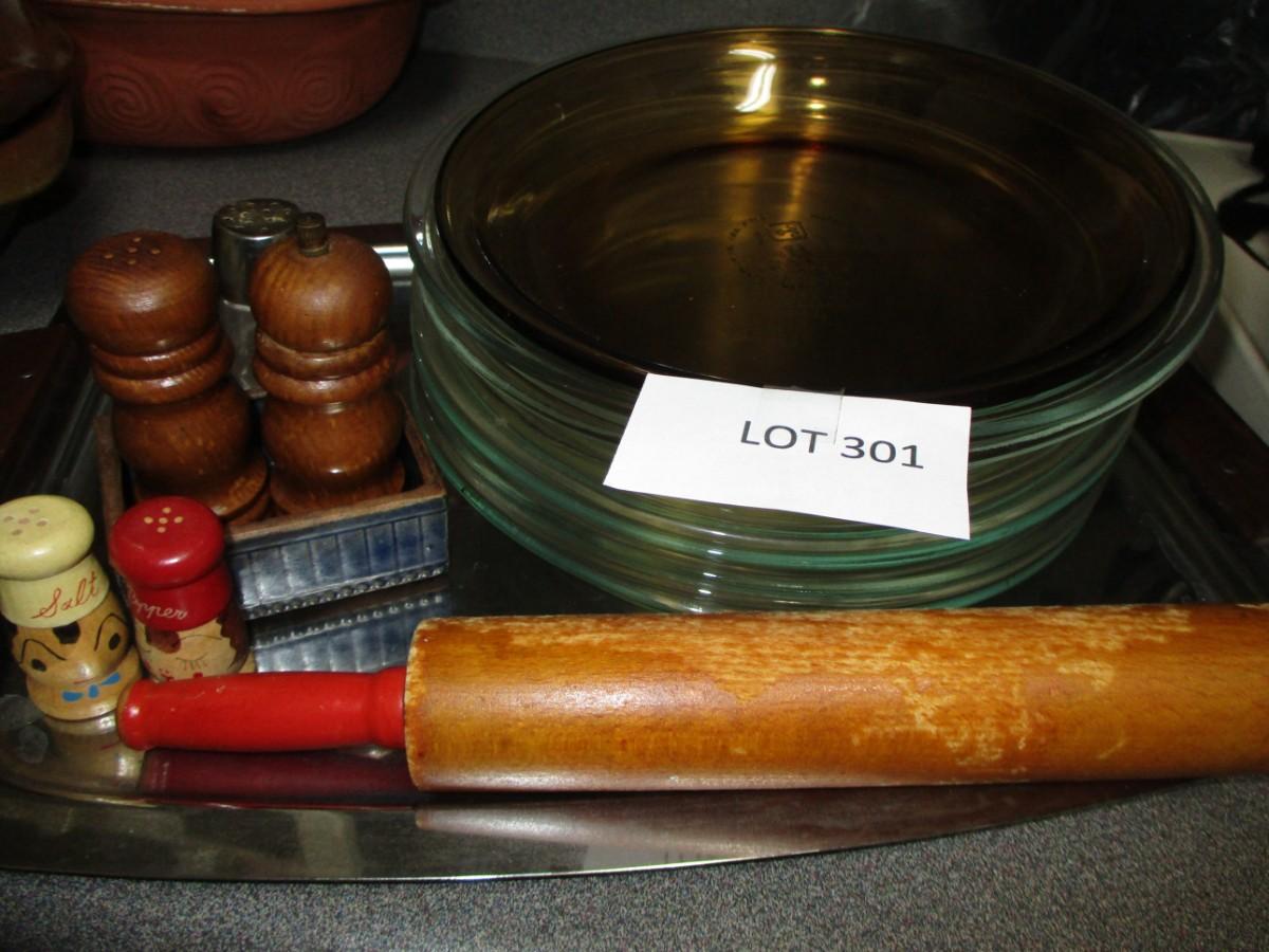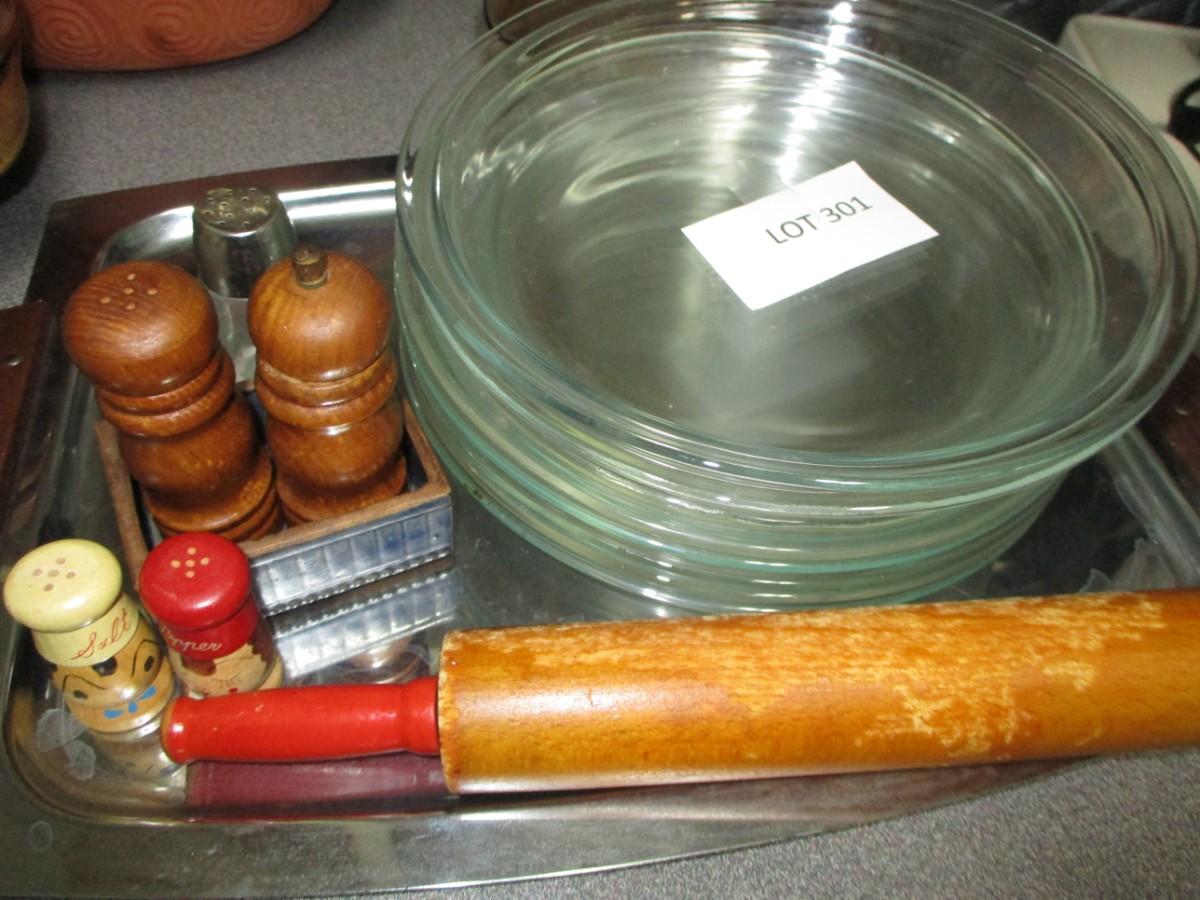 9 glass pie plates=great condition. Wooden rolling Pin. Wooden Salt & Pepper Shaker. Vintage Metal Tray