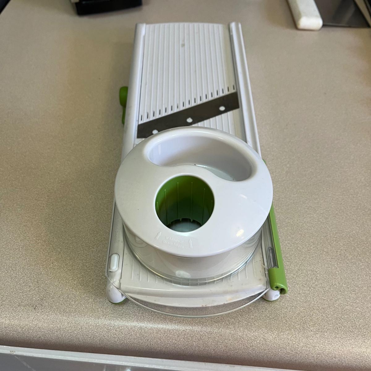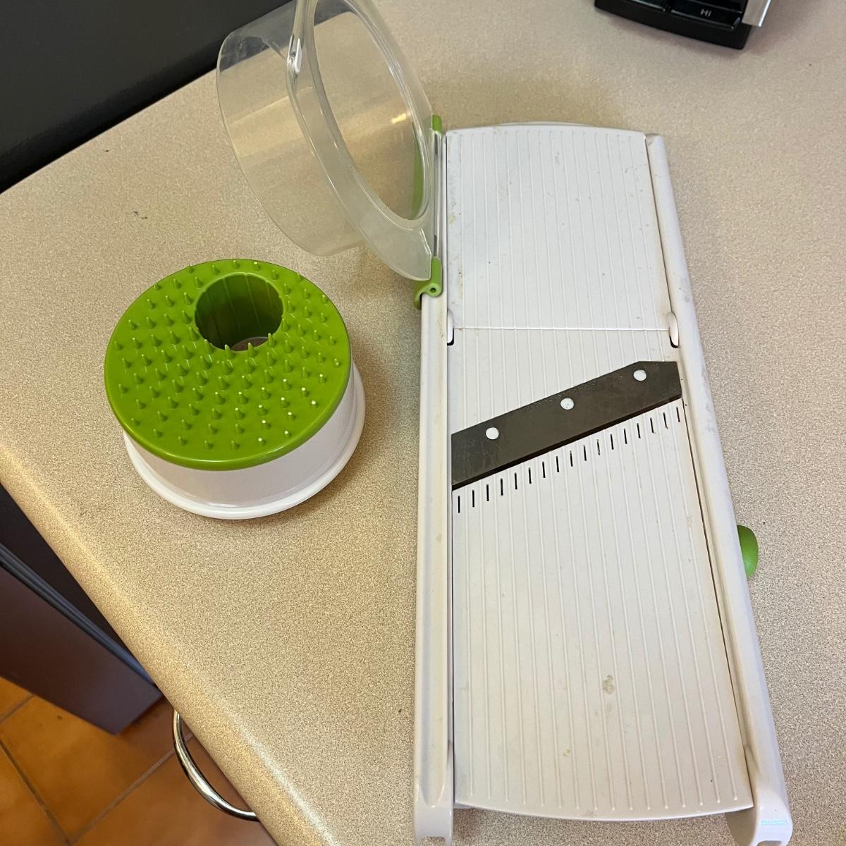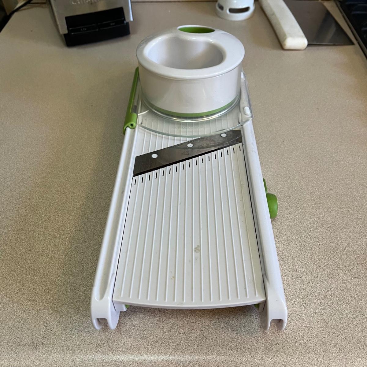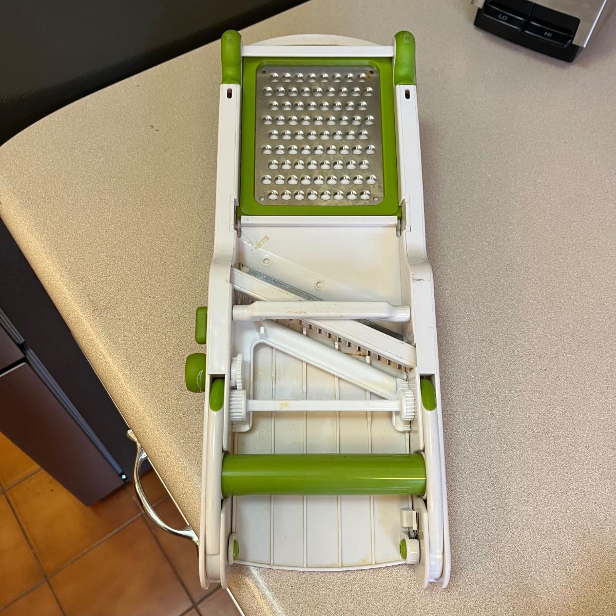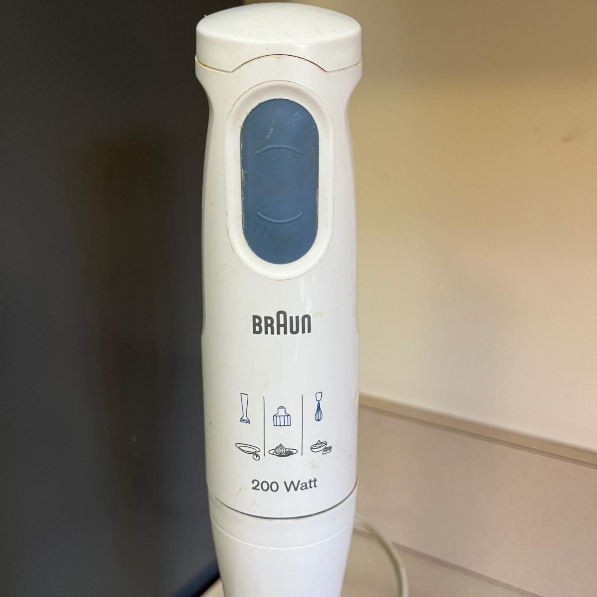 This grouping contains four small kitchen tools/accessories. A Braun MultiQuick immersion blender, a Cuisinart Mini-Prep food processor (measuring 5” x 6.5” x 8.5”H), a mandolin slicer and a Mundial chopper/scraper. Both electric appliances powered up when plugged in. Immersion blender is 13”H. Shipping available.