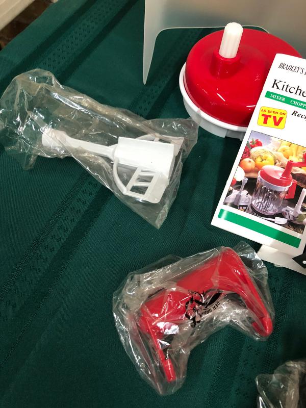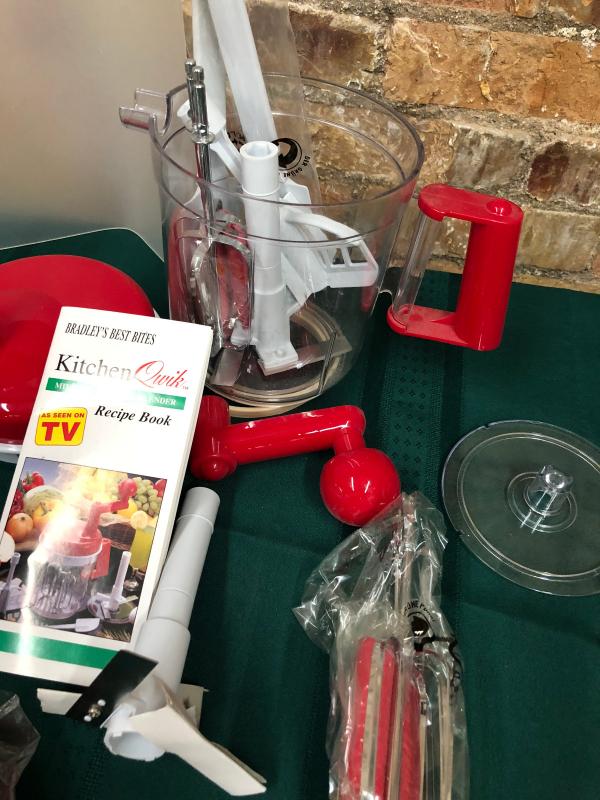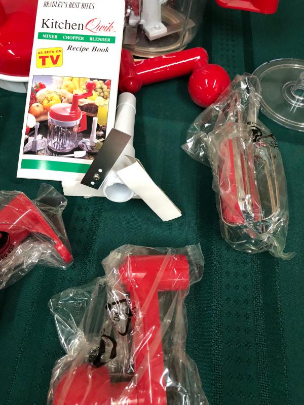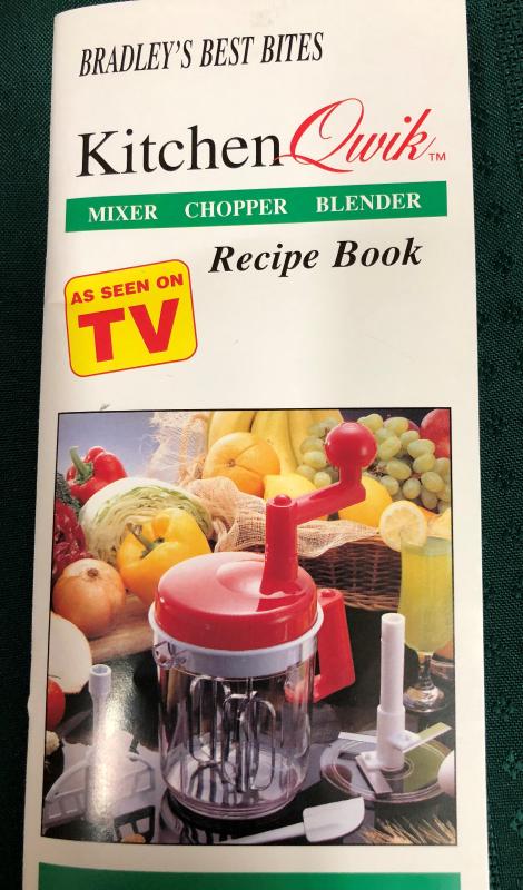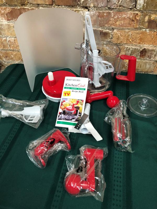 In new condition here is a Kitchen Qwik Mixer..Chopper..Blender set with all of the attachments shown...still packaged...with a recipe booklet...