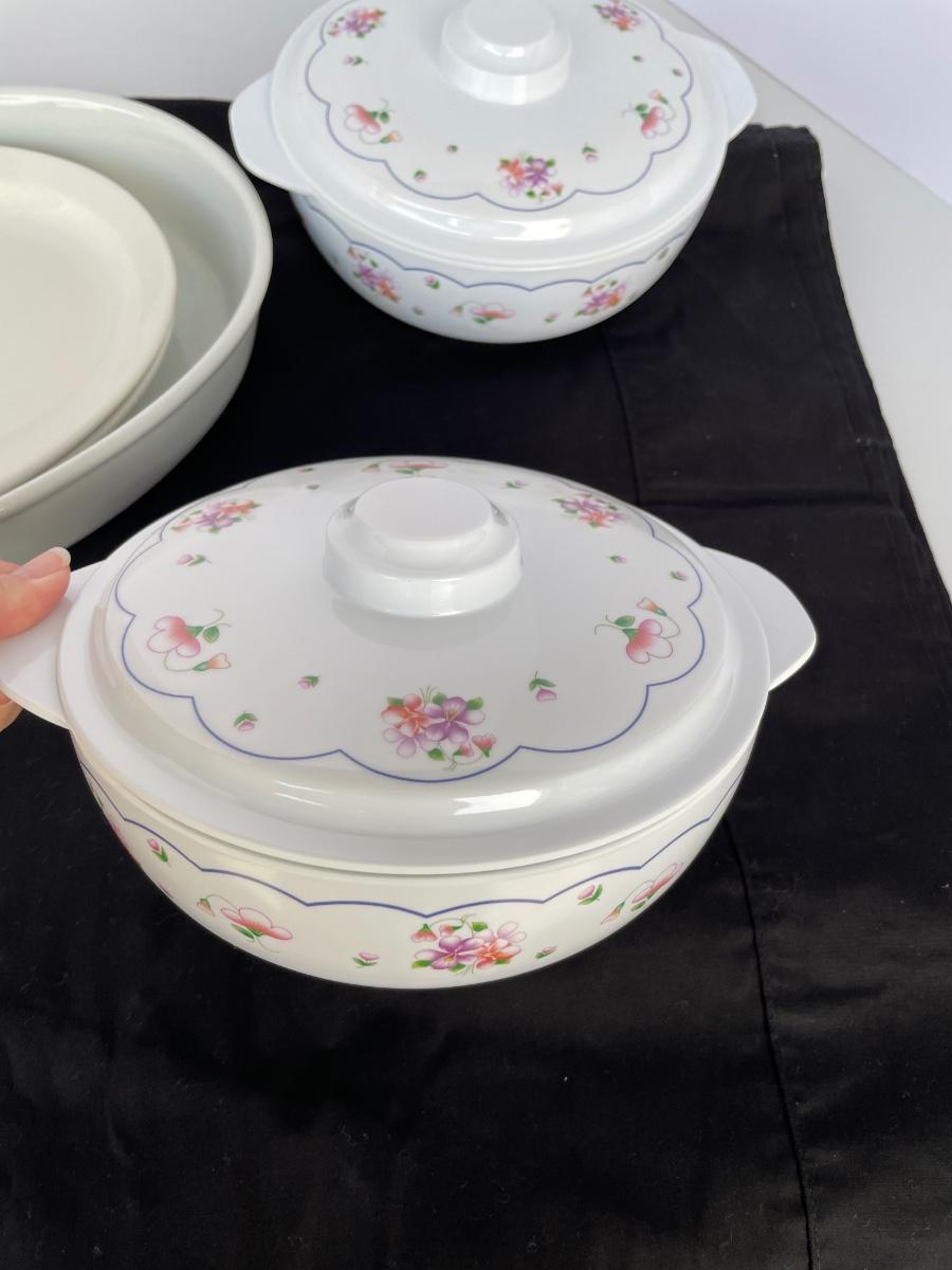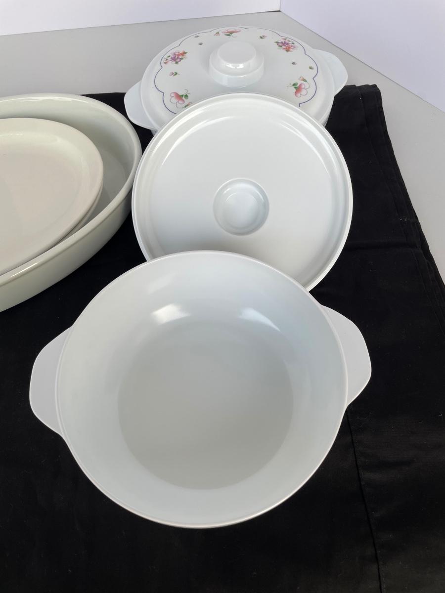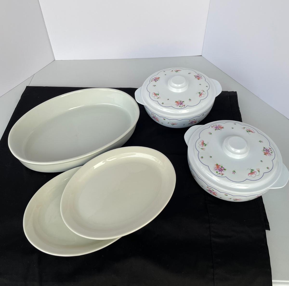 2 melamine floral serving bowls with lids, 3 white china pieces.