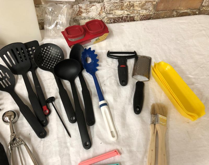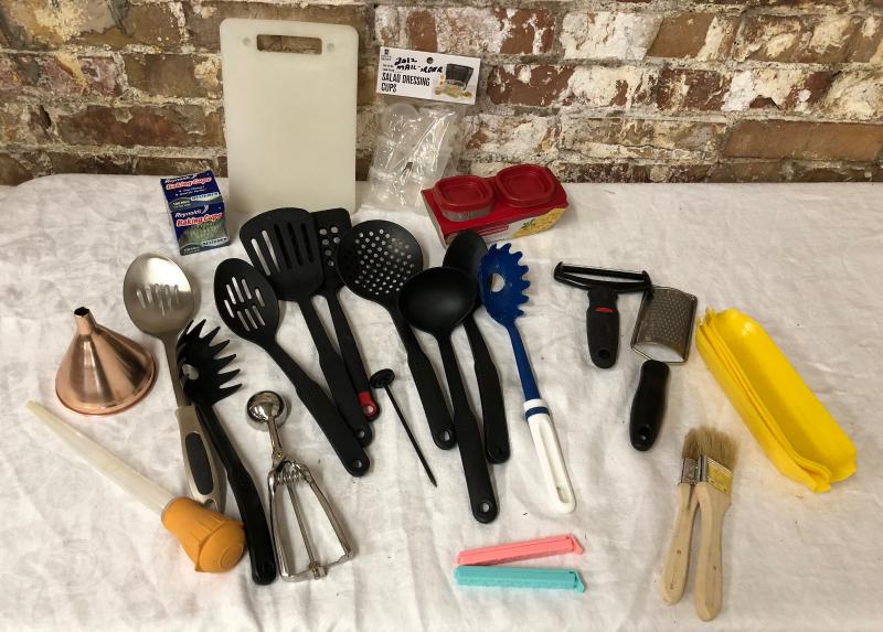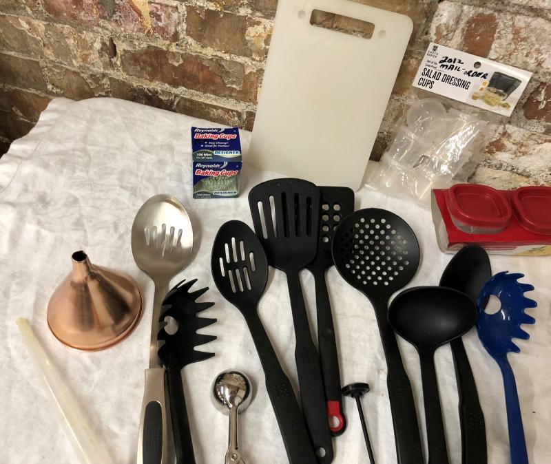 New condition on this large lot of various kitchen utensils..mostly serving ware..there is a baster..corn trays..melon baller..funnel..cutting board..etc...as shown...