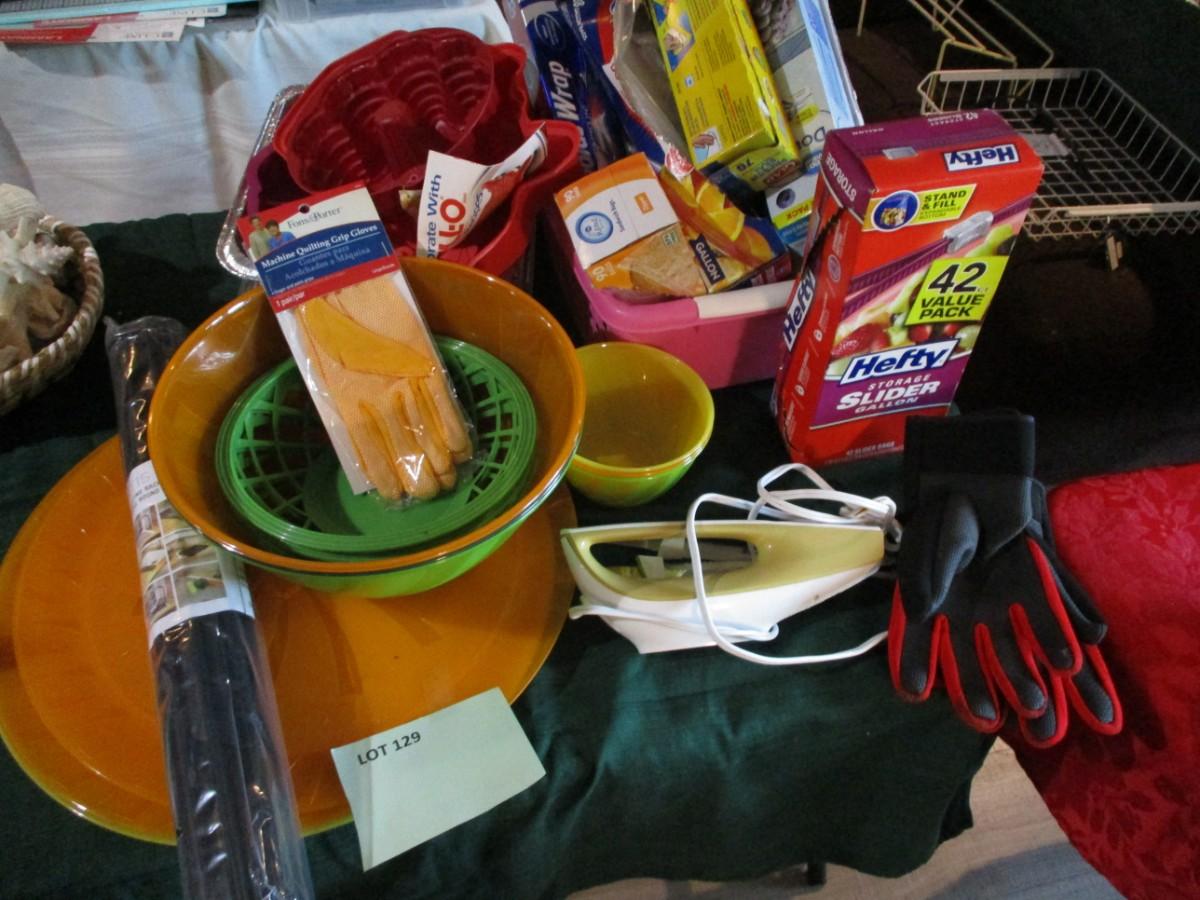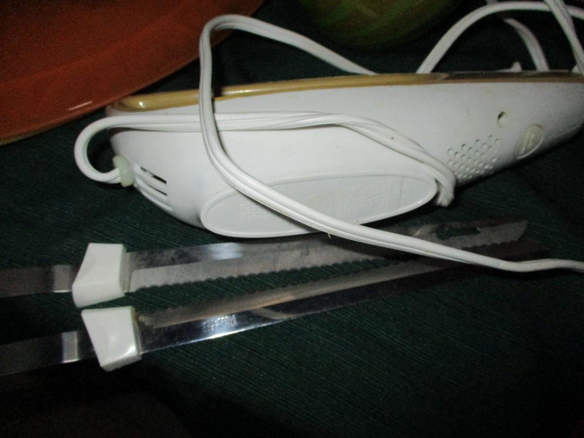 Plastic bowls, platters, tin pans, electric knife, food coverings