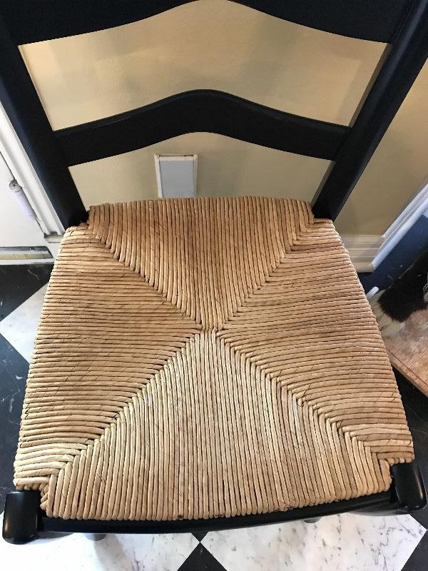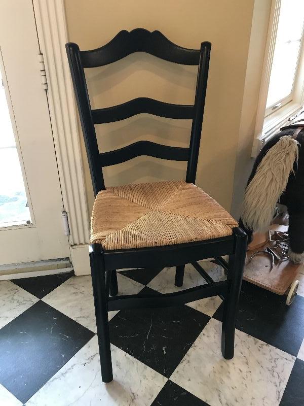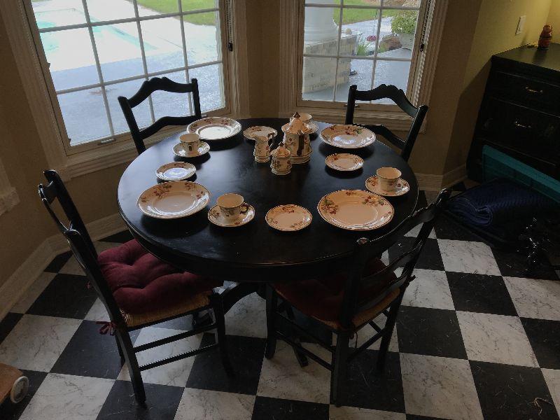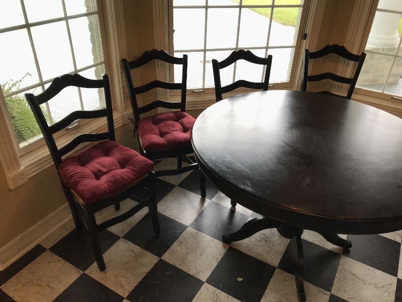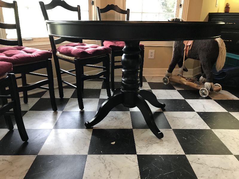 Great sturdy table with 4 matching chairs. 48" Round Black Round Table. Chairs have rush seats - all in very good condition. Note the picture of table top show a little wear, nothing is abusive. If you are looking for a nice pedestal table ... look no further .... start bidding.