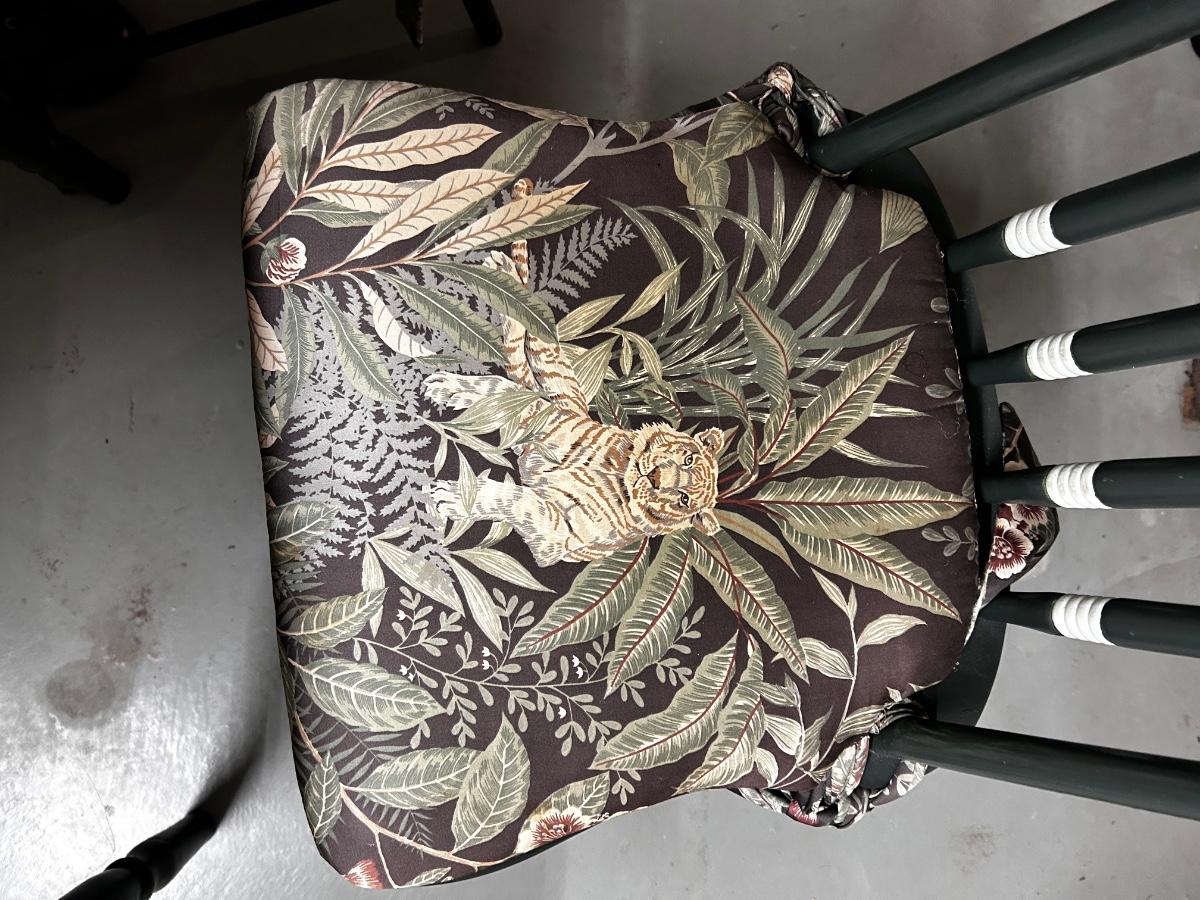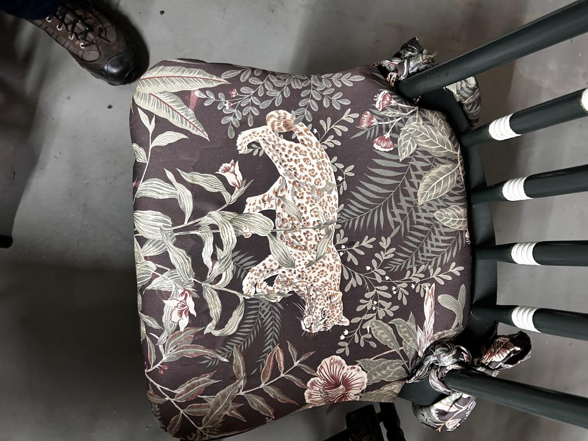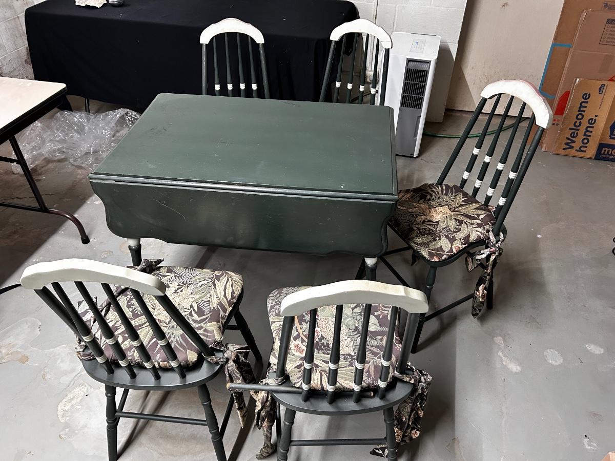 Kitchen table, 5 chairs, cushions. Painted green. 36" x 41" with both leaves extended.