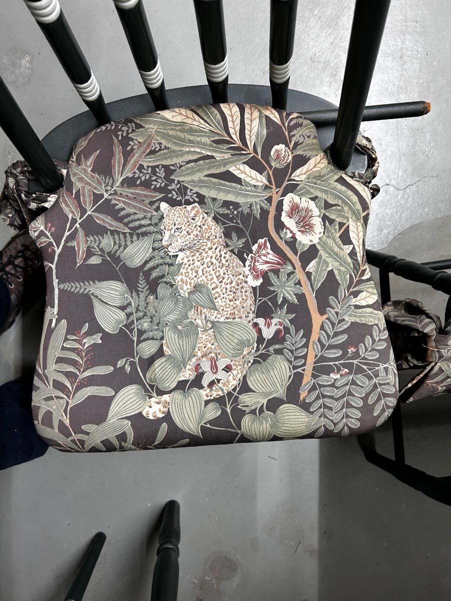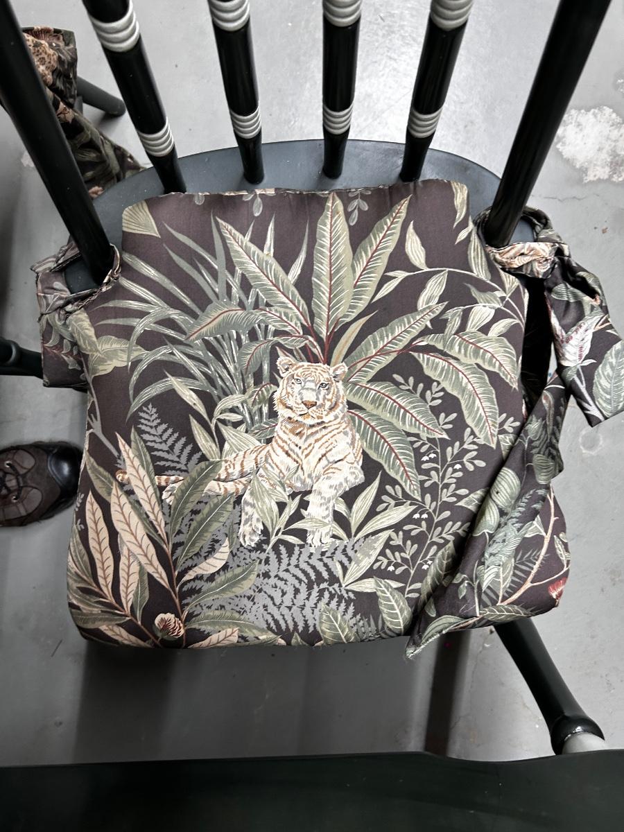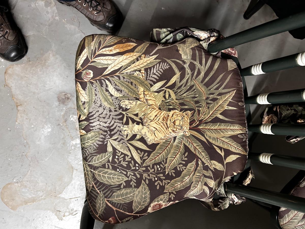 Kitchen table, 5 chairs, cushions. Painted green. 36" x 41" with both leaves extended.
