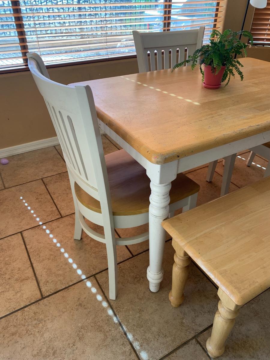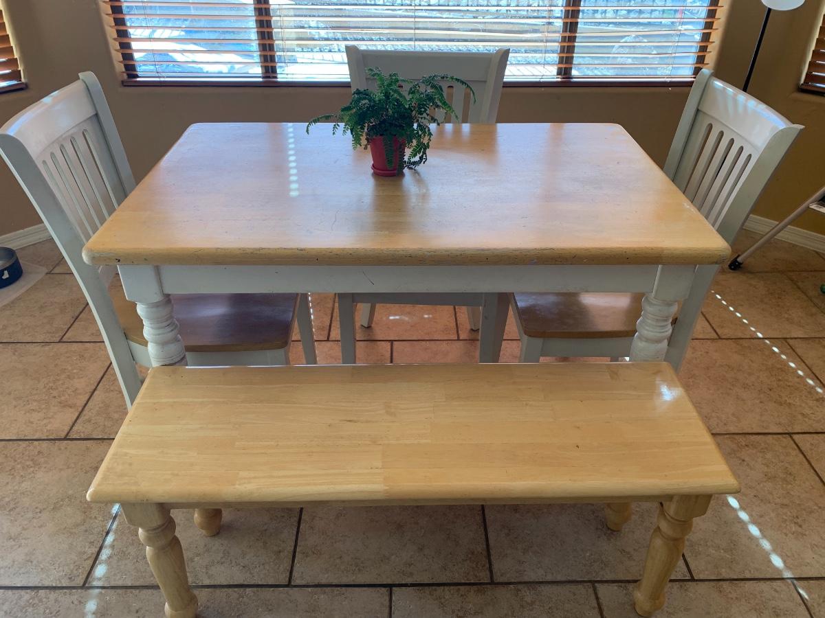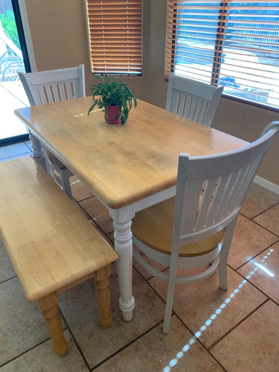 Kitchen table with 4 chairs and a bench (one chair not pictured) in fair condition with some obvious damage to the table top and scratches on the legs