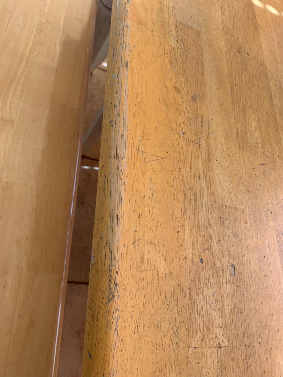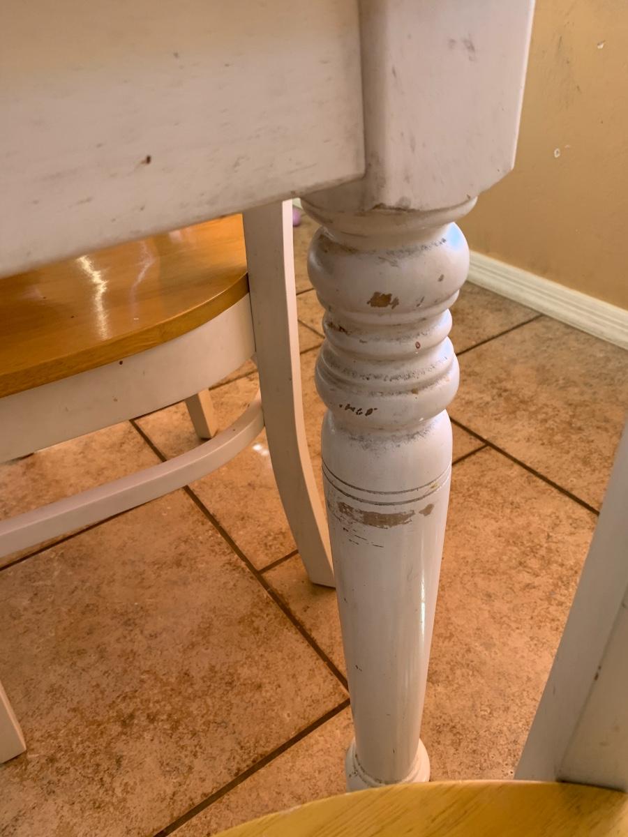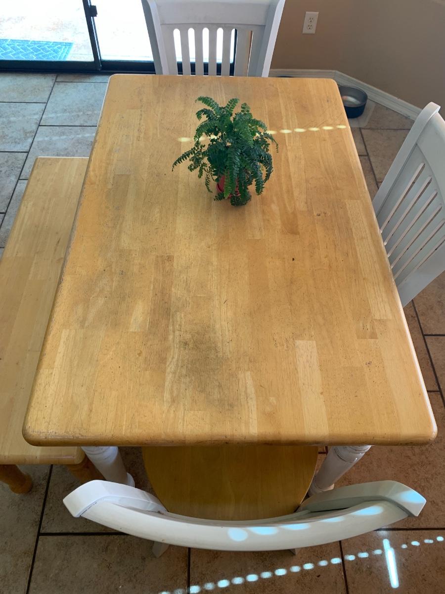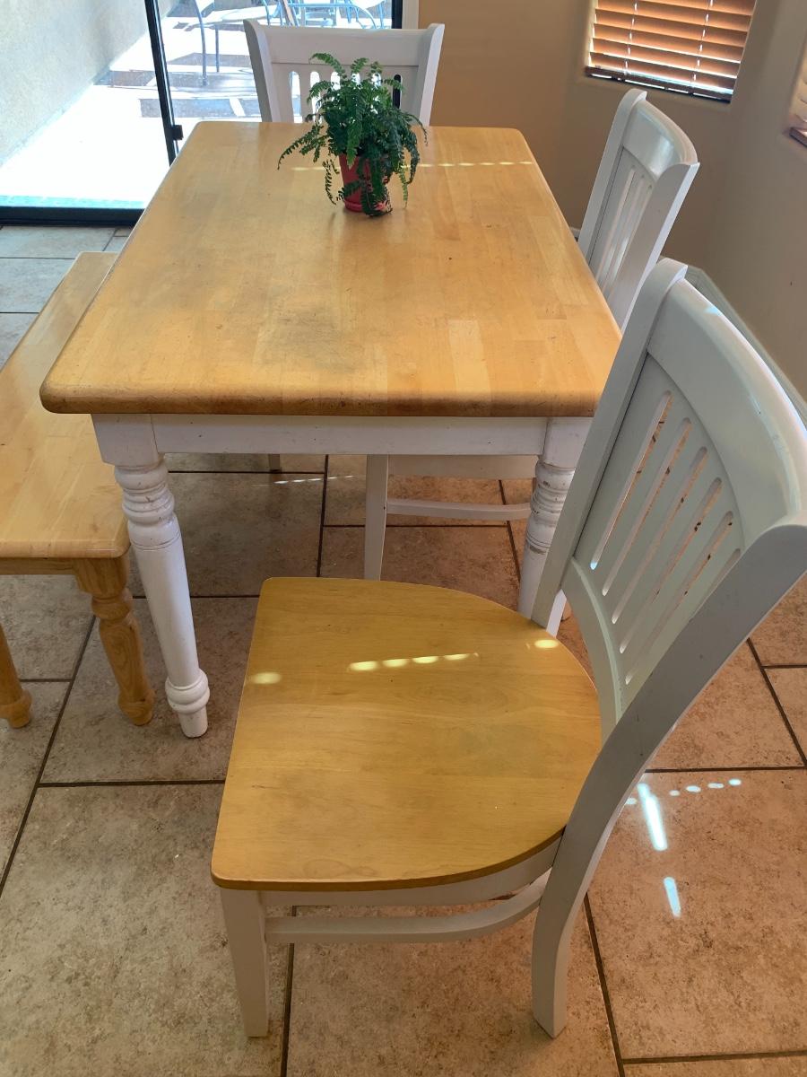 Kitchen table with 4 chairs and a bench (one chair not pictured) in fair condition with some obvious damage to the table top and scratches on the legs