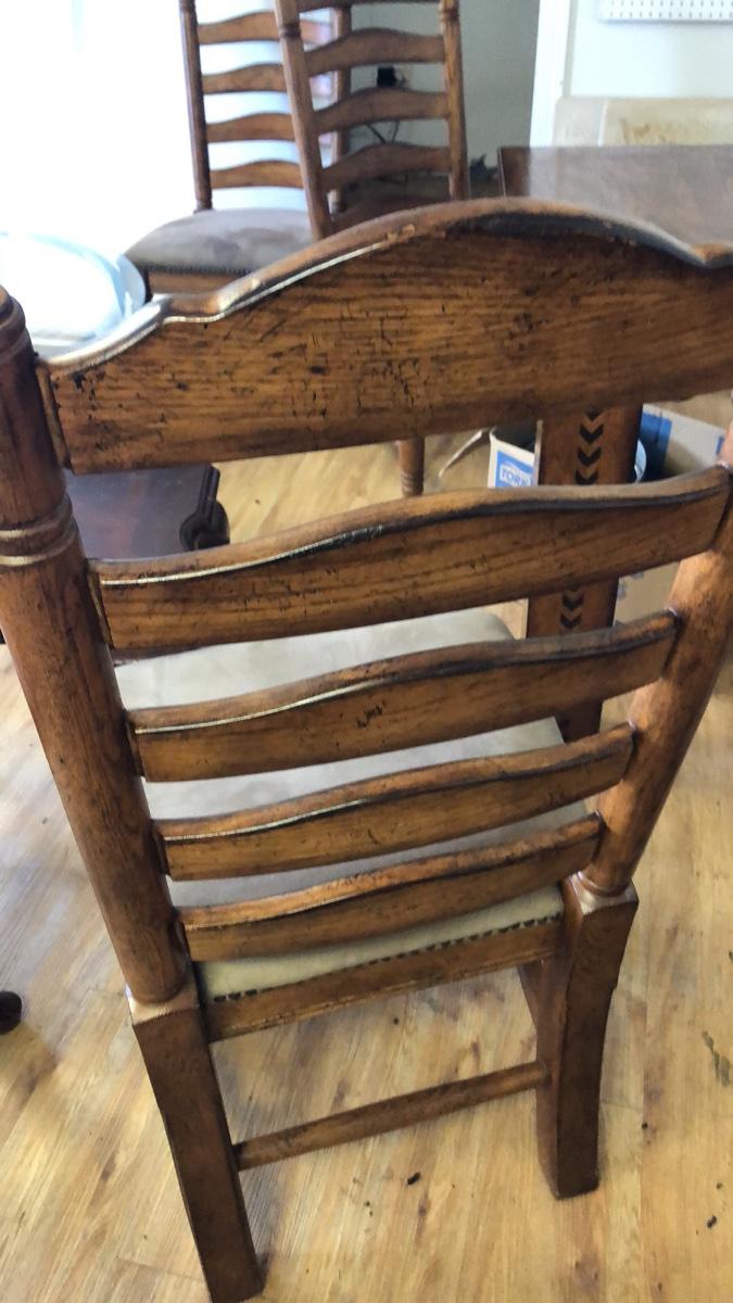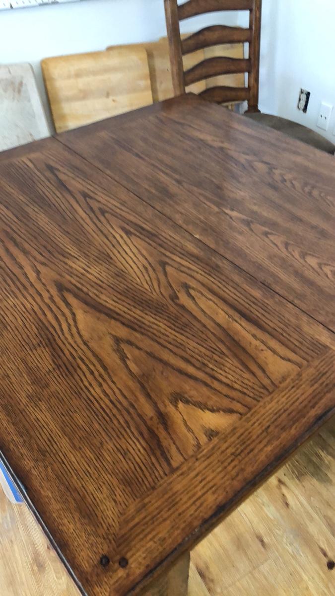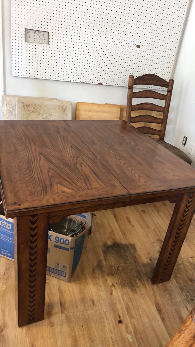 This is a gorgeous design. Plain on top and then painted on legs. Table measures 42 x 42 and has two pull out underneath leaves measuring 18” each. Comes with 4 beautiful solid wood chairs measuring 42” high with seat 18” off ground