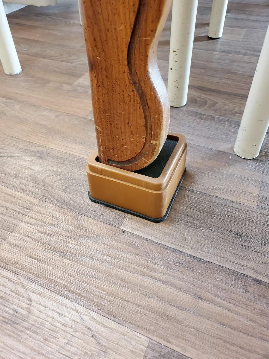 Shown here atop 2 1/2 inch lifters (put in place to accommodate a wheelchair). Lifts right off of lifters. One chair has a back that needs to be remounted with a new screw. Also shown with red tablecloth that is included.