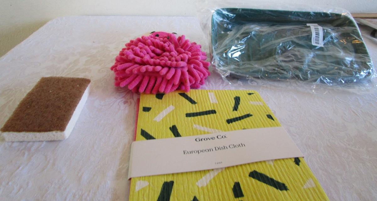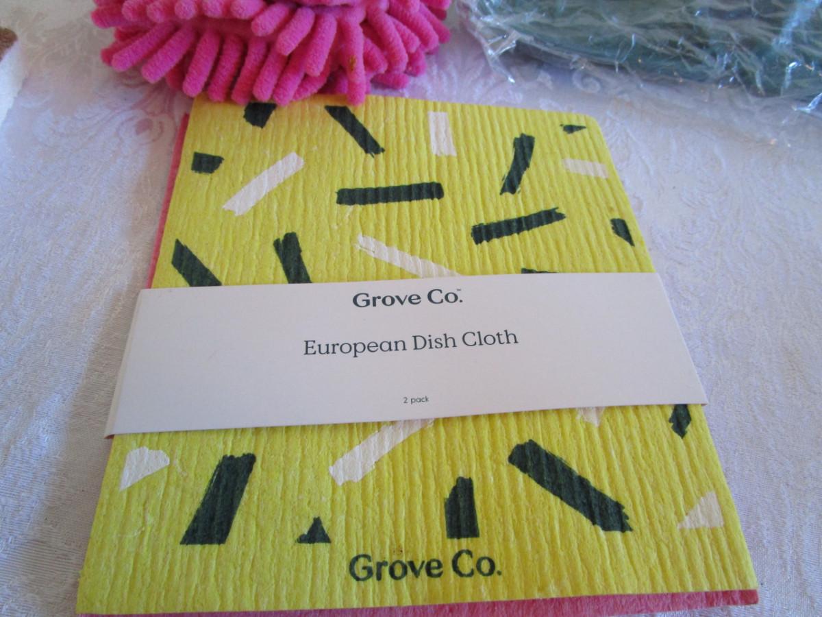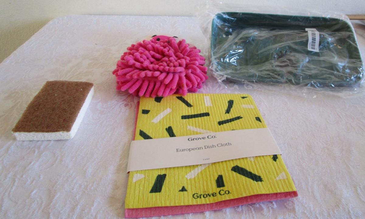 Grove Co. European dish cloths 2 pk, new scrubber sponge, Piggy duster, faucet storage rack