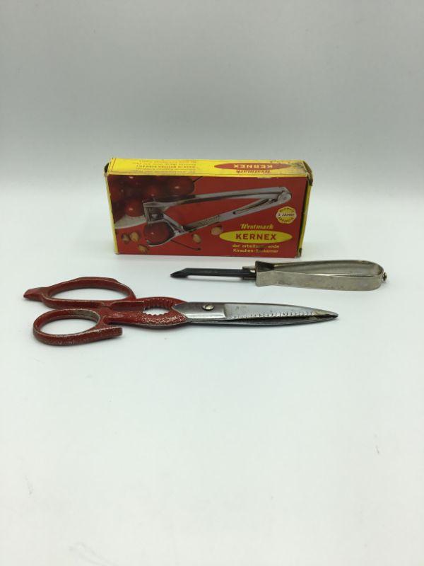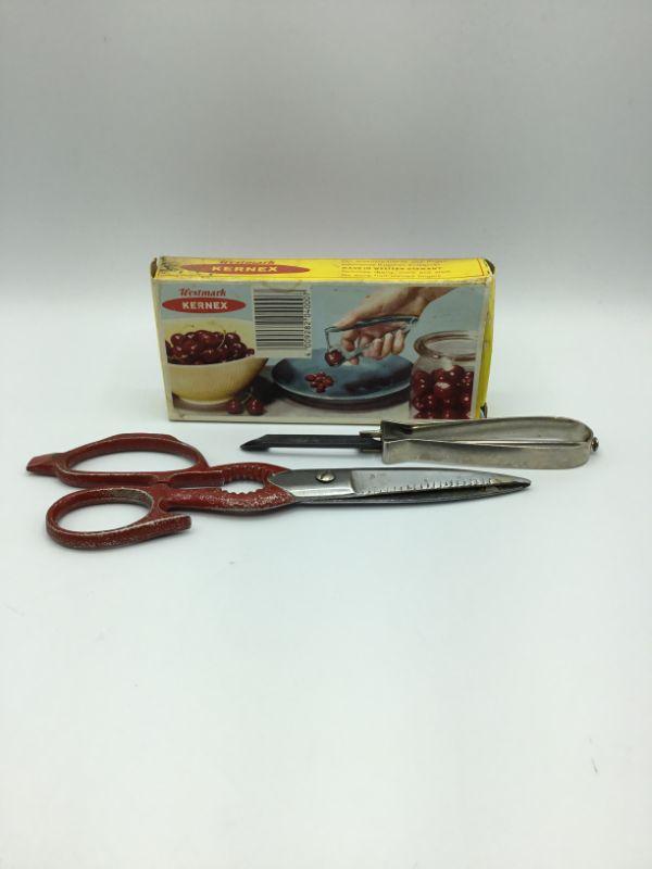 Vintage kitchen hand tools. Heavy duty shears, peeler, and cherry pitter.