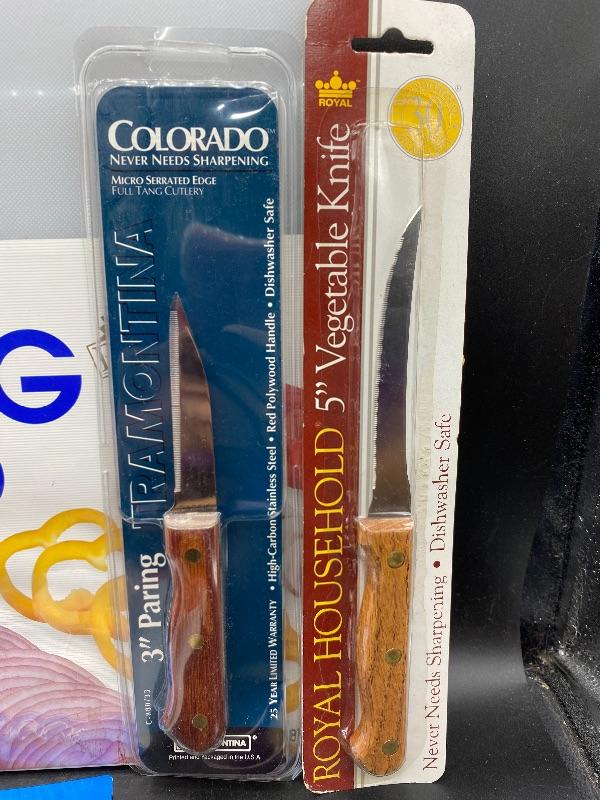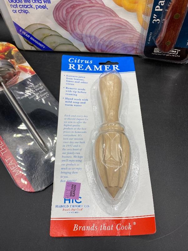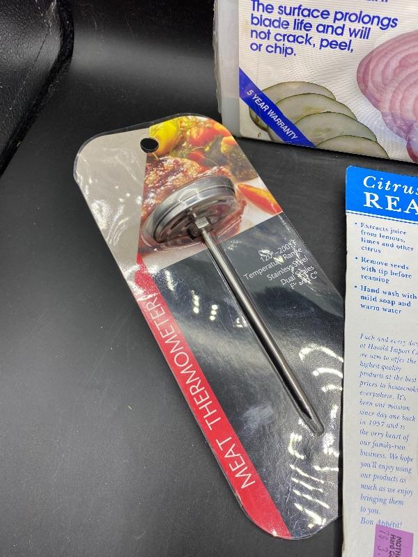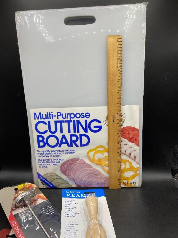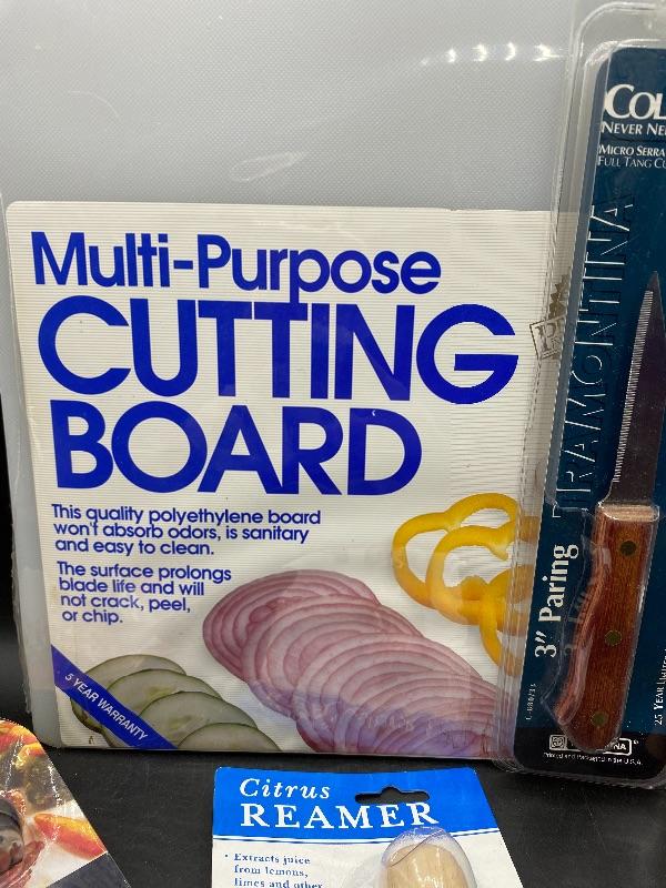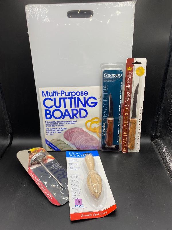 Lot of useful kitchen tools. A 15"+ cutting board, a couple sharp knives, a meat thermometer, and citrus reamer. Everything is new in the package.