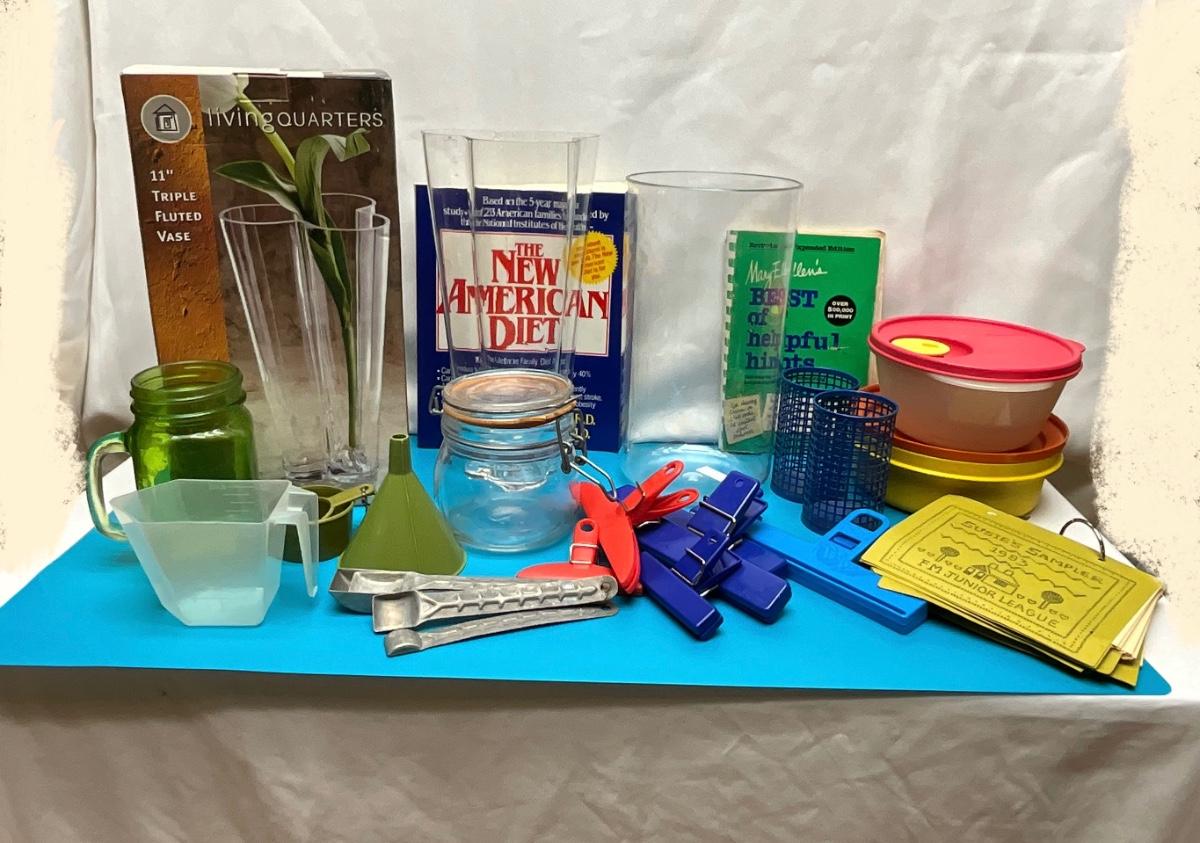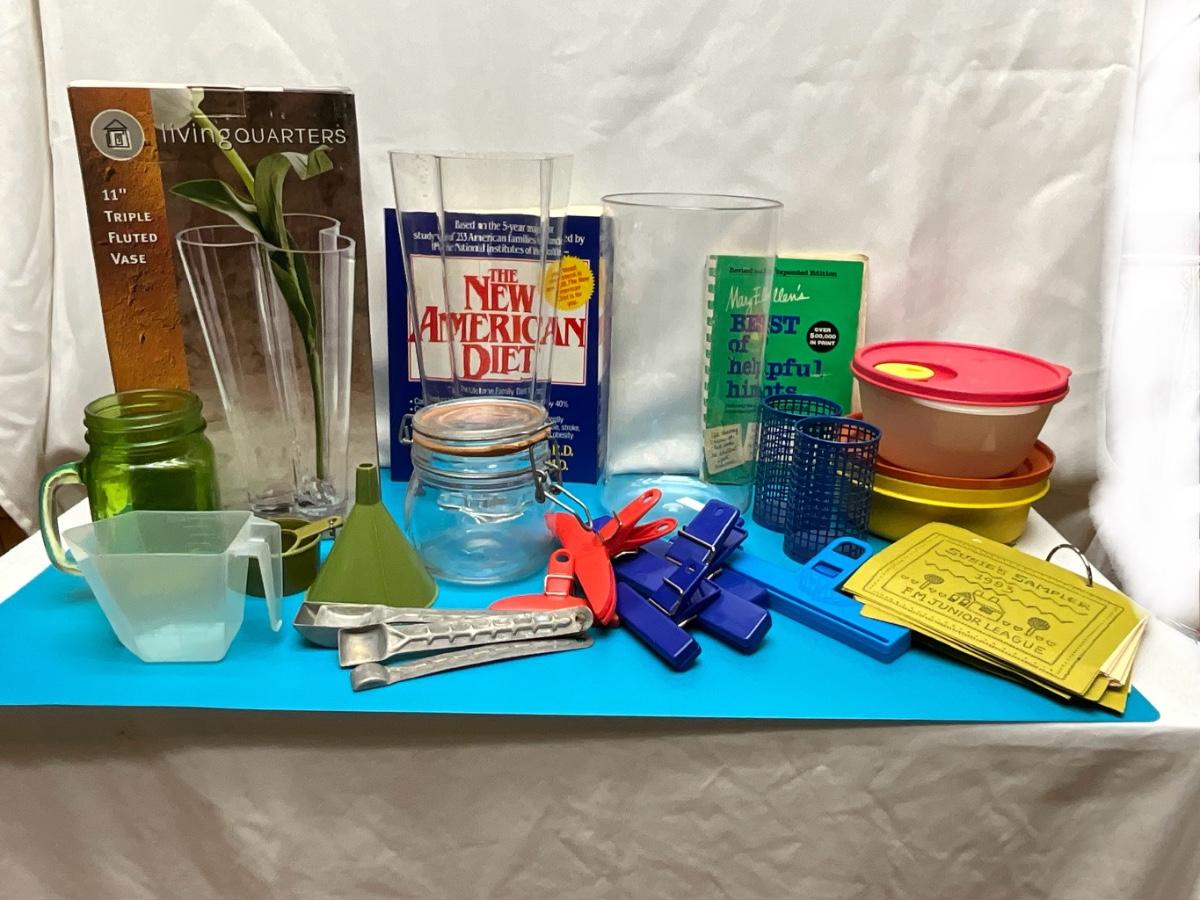 Plastics..Kitchen tools, vases, cookbooks