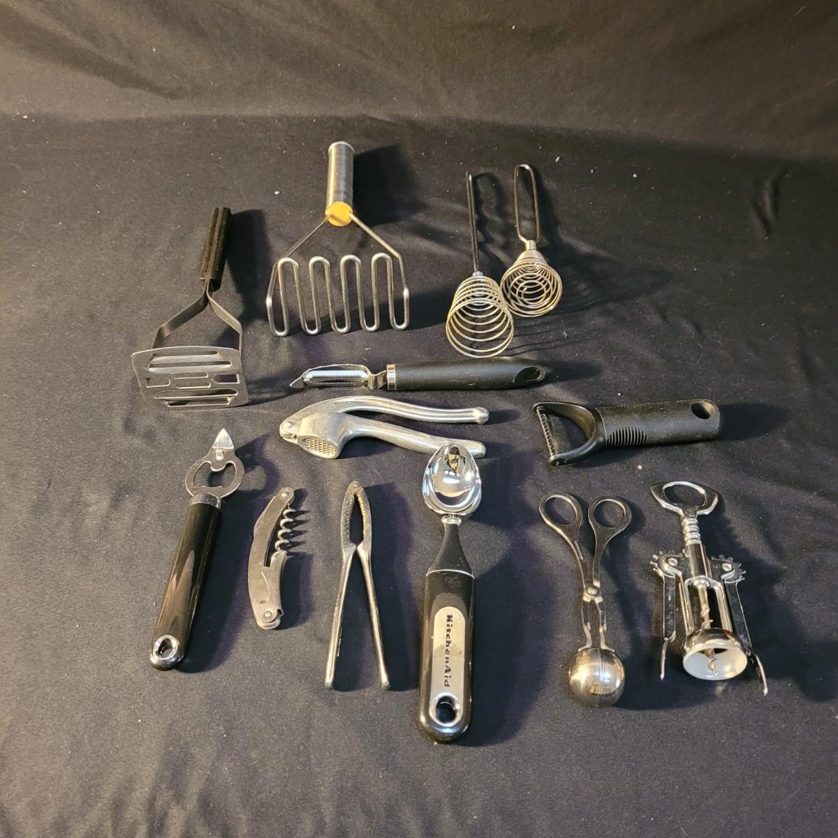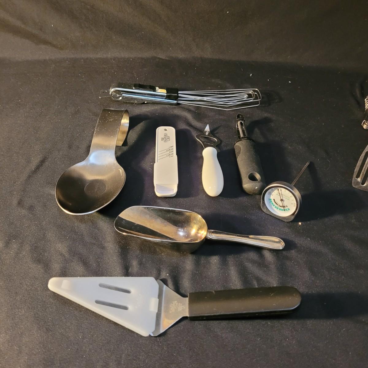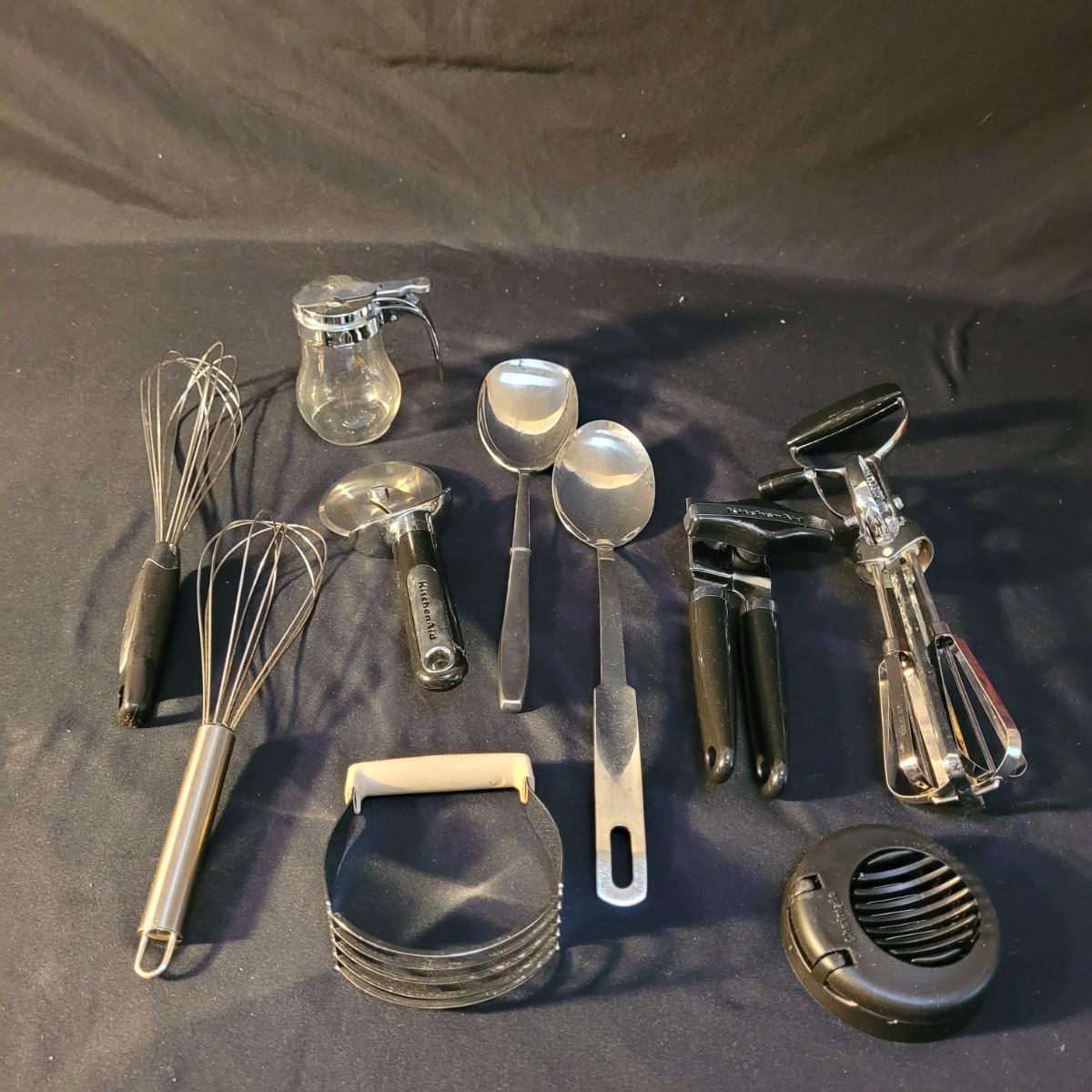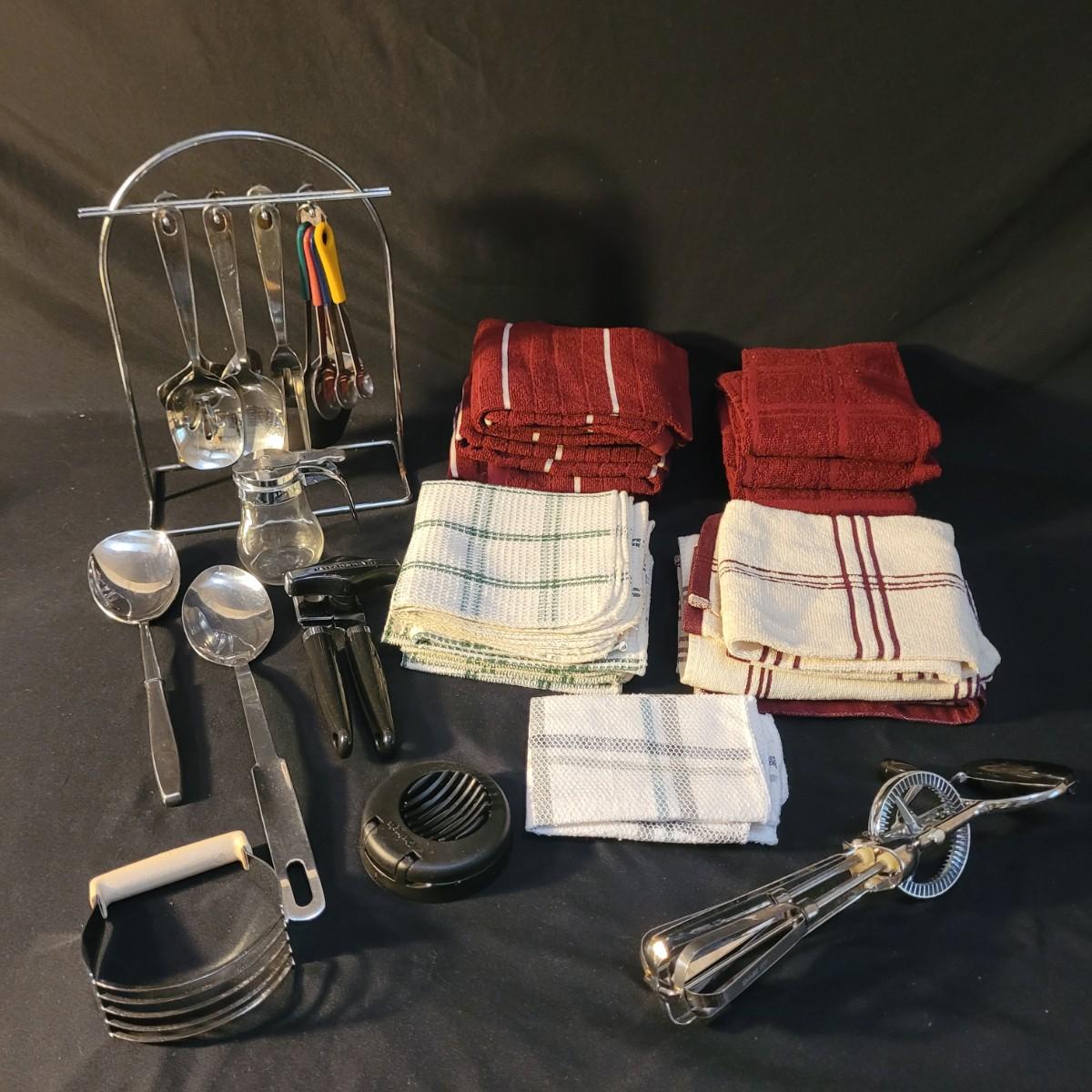 This useful lot of kitchen items includes new towels and dish rags, serving spoons, whisks, can openers, peelers, and much, more. Please see photos for details. Shipping available.