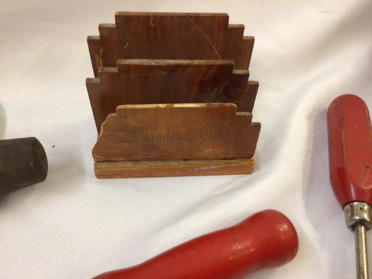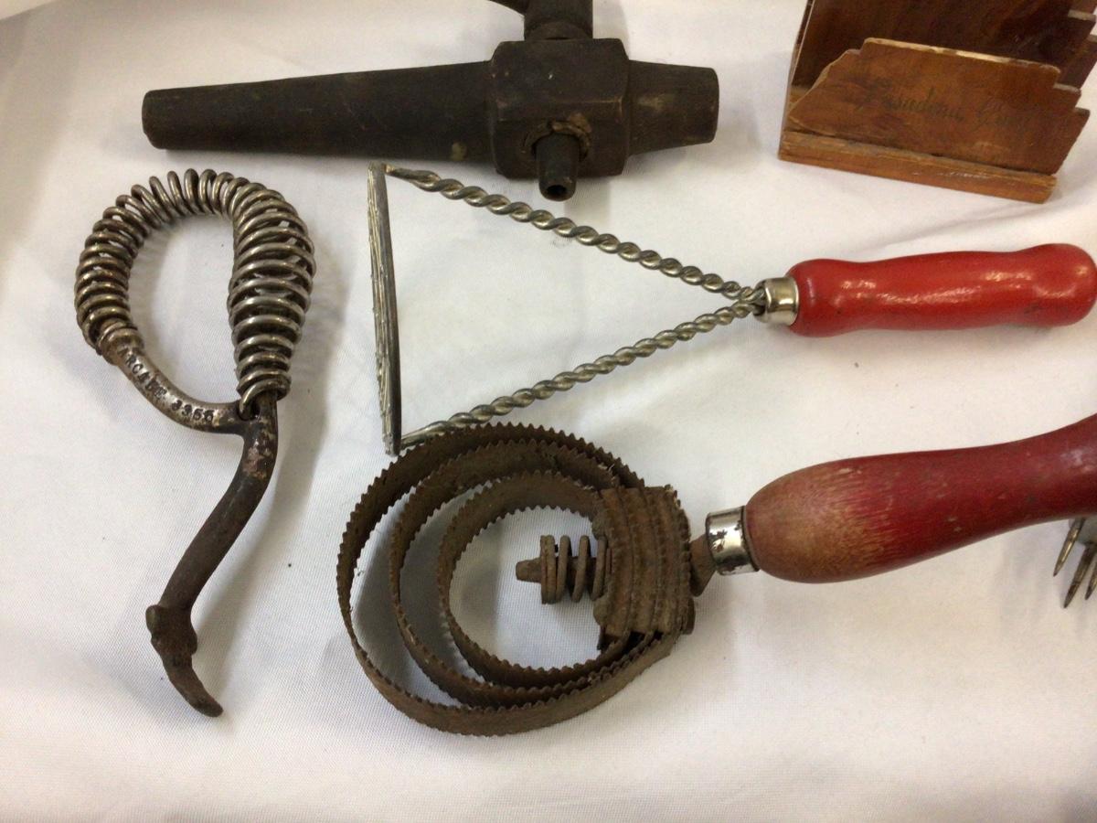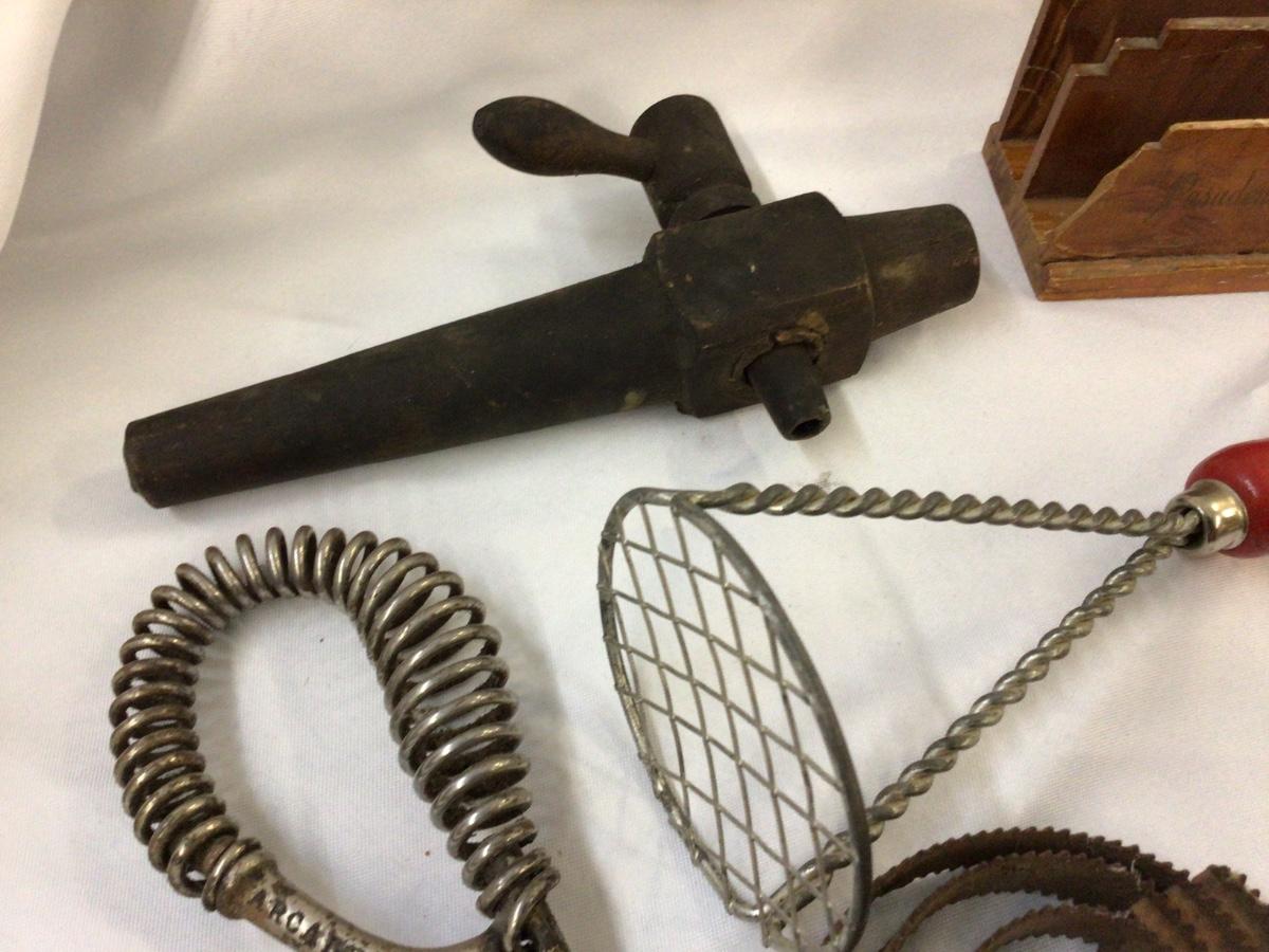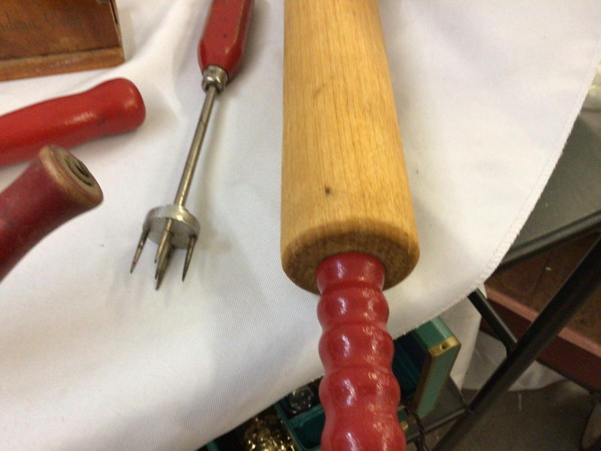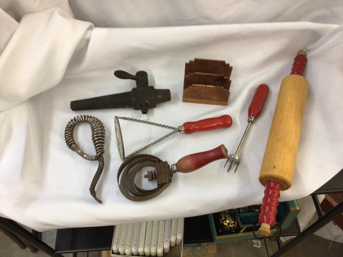 You get rolling pins masher, cutter pick, wood napkin holder, barrel spicket metal stove lid handle.