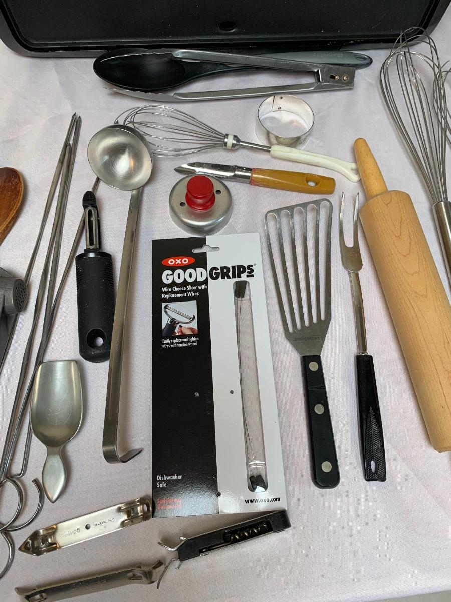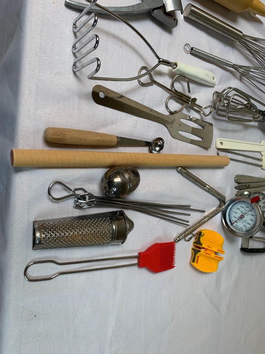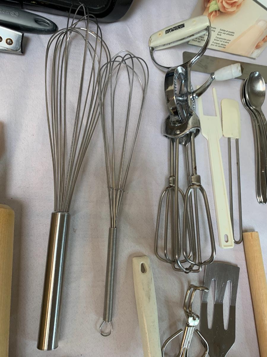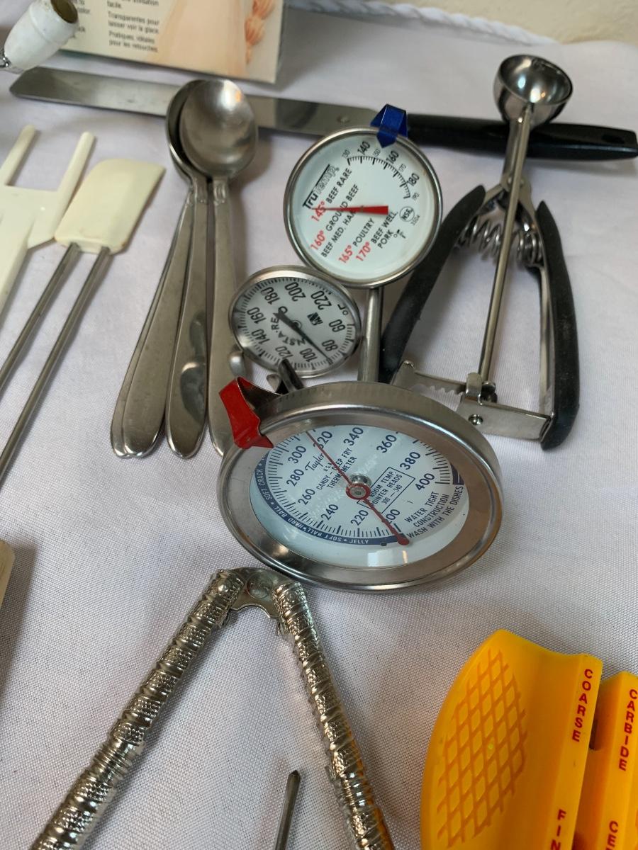 Includes a Presto electric griddle, pastry bags, thermometers, wicks, mashers, rolling pin, fish spatula, corn holders, nutmeg grater, vintage wood handle peeler, Kaplan Aronson hand beater and more!