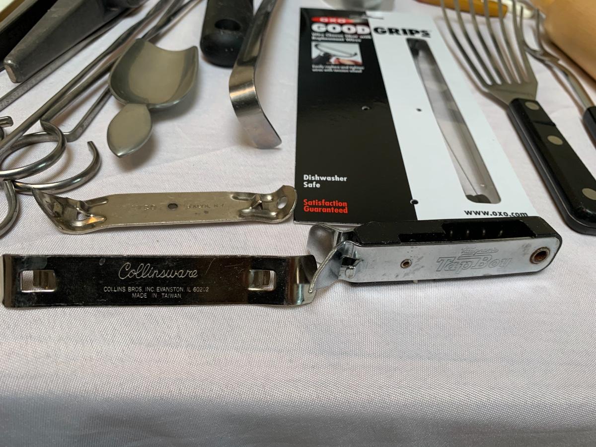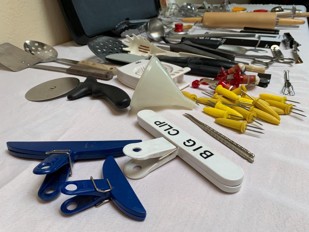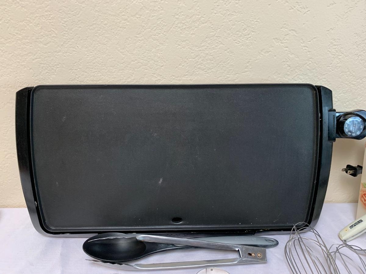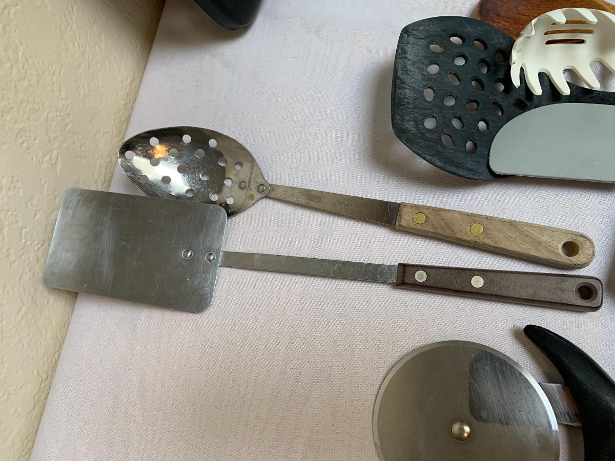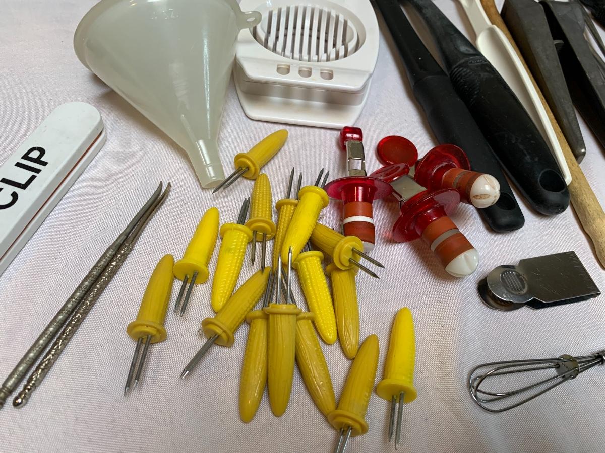 Includes a Presto electric griddle, pastry bags, thermometers, wicks, mashers, rolling pin, fish spatula, corn holders, nutmeg grater, vintage wood handle peeler, Kaplan Aronson hand beater and more!
