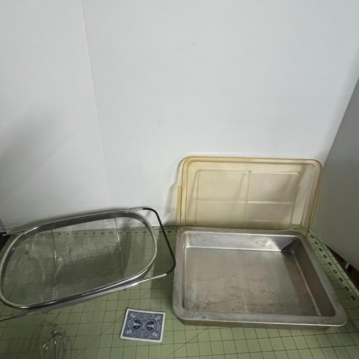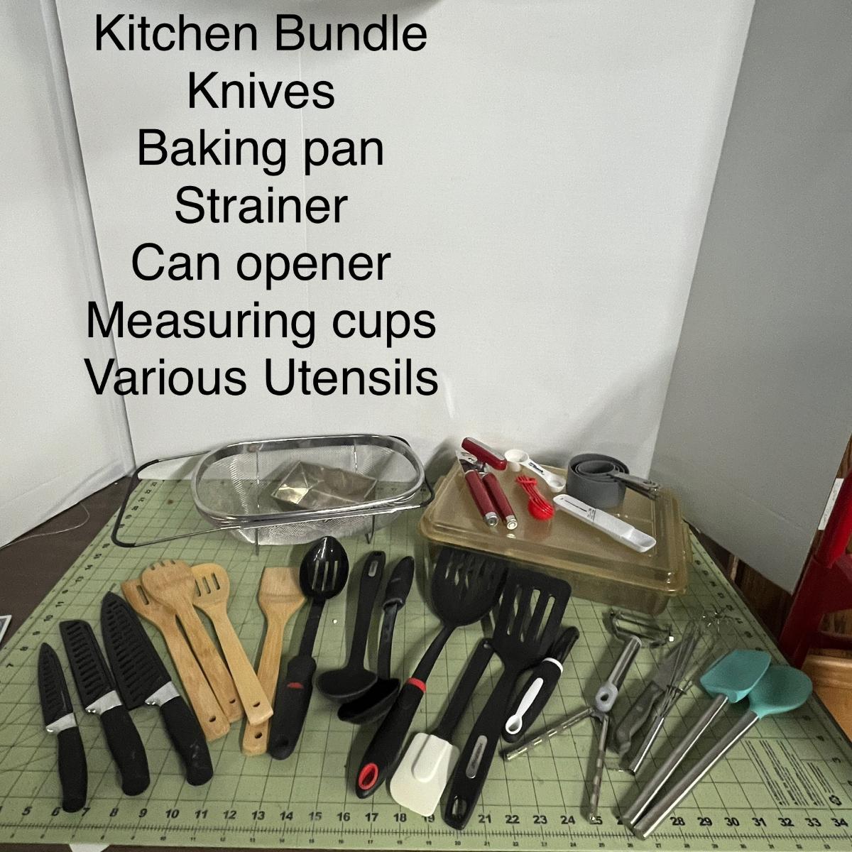 Includes knives, baking pan, strainer, opener, measuring cups, and Various utensils.