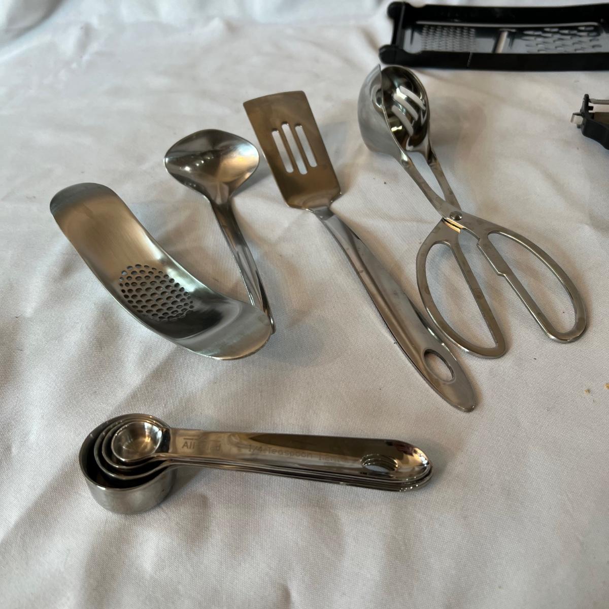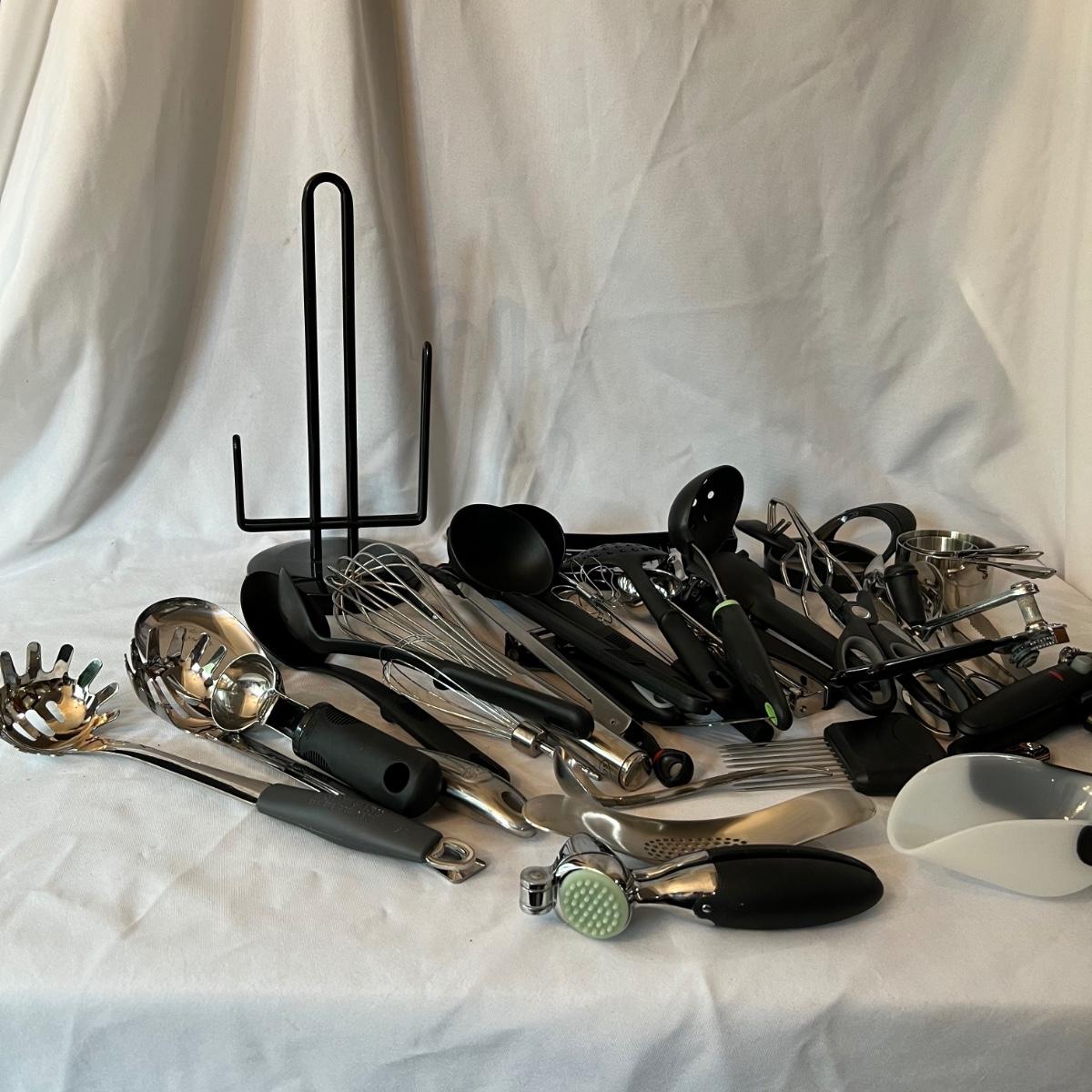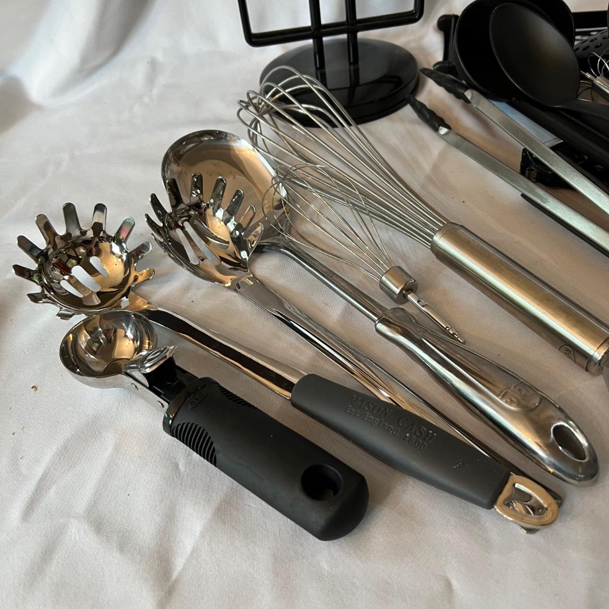 A large assortment of kitchen utensils to cover most of your cooking needs. Majority are stainless steel; paper towel holder is black plastic.