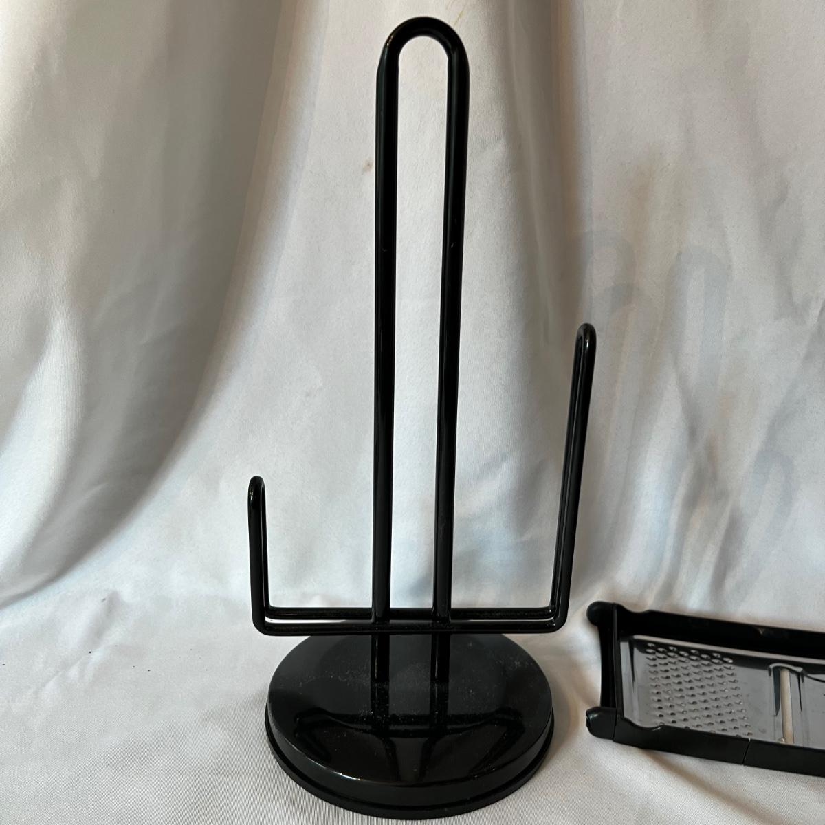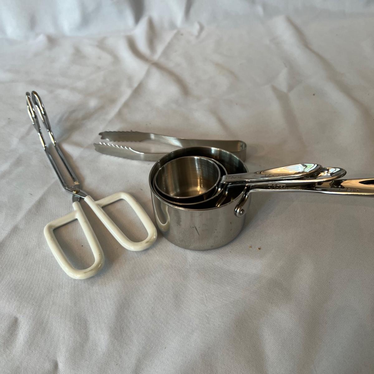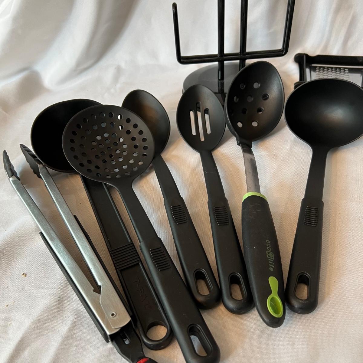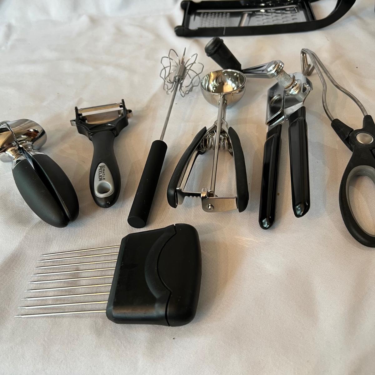 A large assortment of kitchen utensils to cover most of your cooking needs. Majority are stainless steel; paper towel holder is black plastic.