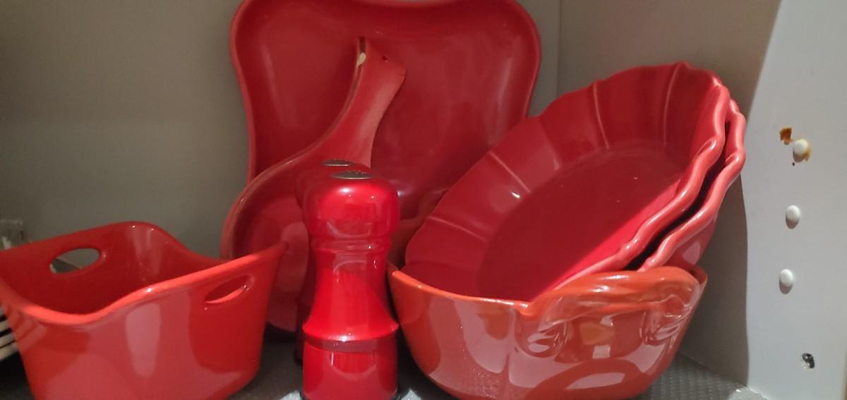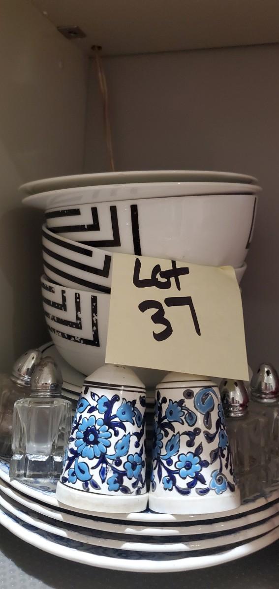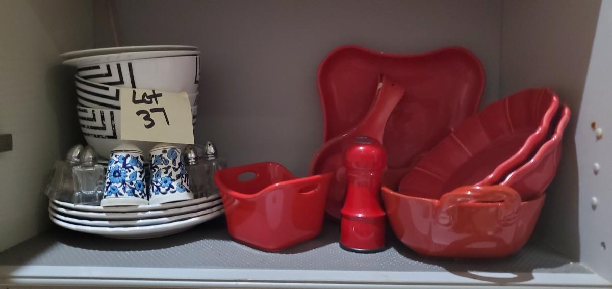 See photos. all on this shelf. s&p shakers, ceramic serving wares etc.