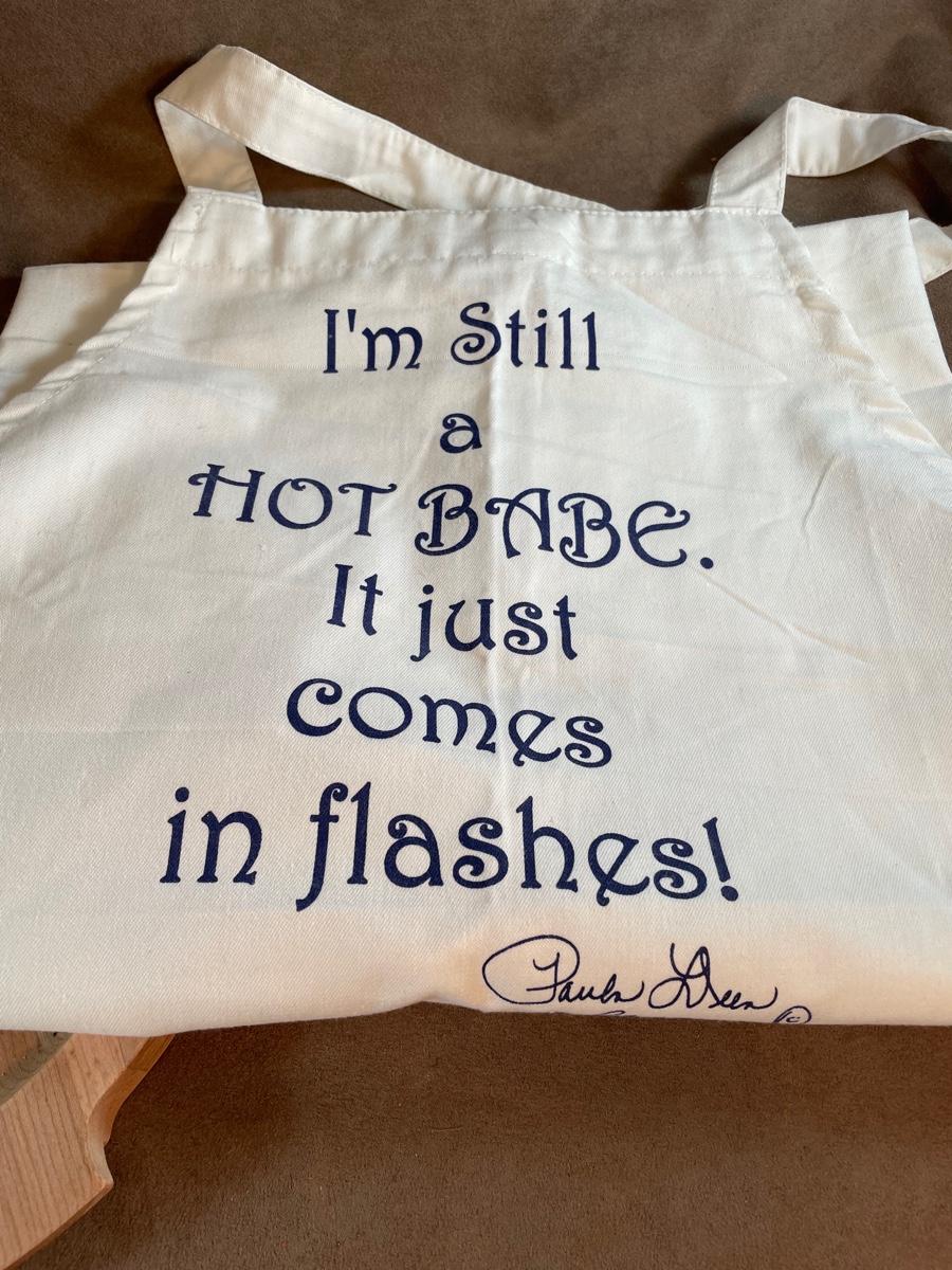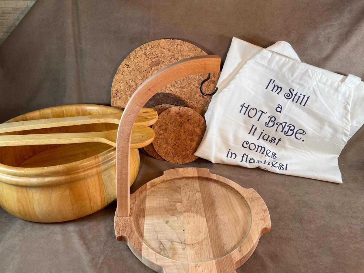 Large wood salad bow with serving utensils, assorted cork trivets, wood banana stand and an apron embellished with "I'm still a hot babe, it just comes in flashes"