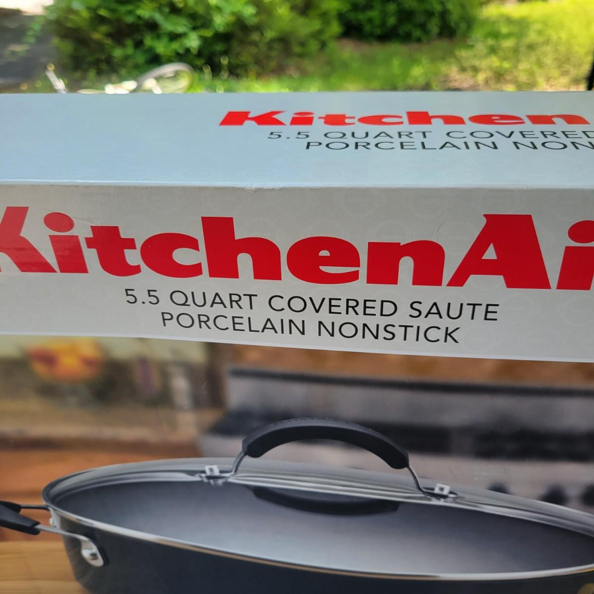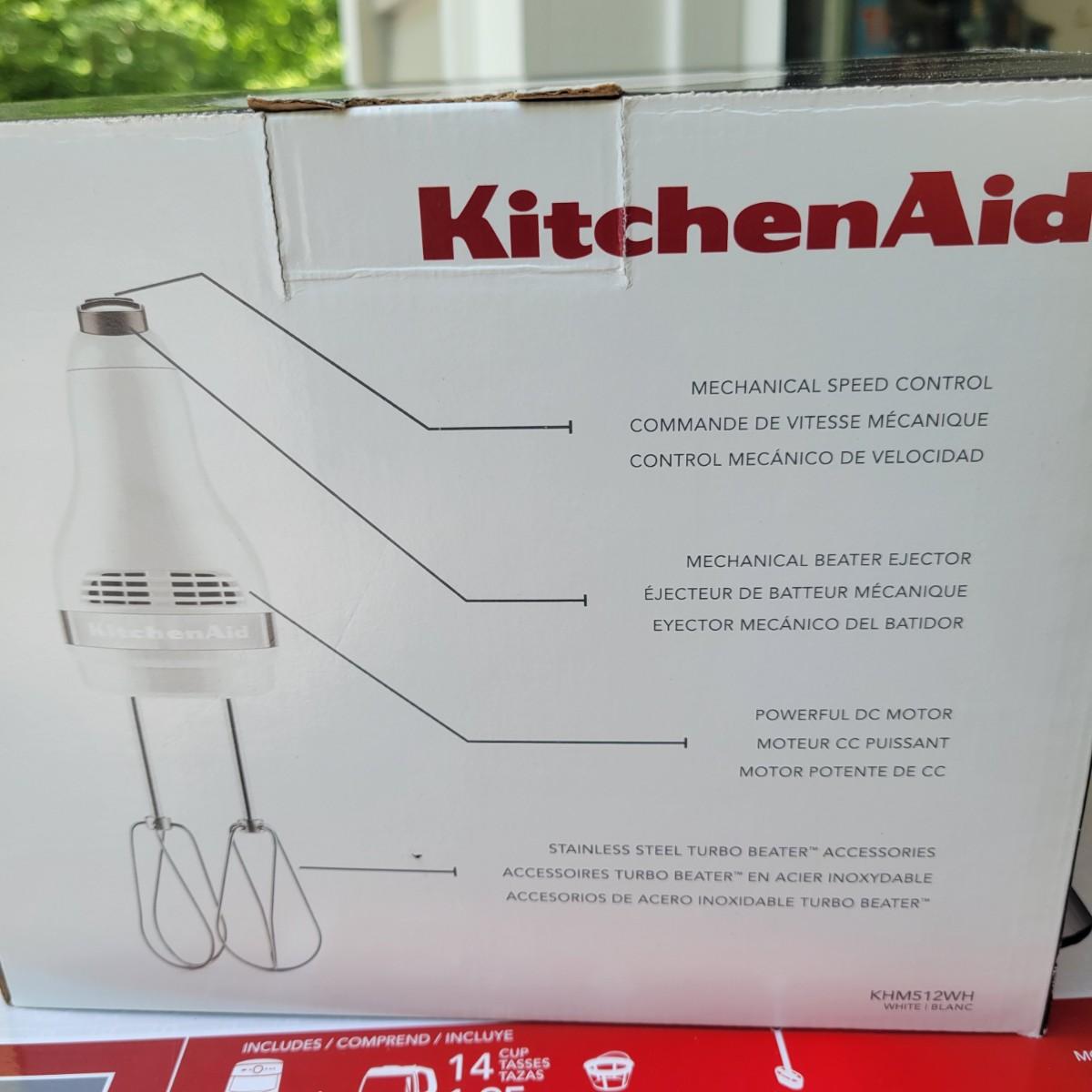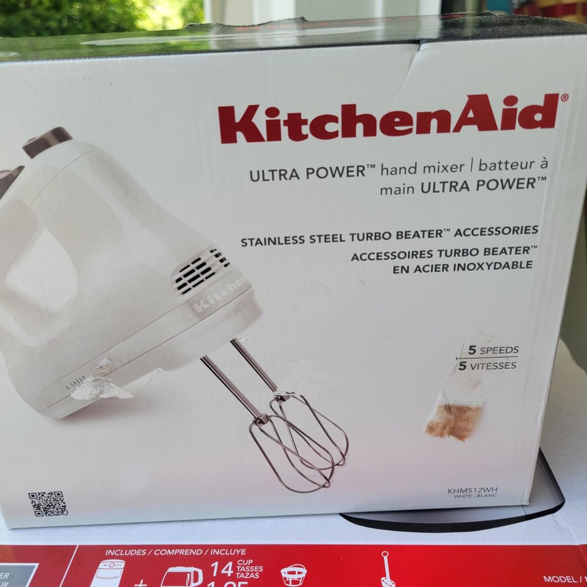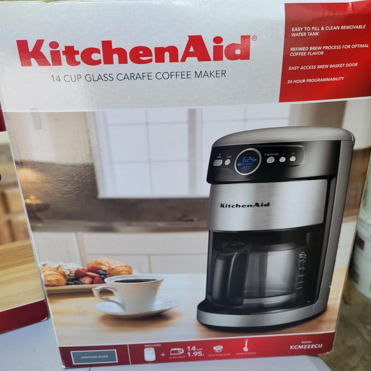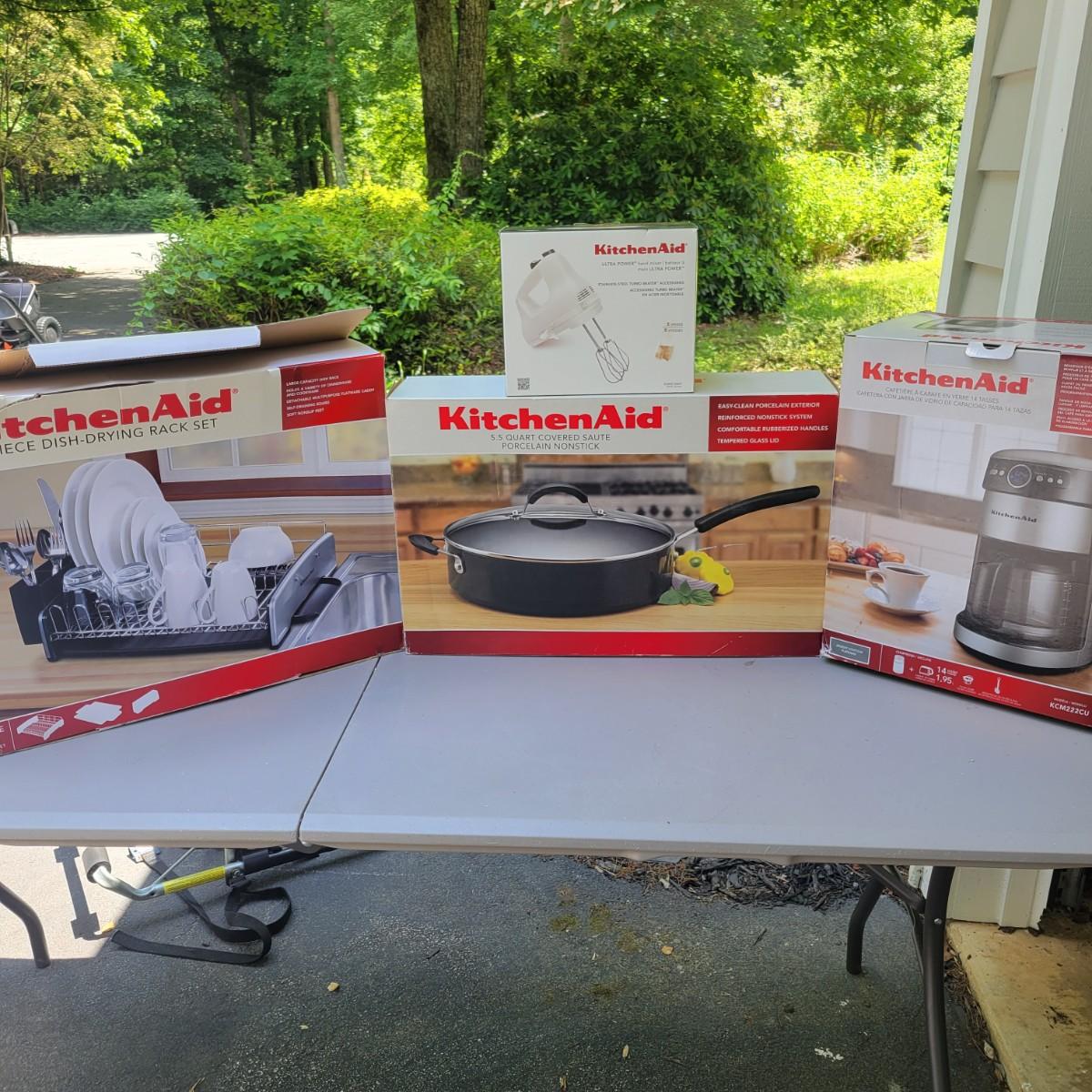 This ensemble of KitchenAid items includes a 14 cup glass carafe coffee maker, Ultra Power hand mixer and accessories, 5.5qt covered saute porcelain nonstick pan and a 3 piece drying rack. All are new except drying rack set. Local pickup only