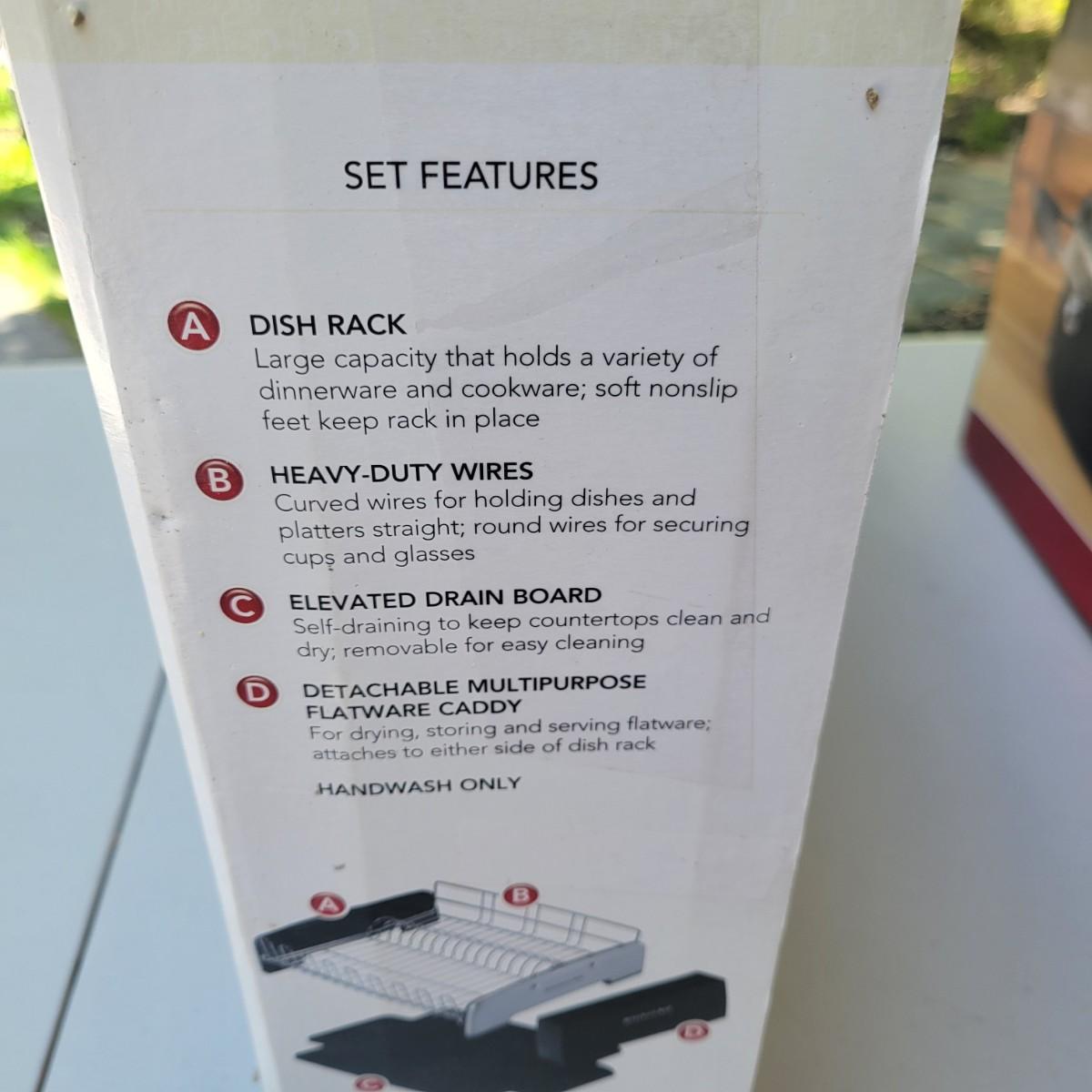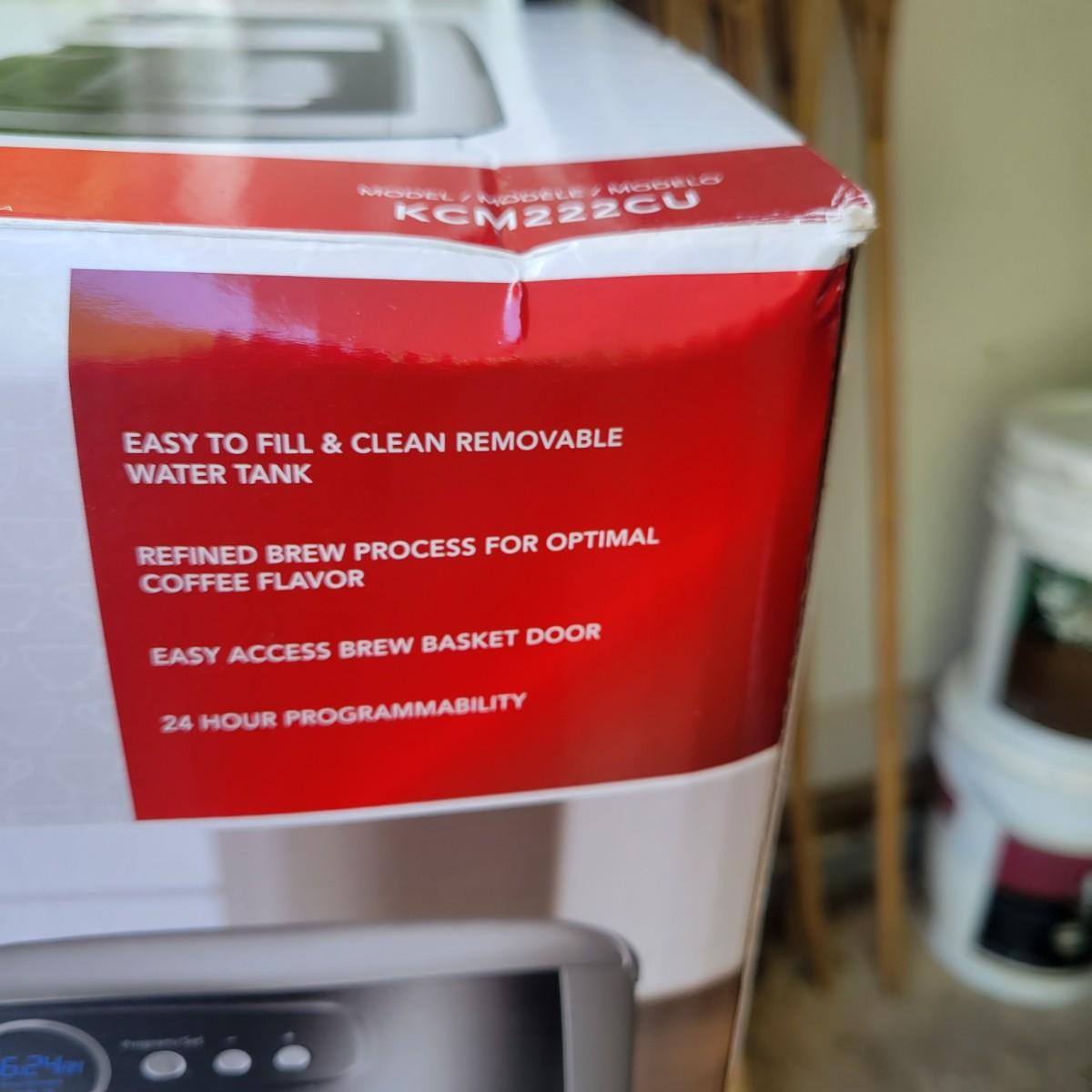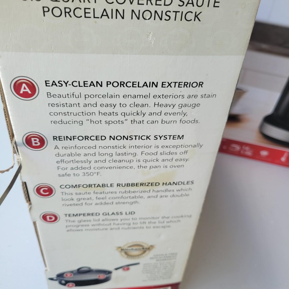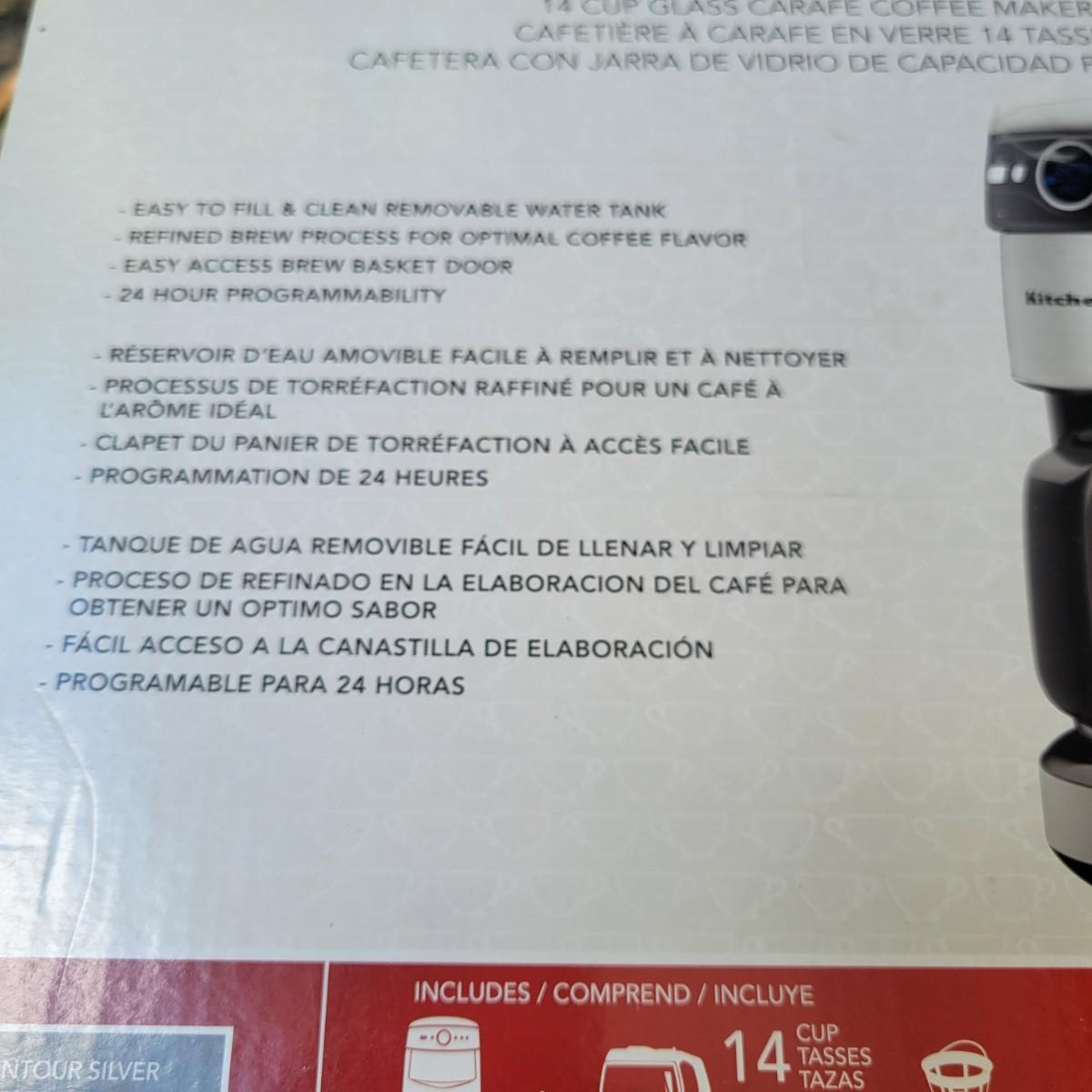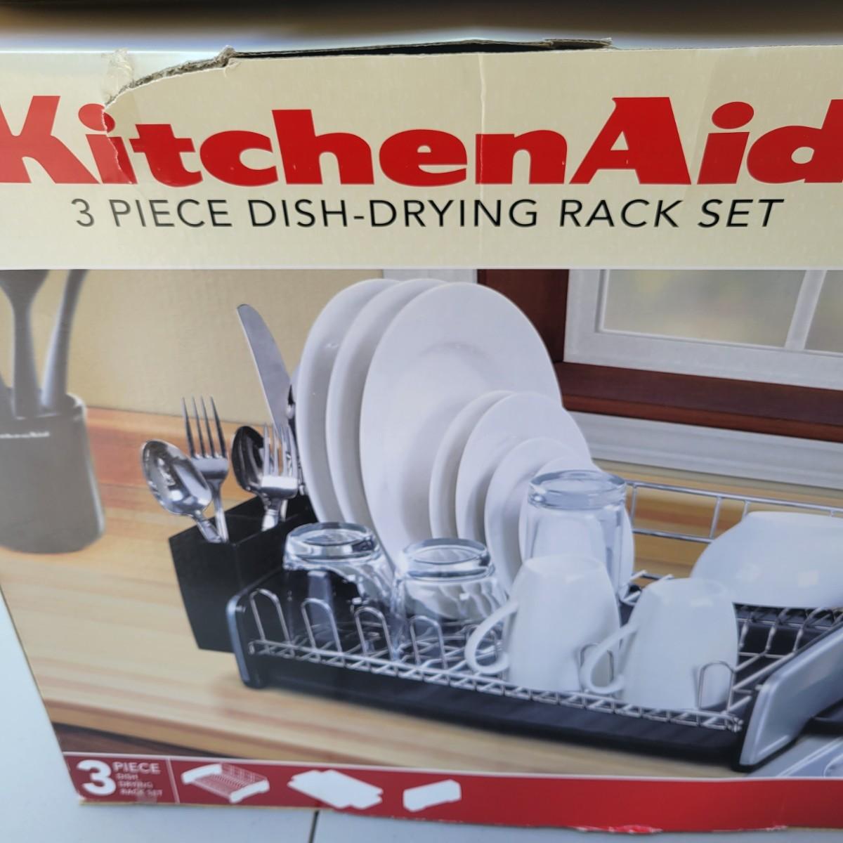This ensemble of KitchenAid items includes a 14 cup glass carafe coffee maker, Ultra Power hand mixer and accessories, 5.5qt covered saute porcelain nonstick pan and a 3 piece drying rack. All are new except drying rack set. Local pickup only