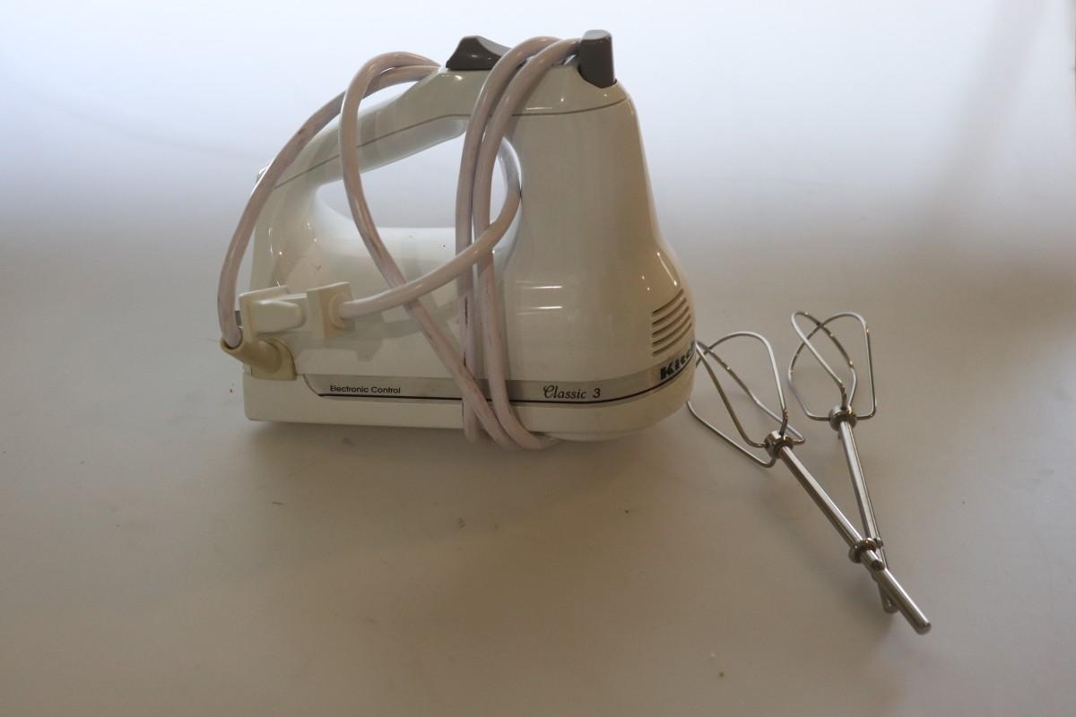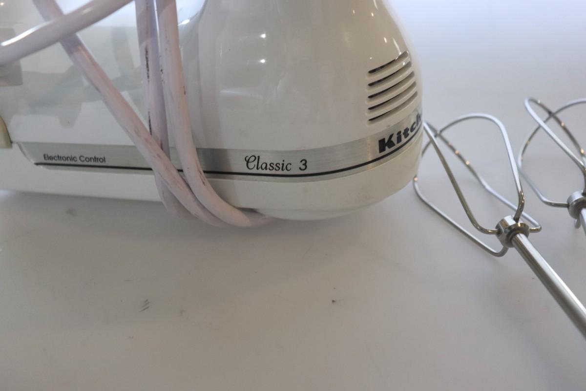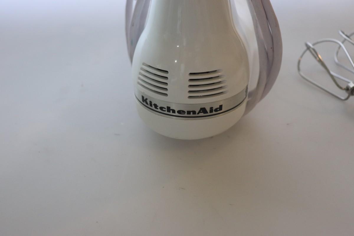 This lot features a KitchenAid hand mixer in classic white, a versatile and essential tool for any kitchen. Known for its powerful performance and ergonomic design, this hand mixer makes it easy to whip, mix, and blend ingredients with ease. With multiple speed settings, it can handle everything from delicate egg whites to heavy dough. A reliable addition to your kitchen appliances, perfect for bakers and home cooks alike!