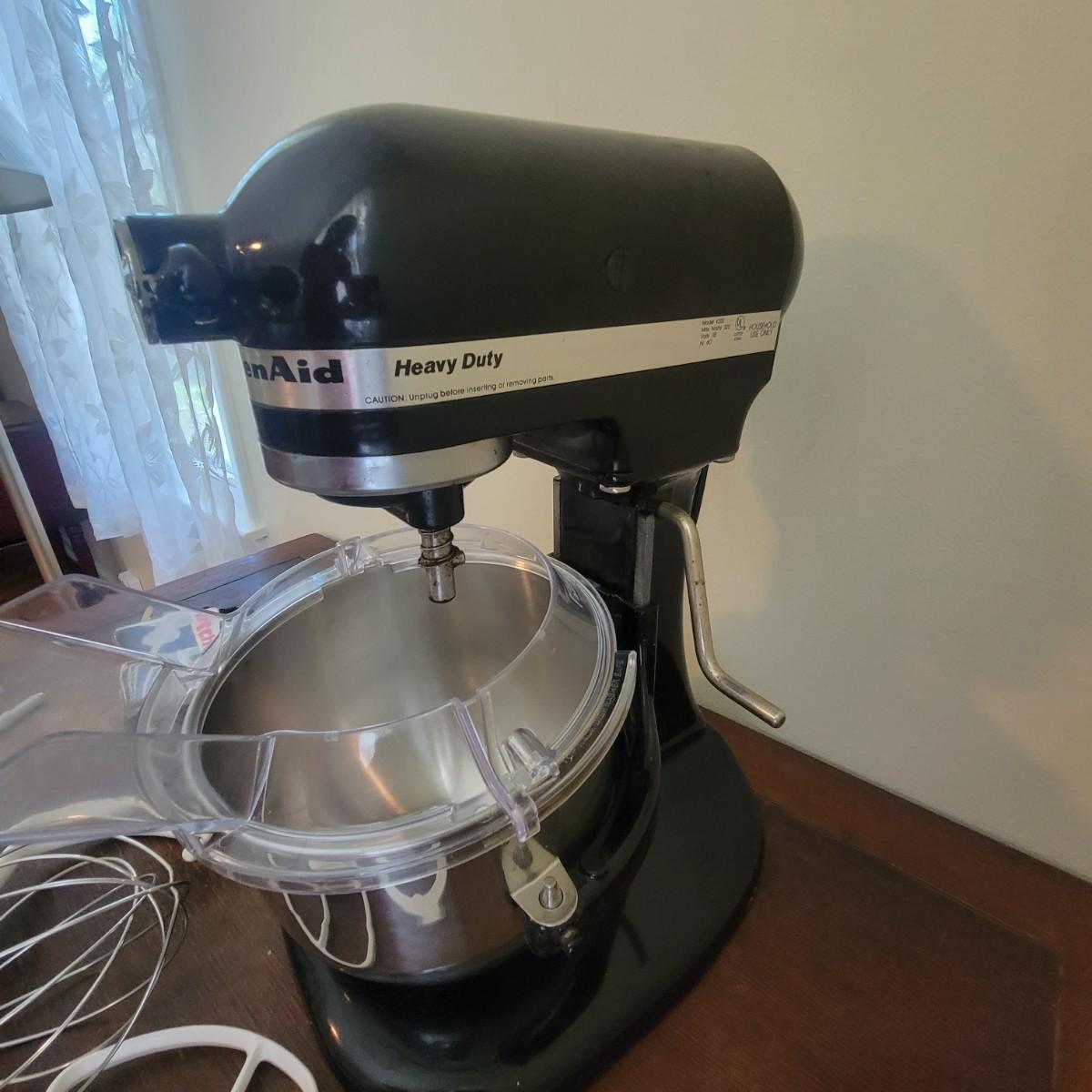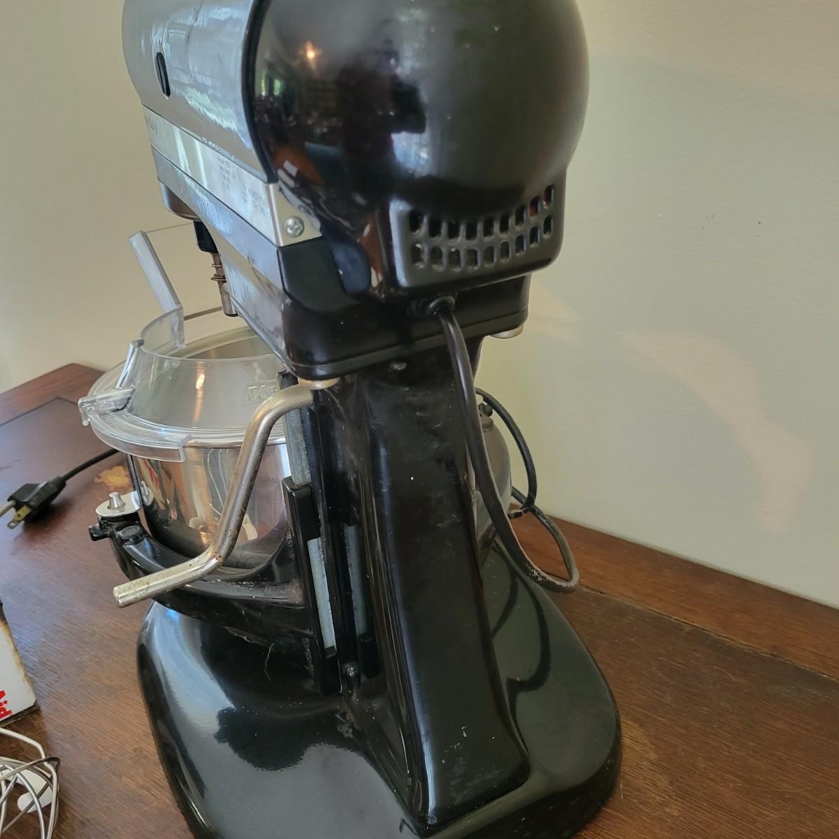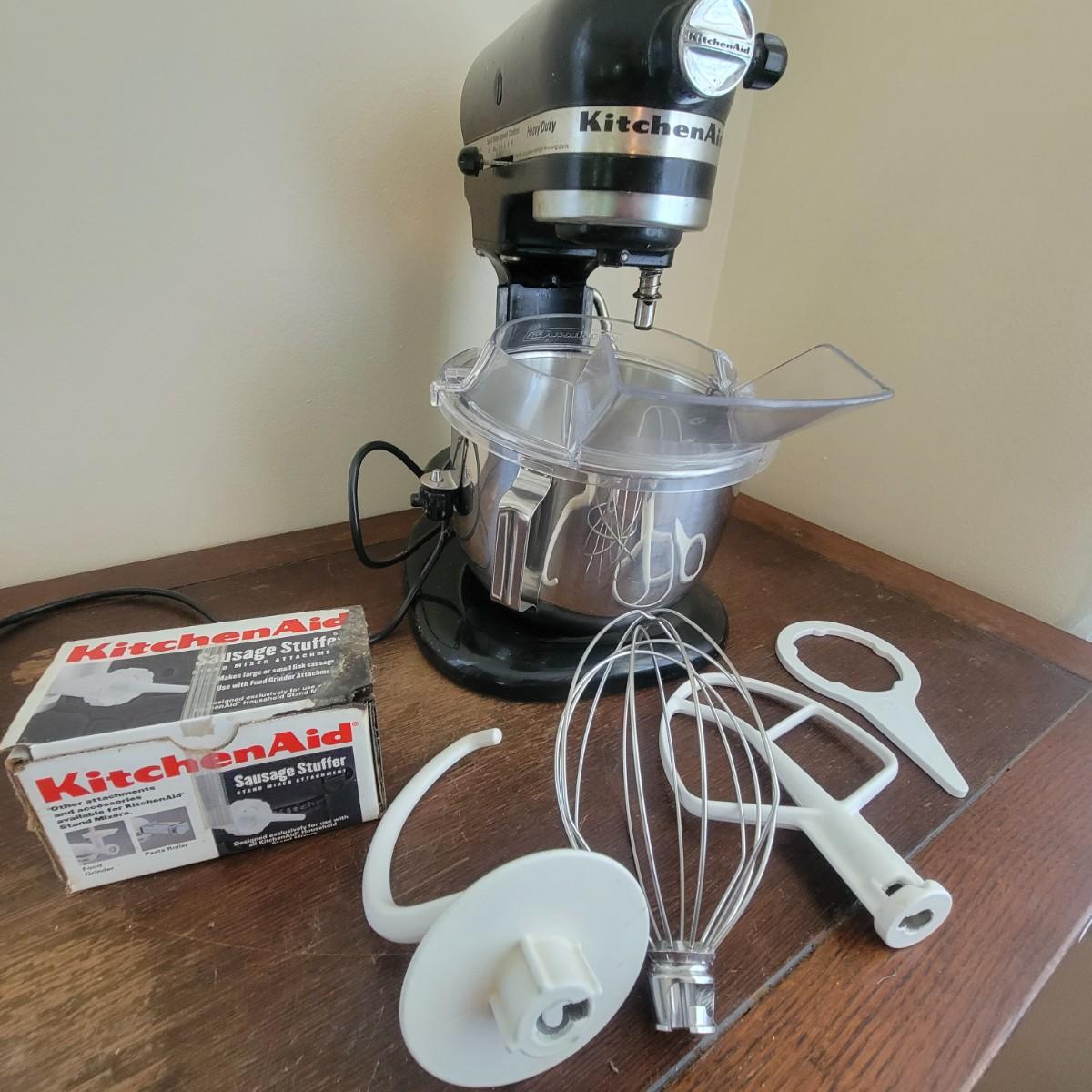 Black, KitchenAid 325watt heavy duty stand mixer. Includes a dough hook, wisk and batter attachments. Also includes a sausage stuffer, but it does not look like all pieces are there. Tested and works, but bowl level does not lock into place when bowl is lifted. Local pickup only