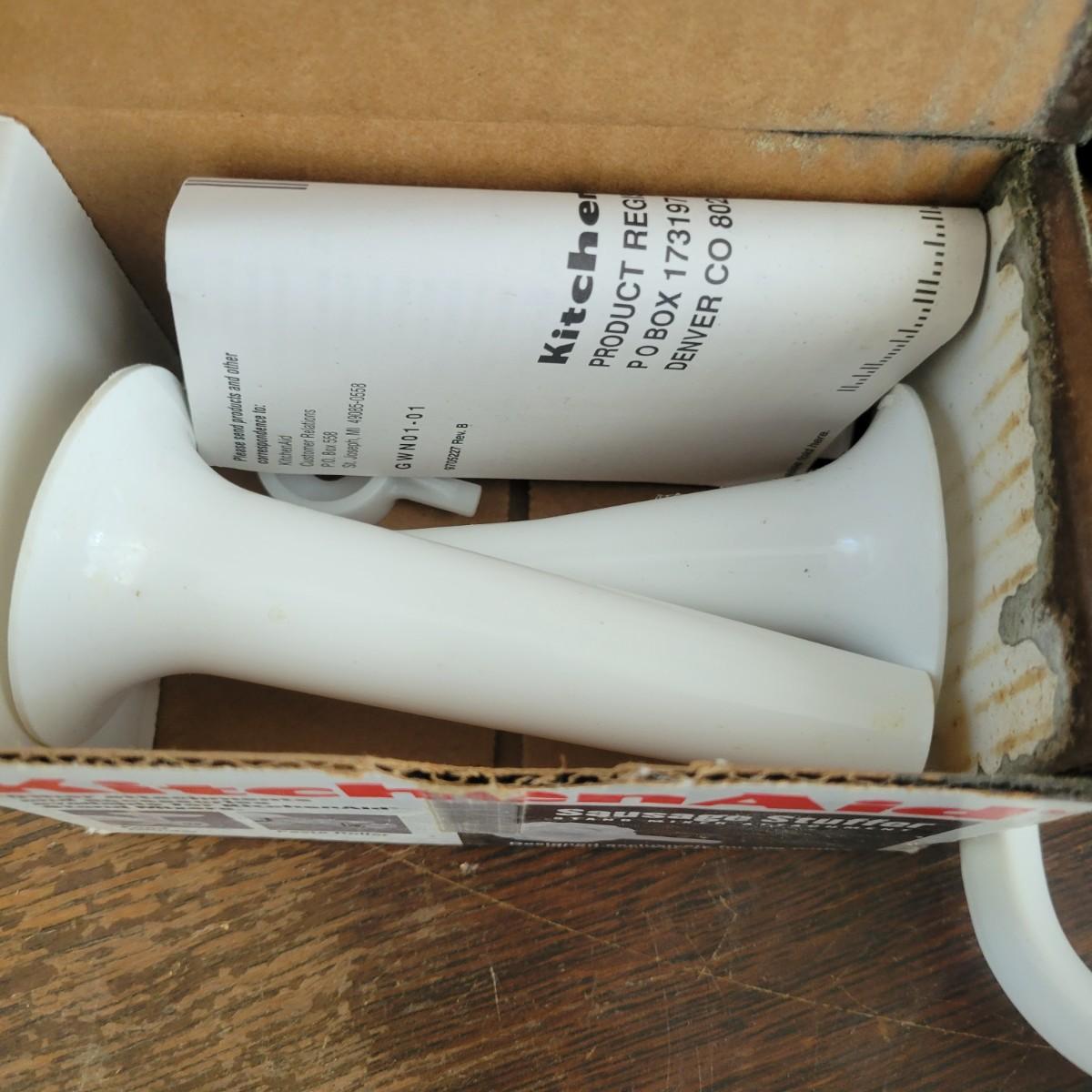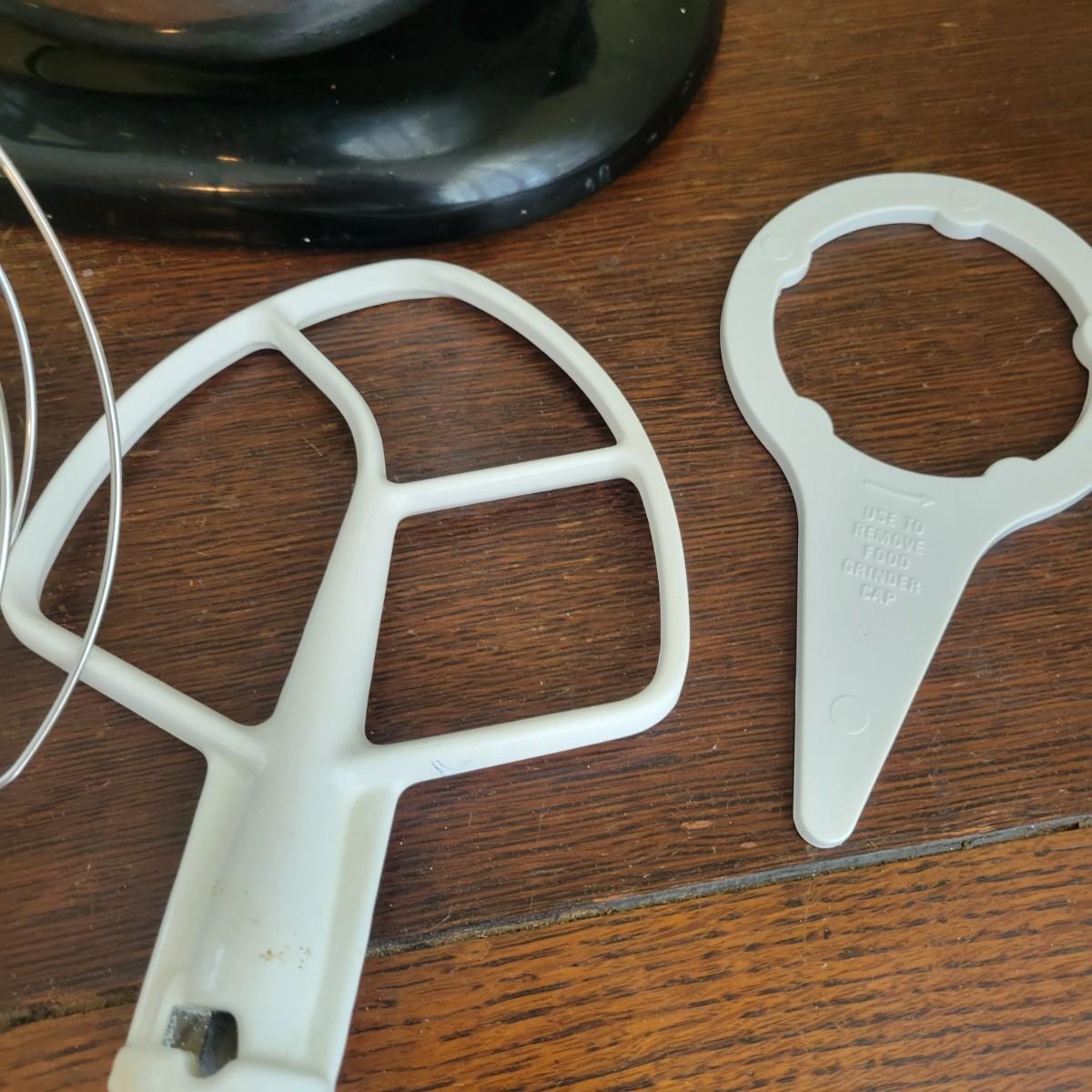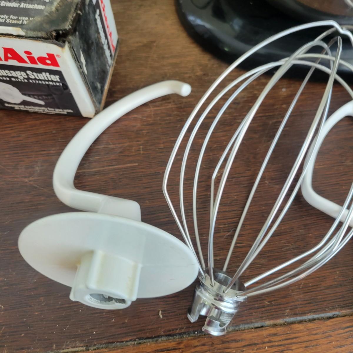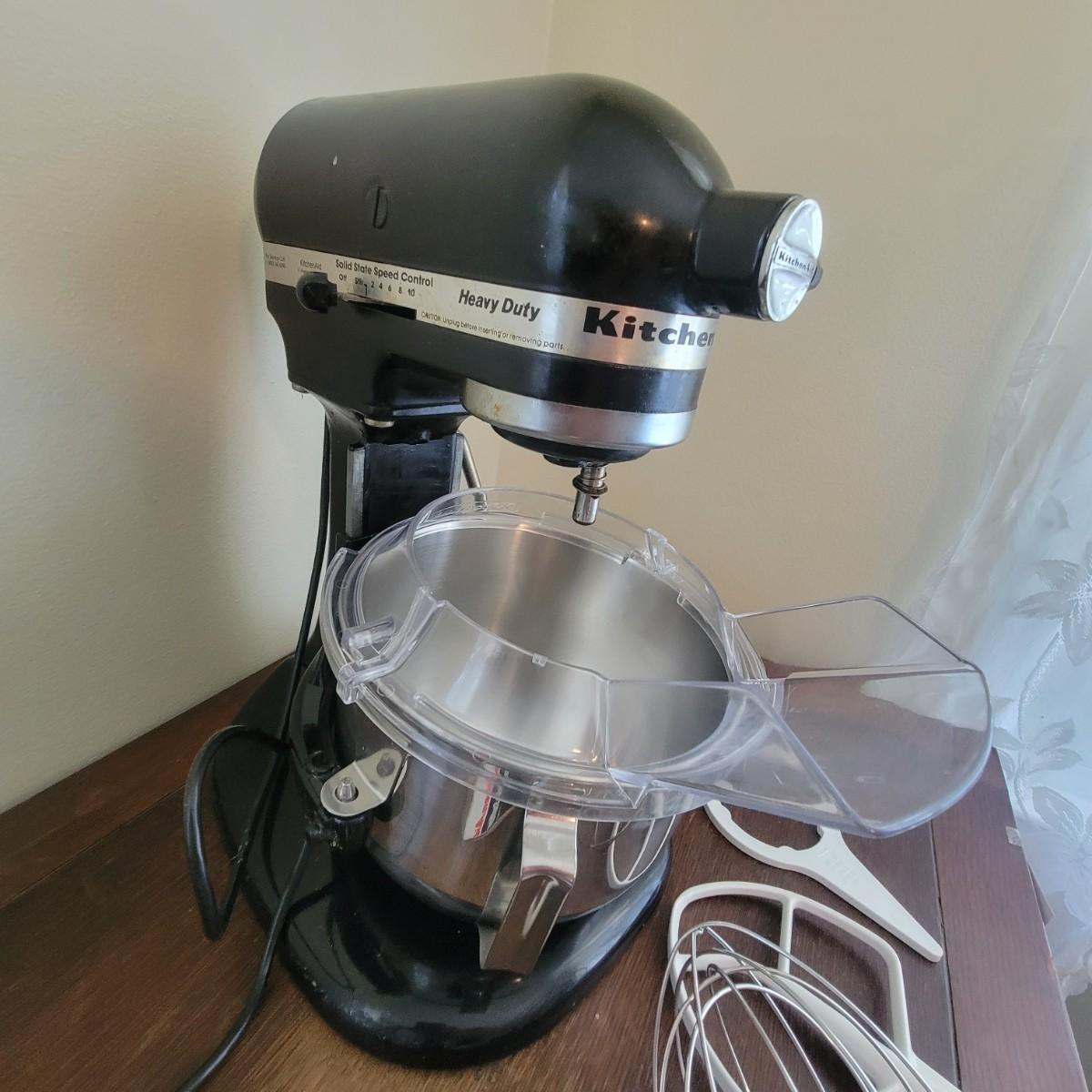 Black, KitchenAid 325watt heavy duty stand mixer. Includes a dough hook, wisk and batter attachments. Also includes a sausage stuffer, but it does not look like all pieces are there. Tested and works, but bowl level does not lock into place when bowl is lifted. Local pickup only