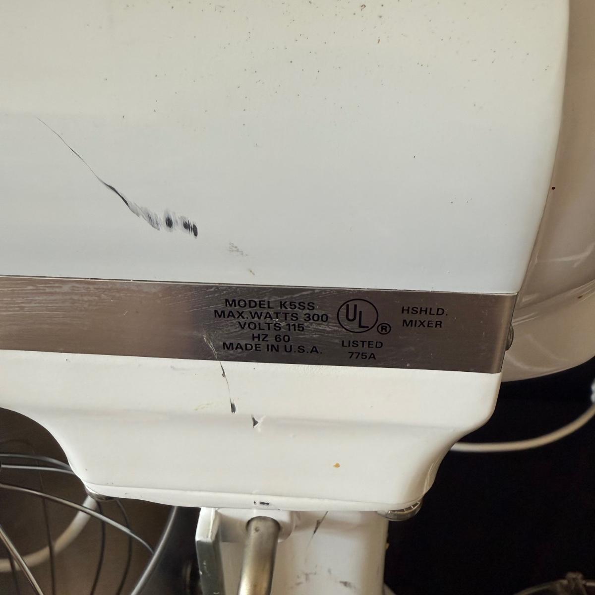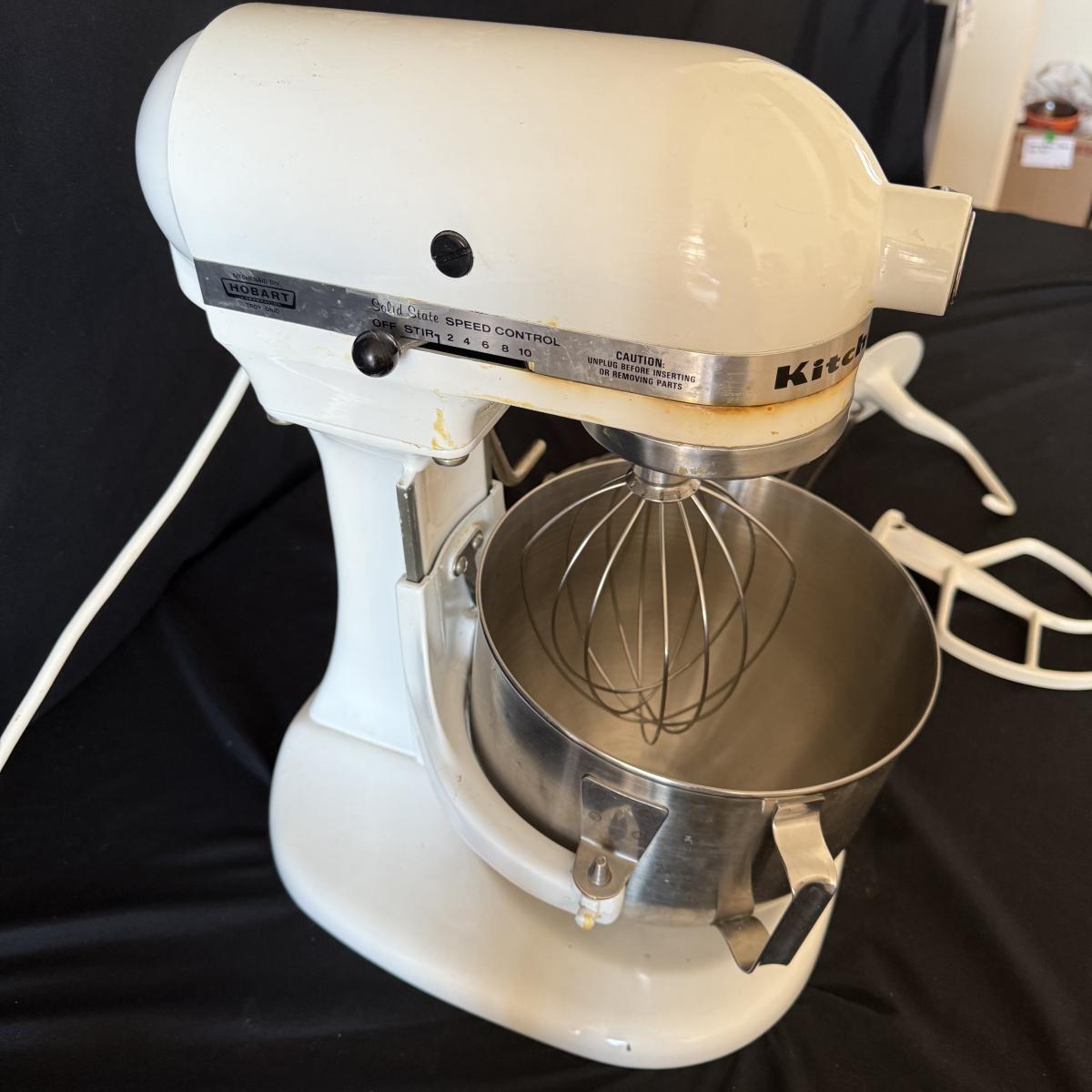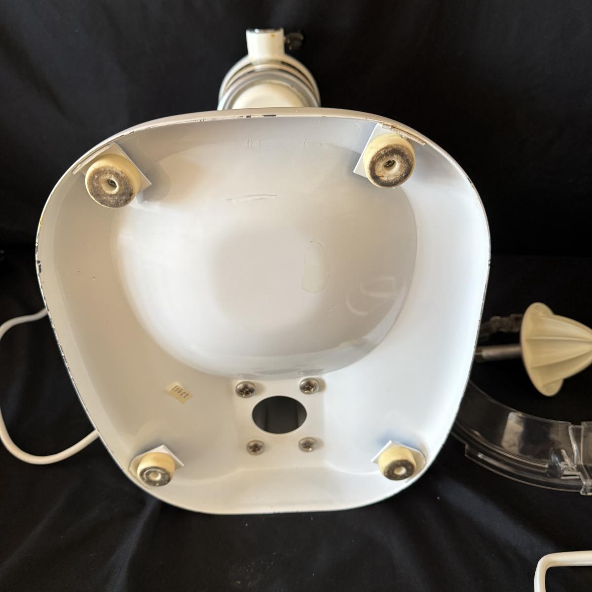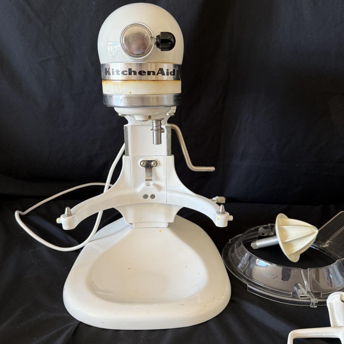 This lot contains a white KitchenAid Mixer that powered on, with attachments. The attachments included is a mixing bowl, a paddle, a dough hook, a juicer and a whisk. The base measures approximately 11” x 12” x 16.5”H. There is a bit of natural wear to this item. Shipping available.