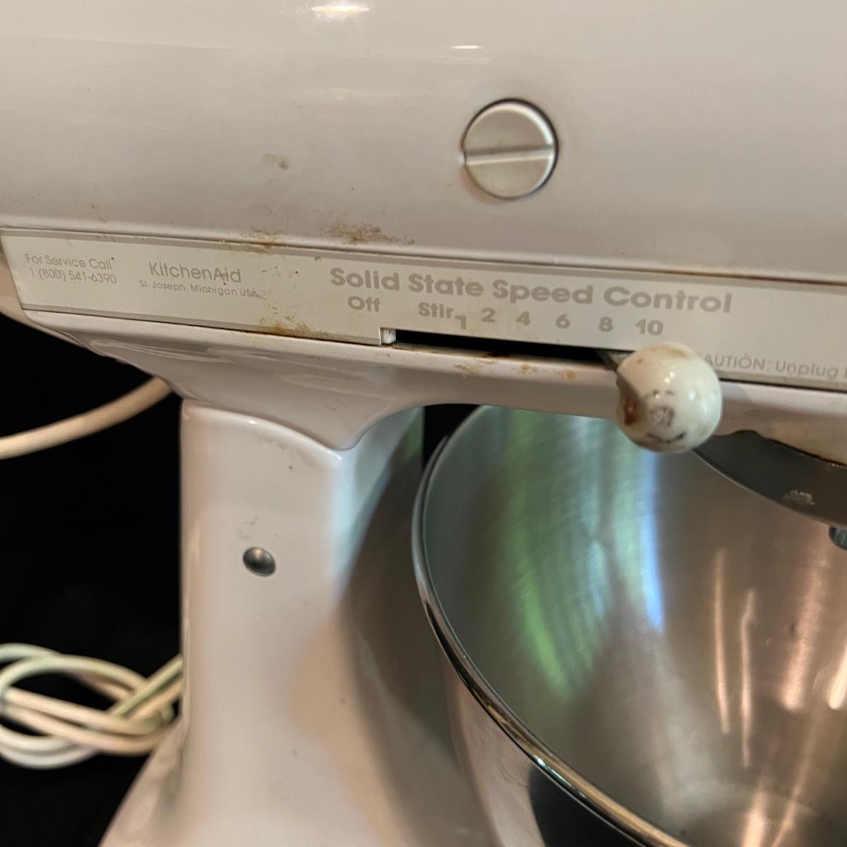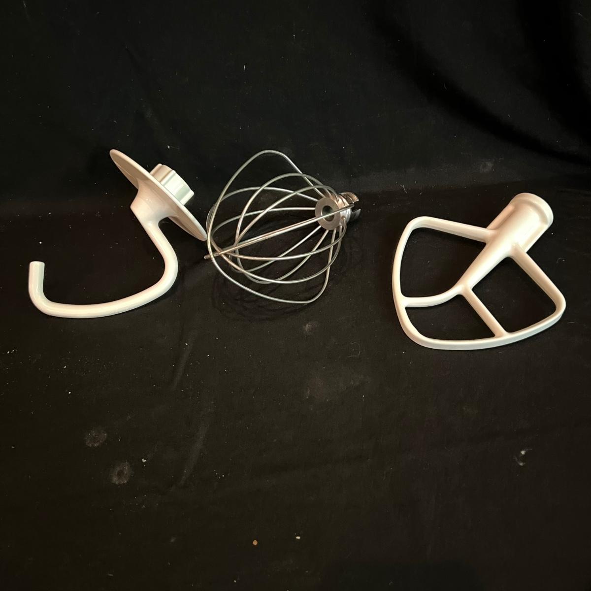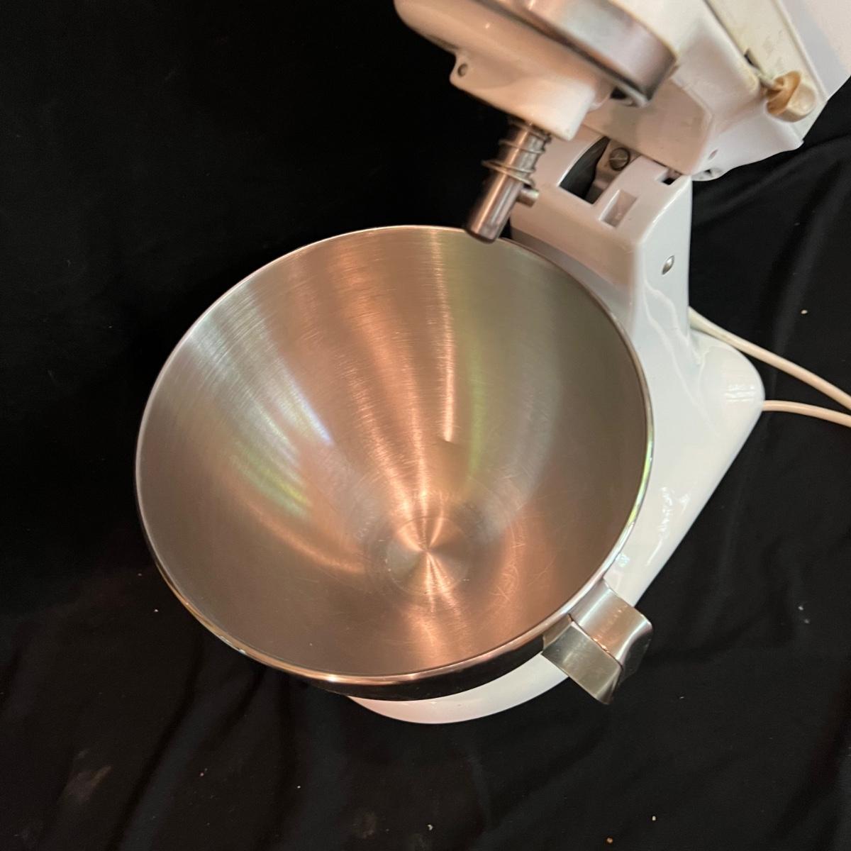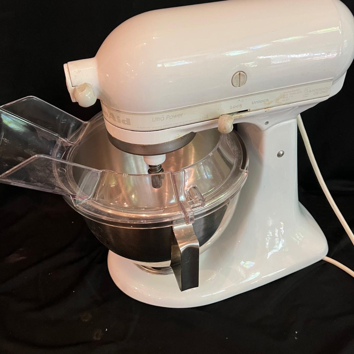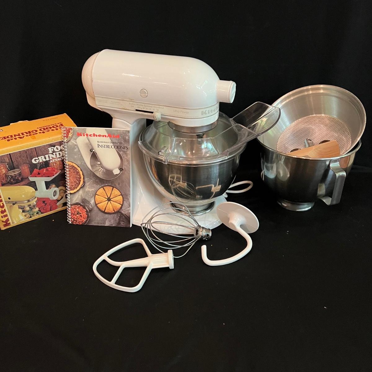 White KitchenAid stand mixer with two mixing bowls and flour guard. All attachments included, dough hook, whisk, and paddle mixer. Also a full food grinder attachment set and a straining attachment for applesauce etc. Plugged in and powered on.