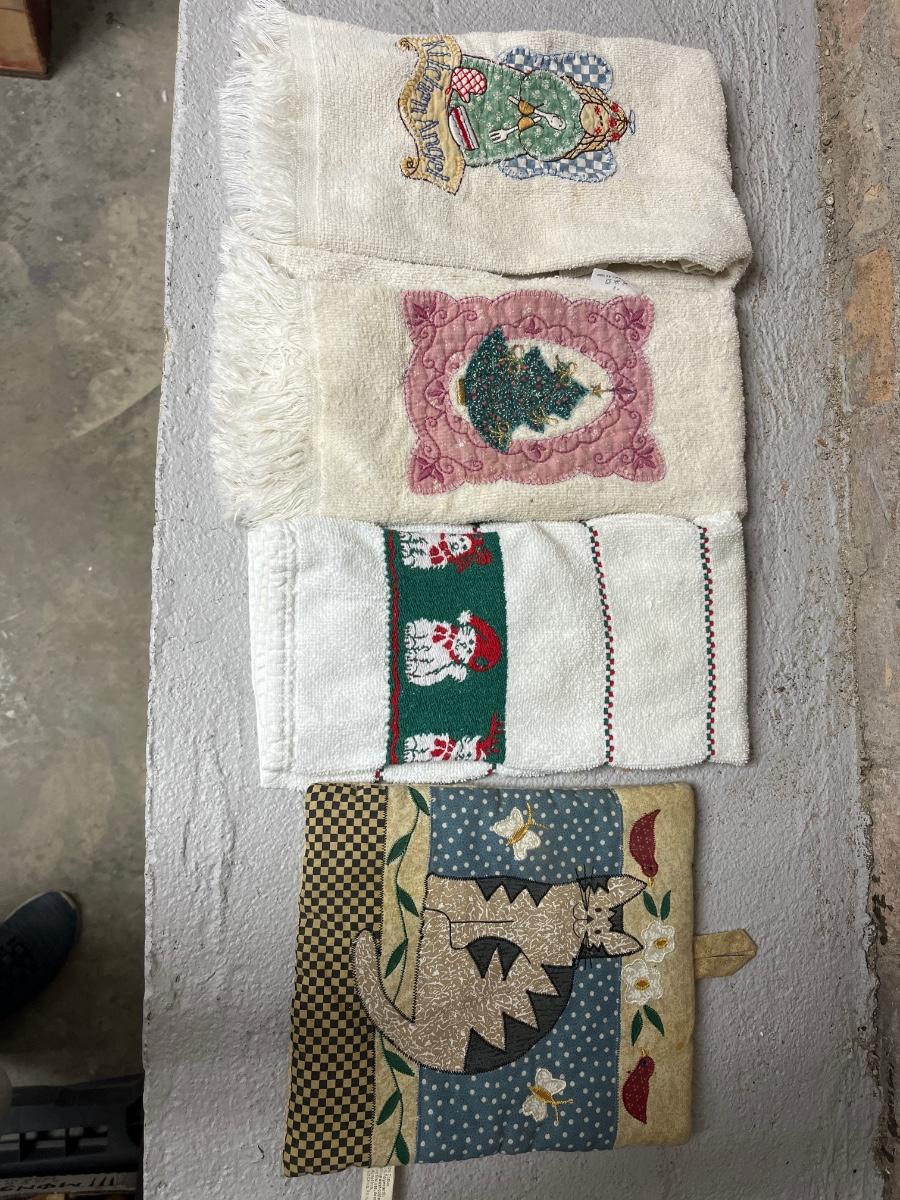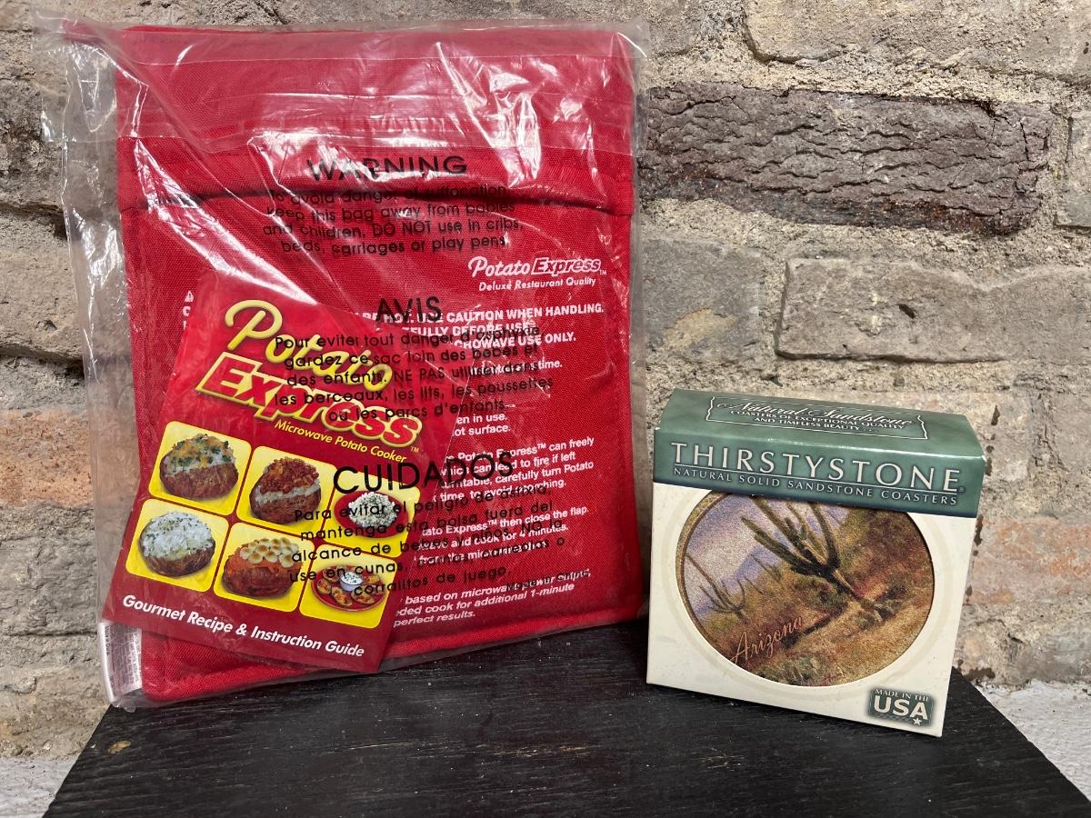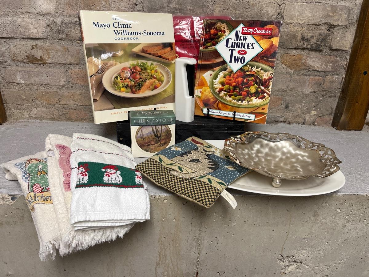 Pair of cookbooks, Potato Express bag, sandstone coasters, footed aluminum fruit bowl, Pier 1 platter, Pampered Chef salt shaker/pepper mill, guest towels and cat potholder