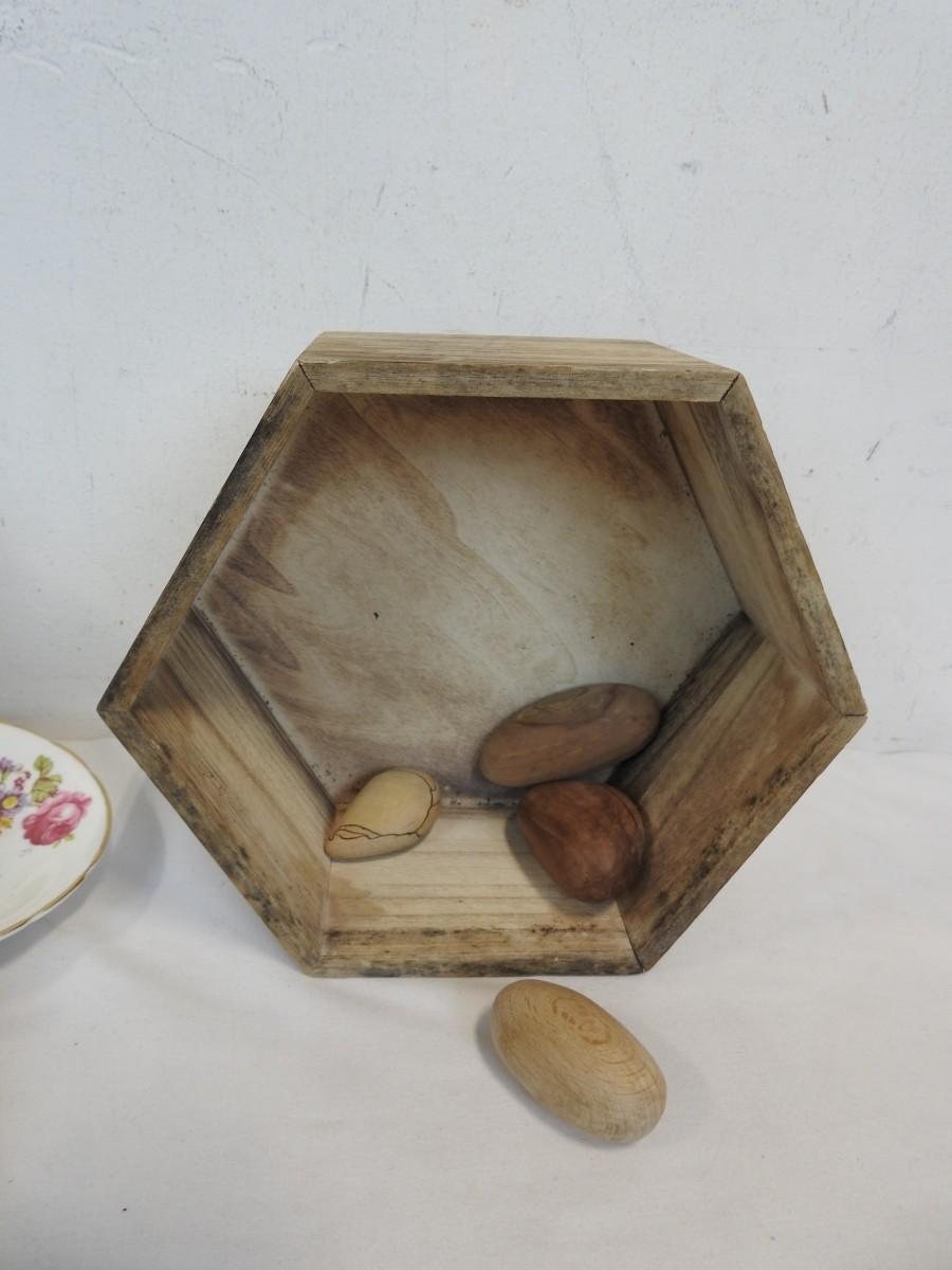 Kitchen / Home Decor: Small decorative plates with display rack, Wooden Hexagon with Wooden Rocks