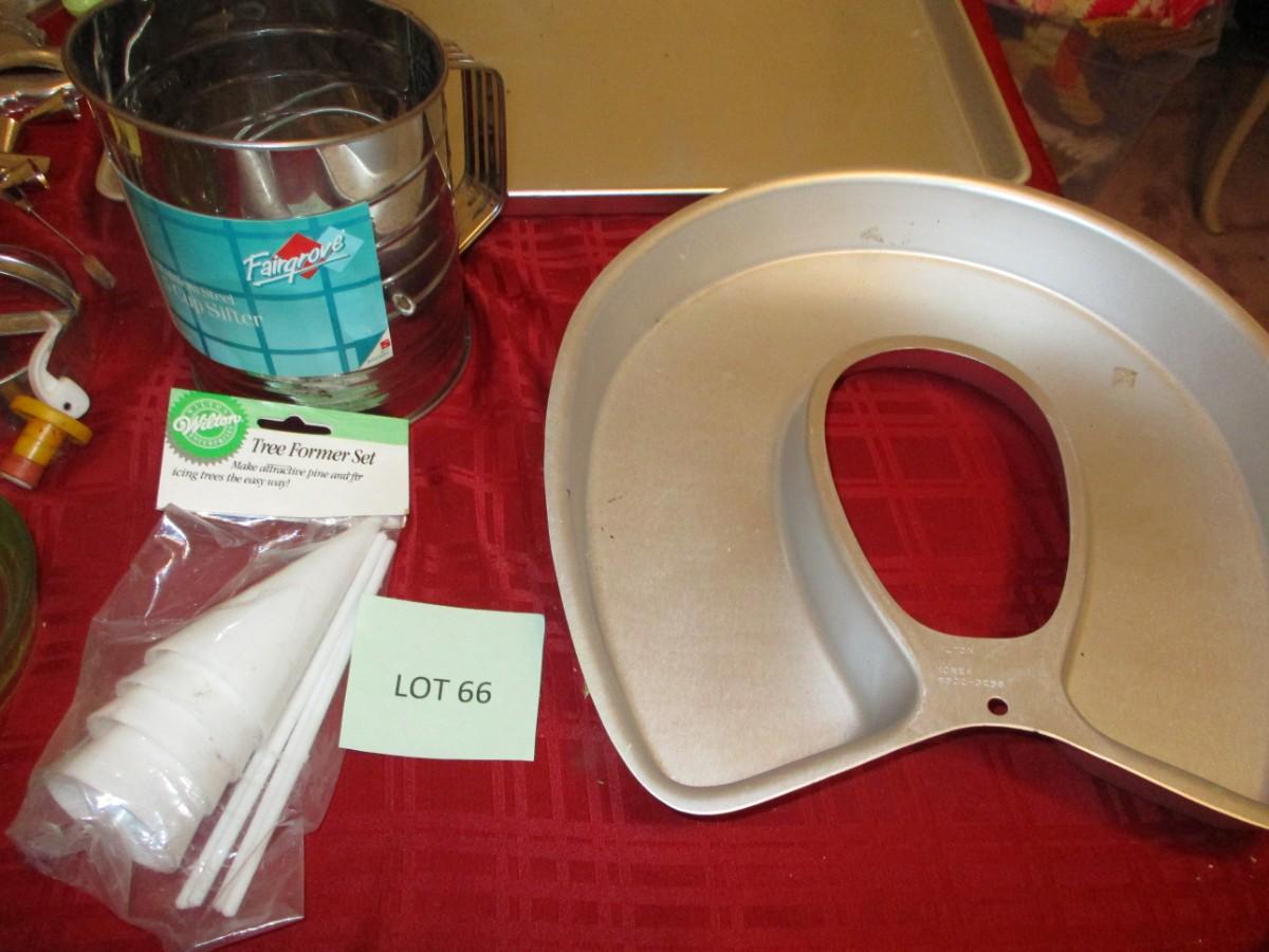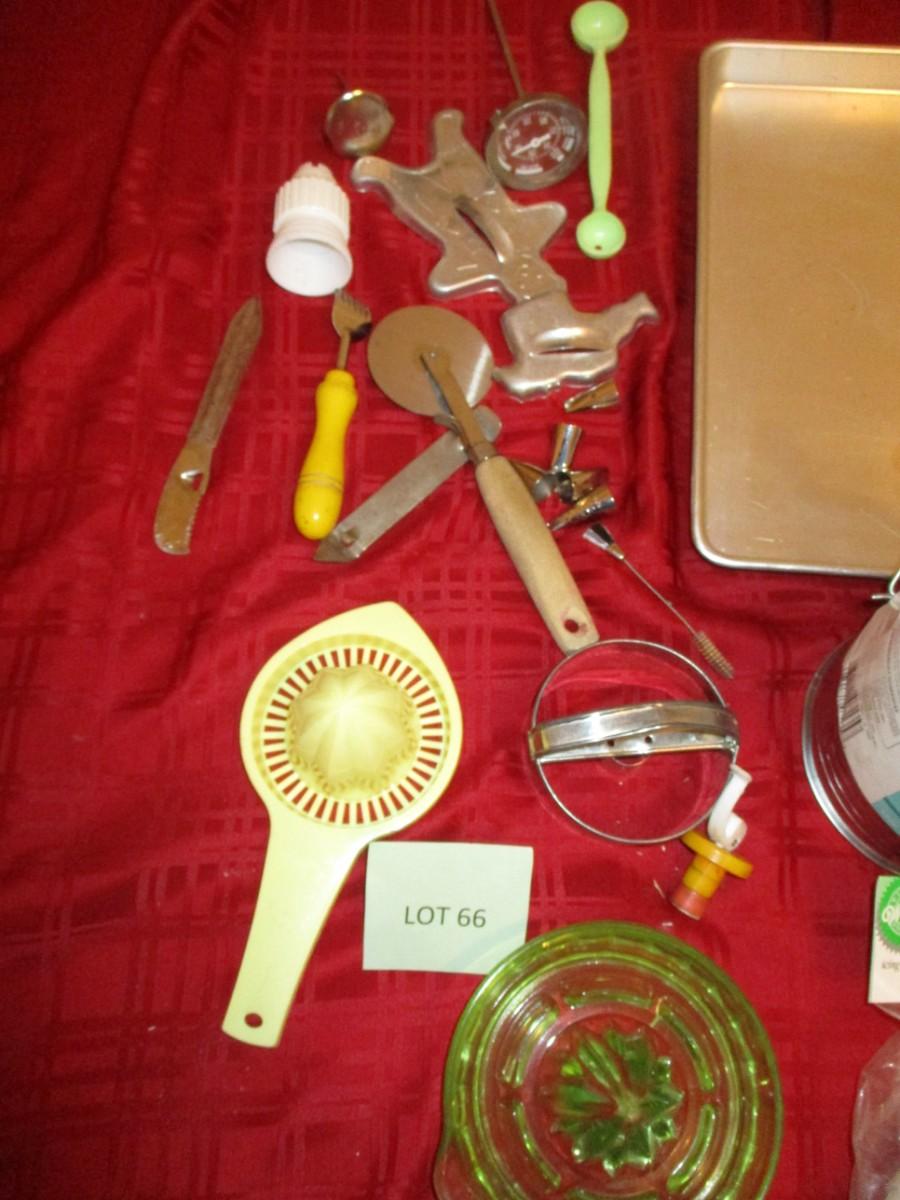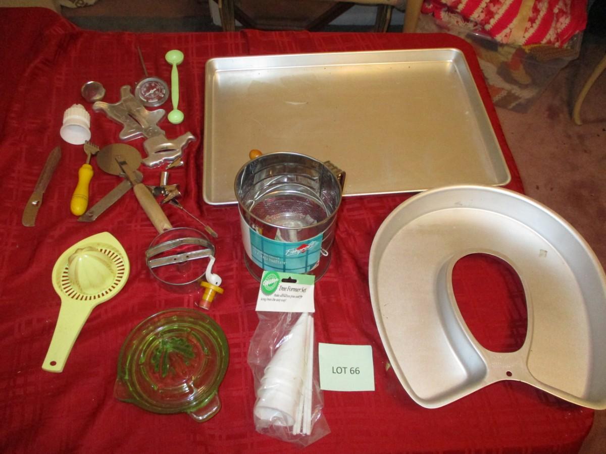 Aluminum Bake pans. Flour Sifter. Green glass hand juicer.