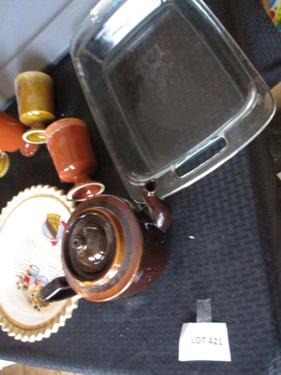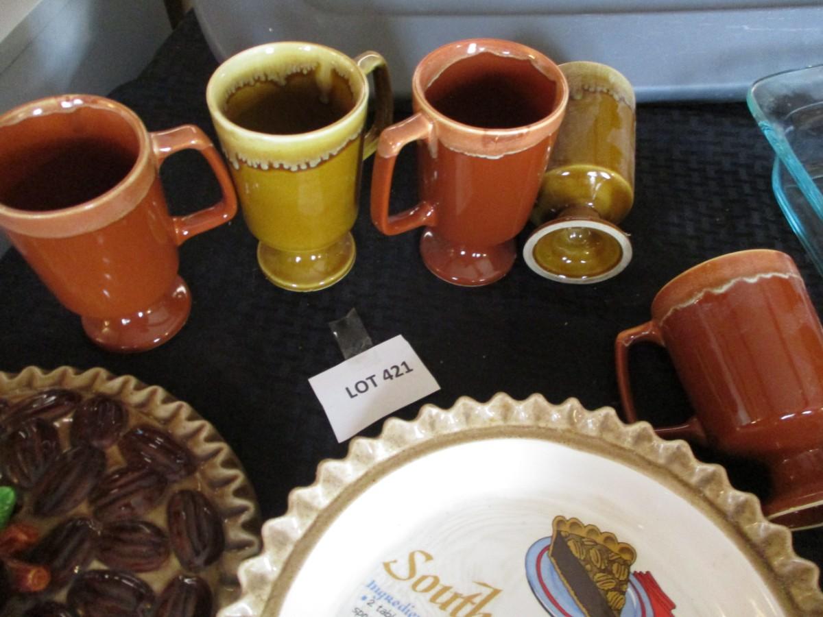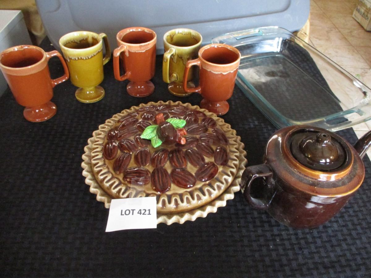 Ceramic pie dish, Vintage ceramic mugs, Teapot, Bakeware