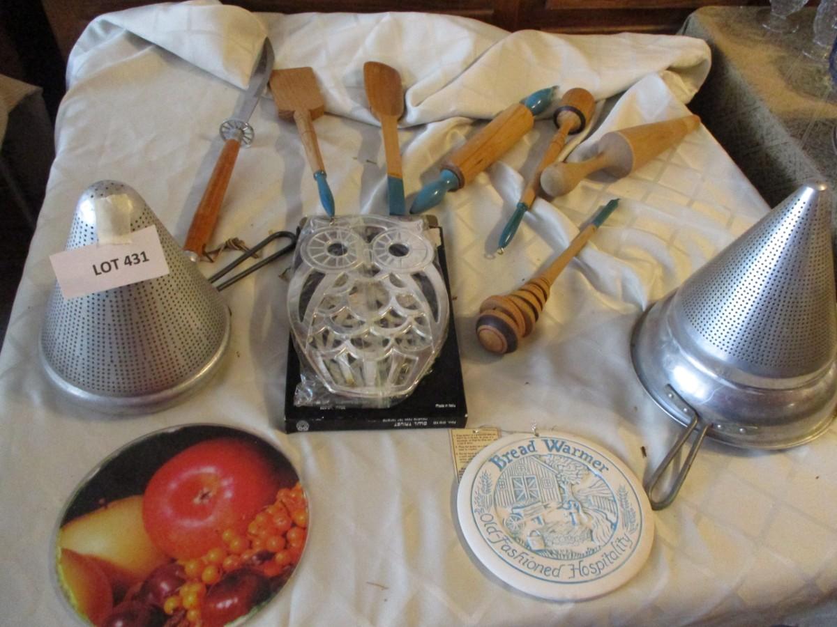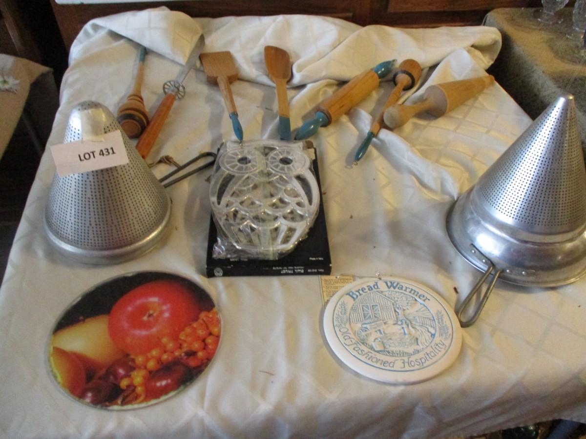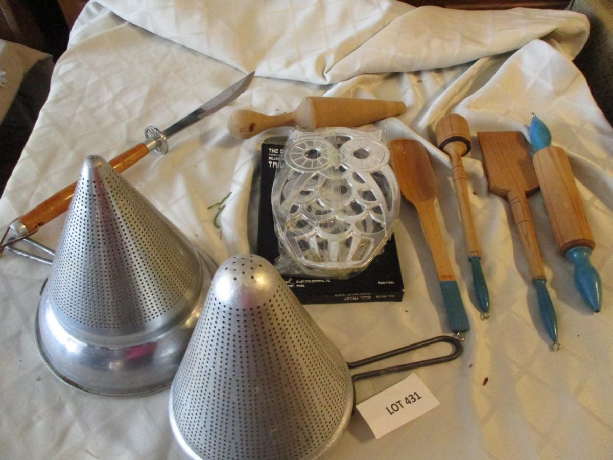 Sieve with pestle, Trivet, small rolling pine and utensil,