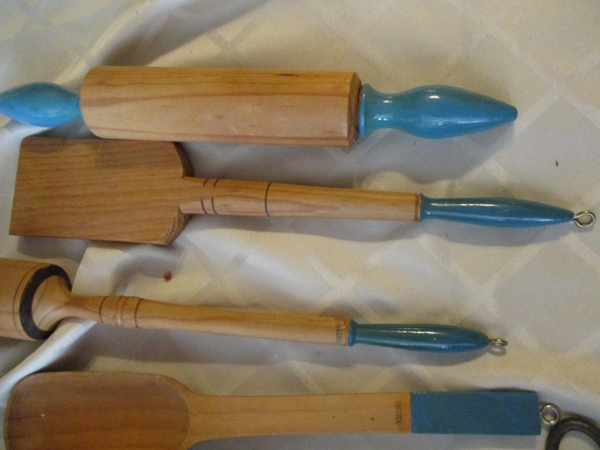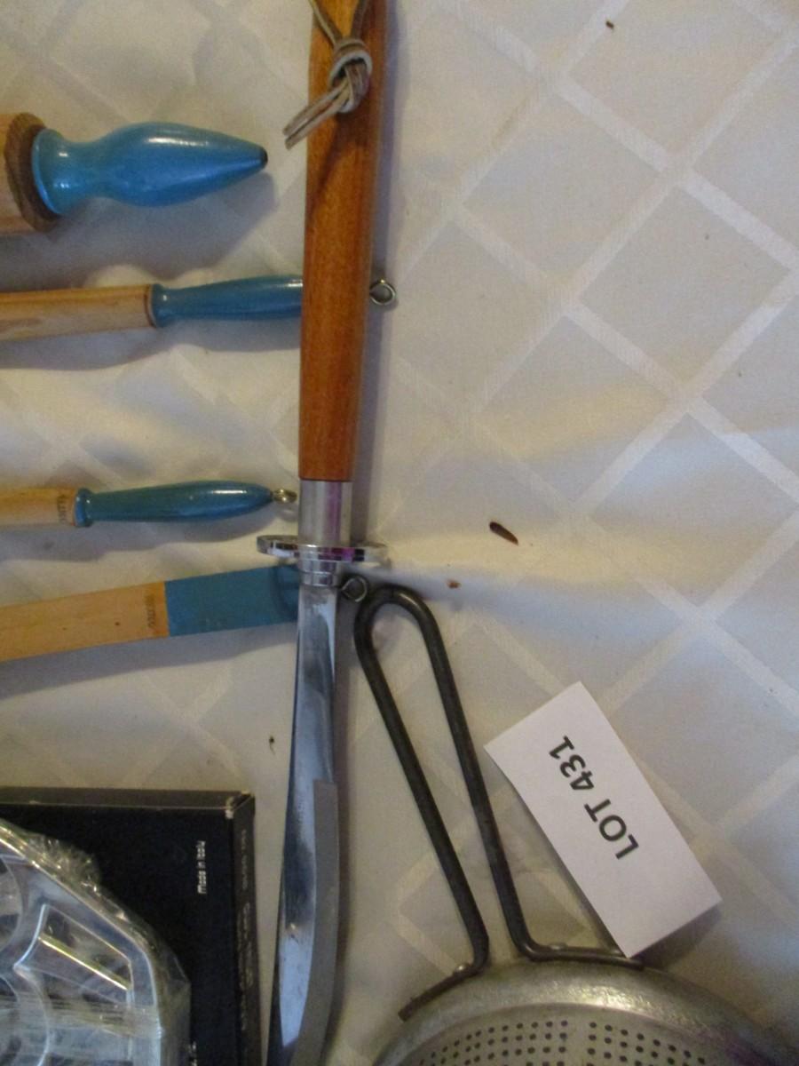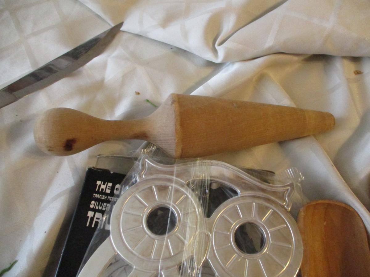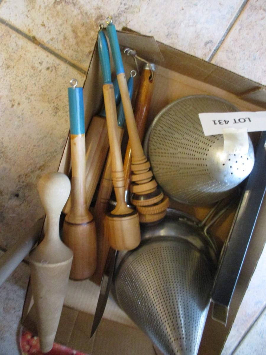 Sieve with pestle, Trivet, small rolling pine and utensil,