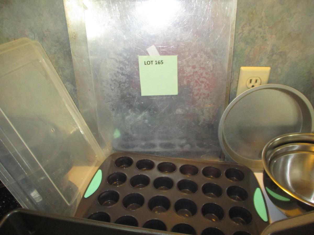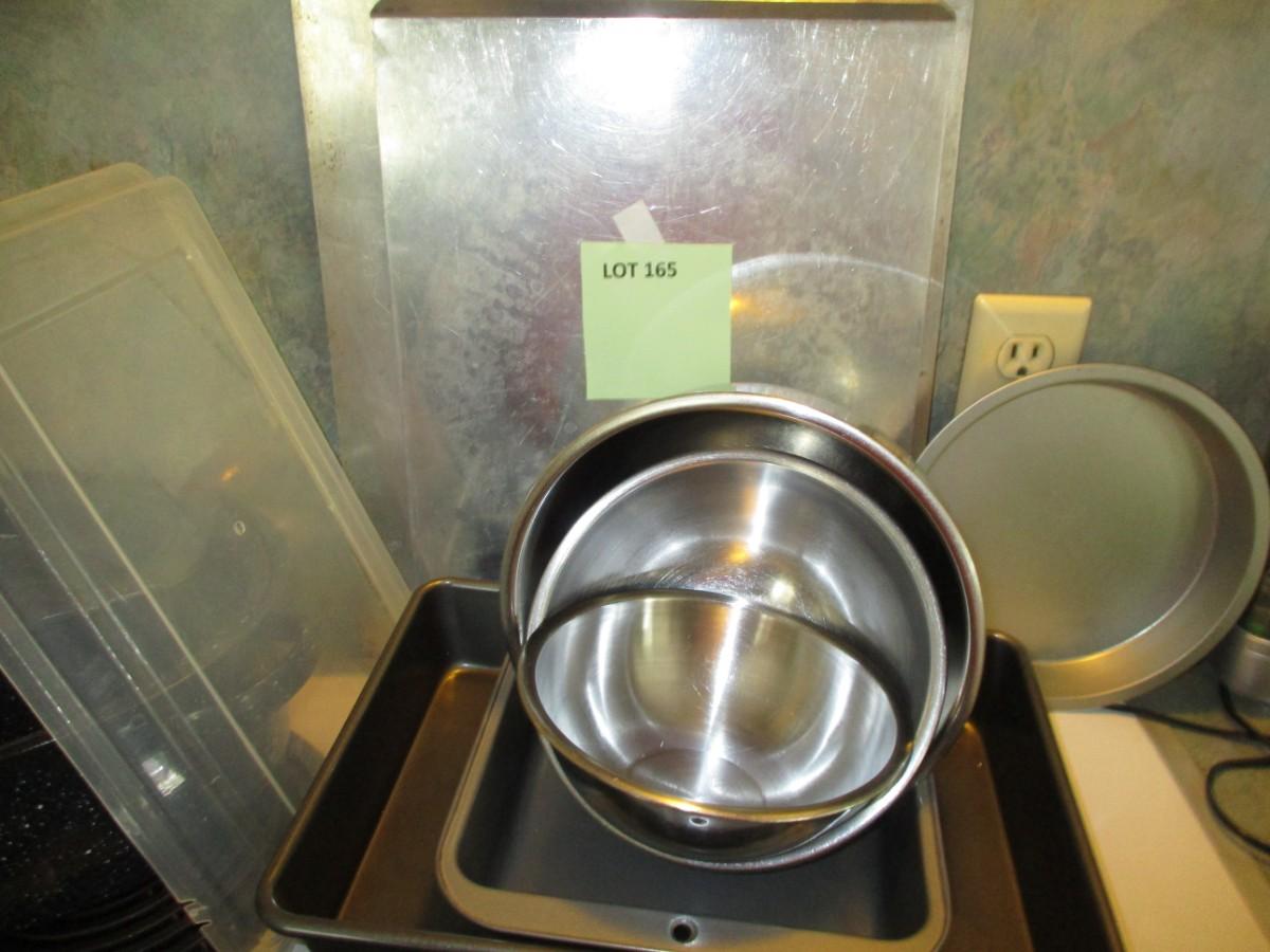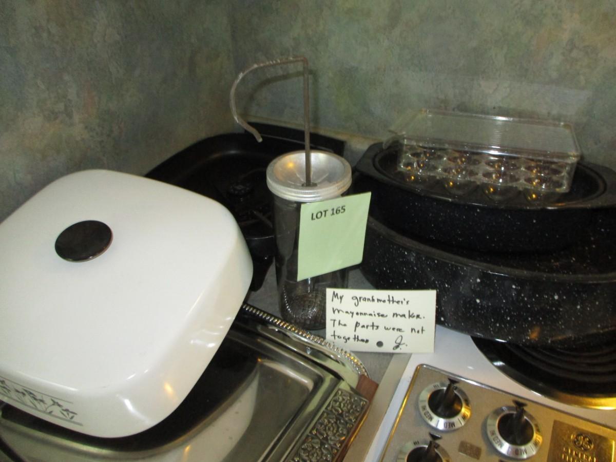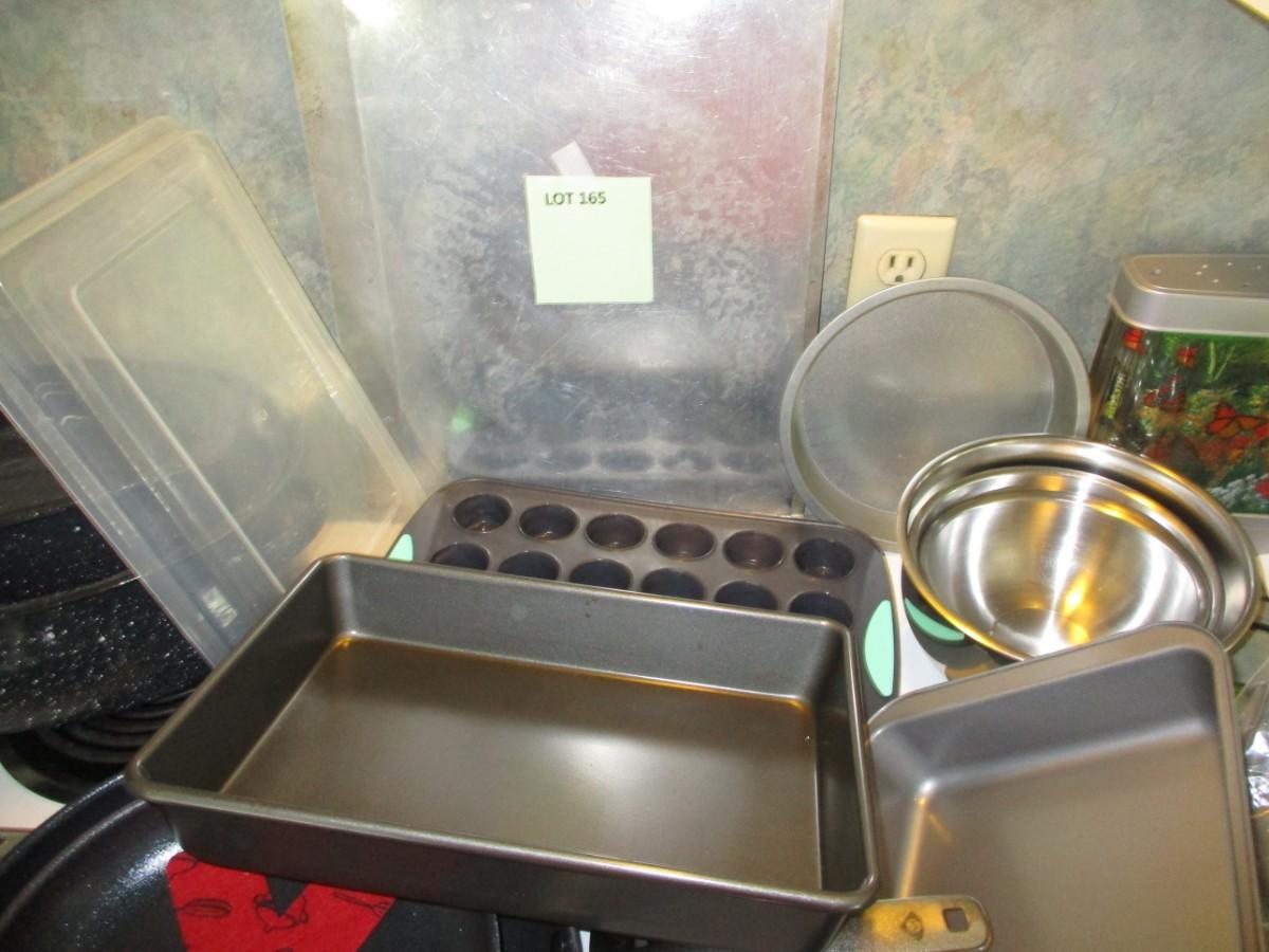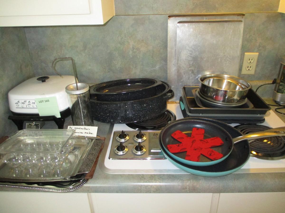 Electric Fryer, Baking Sheets, Mayon maker, Roasting Pans large and small Rubber Muffin pant, stainless steel mixing bowls, 2 frying pans.