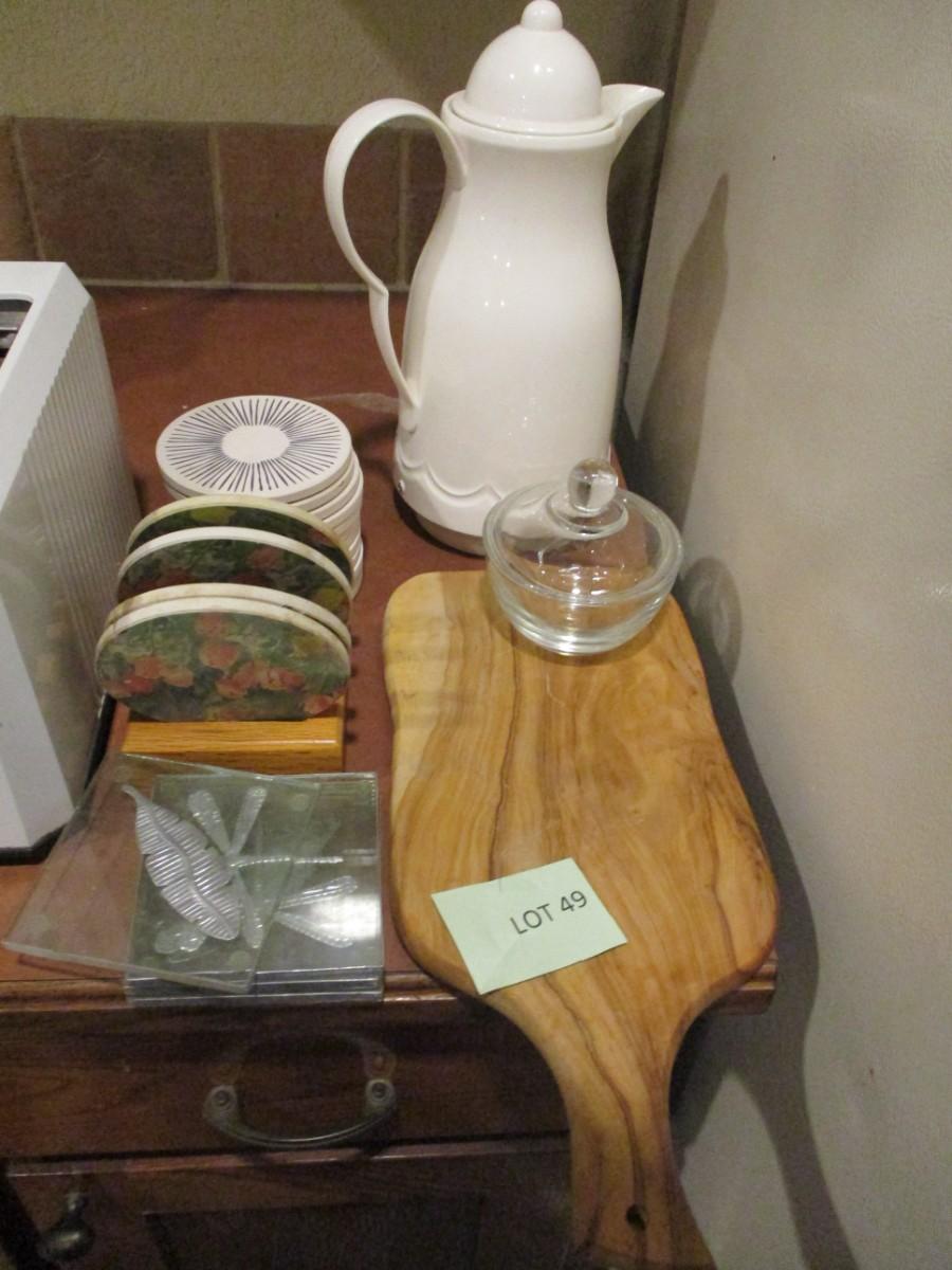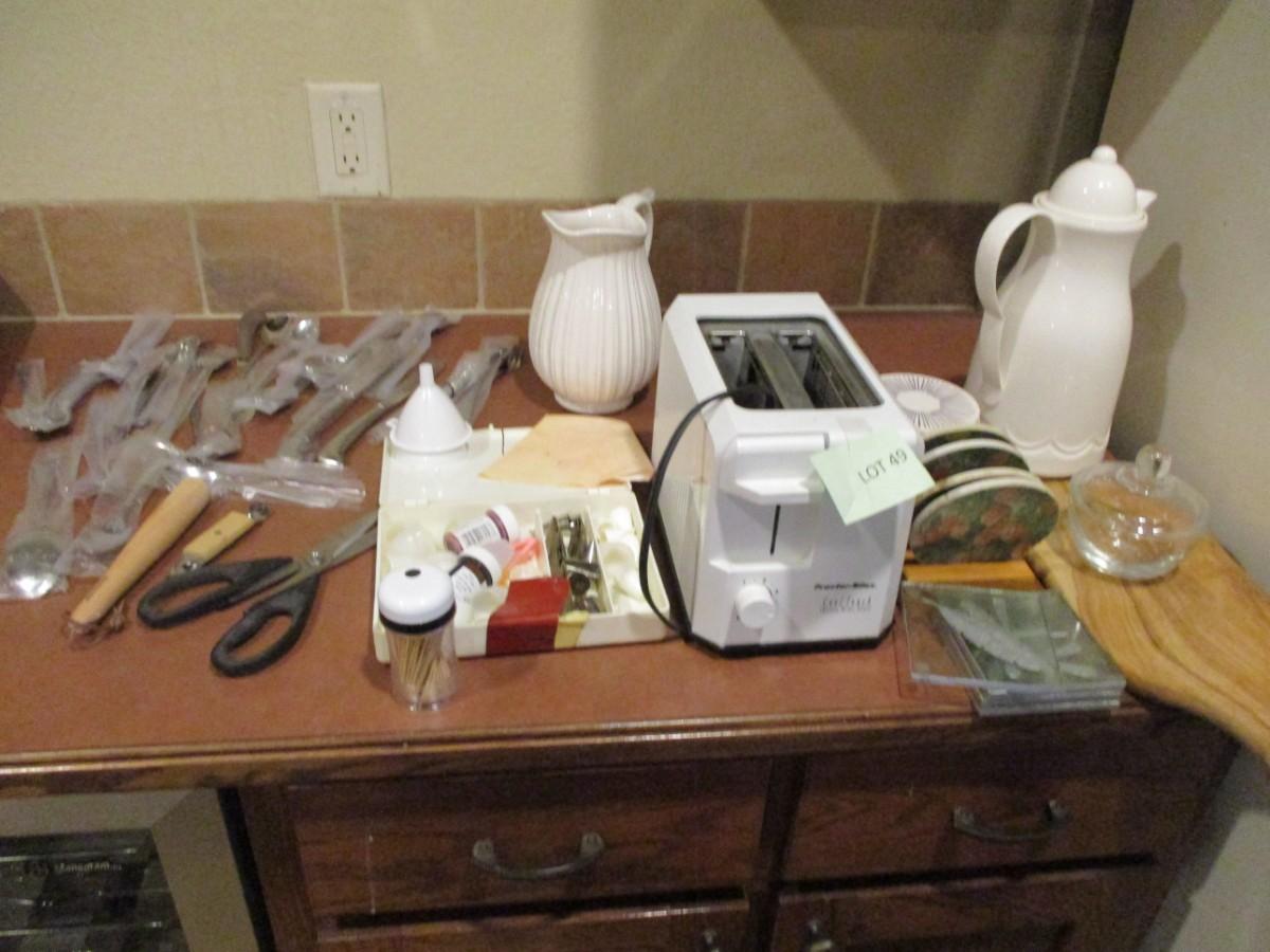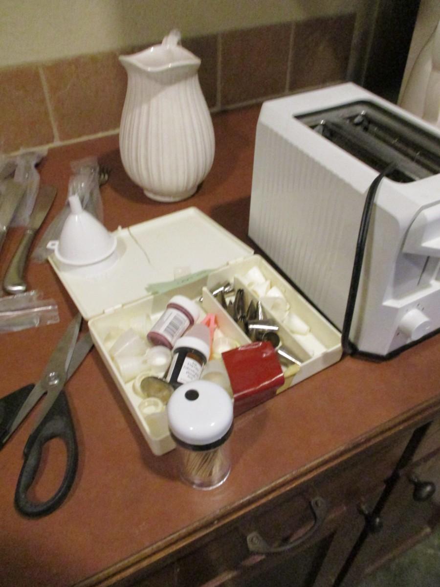 Flatware, Cutting board, Coffee Pitcher, Toaster. Coasters. Cake decorating supplies