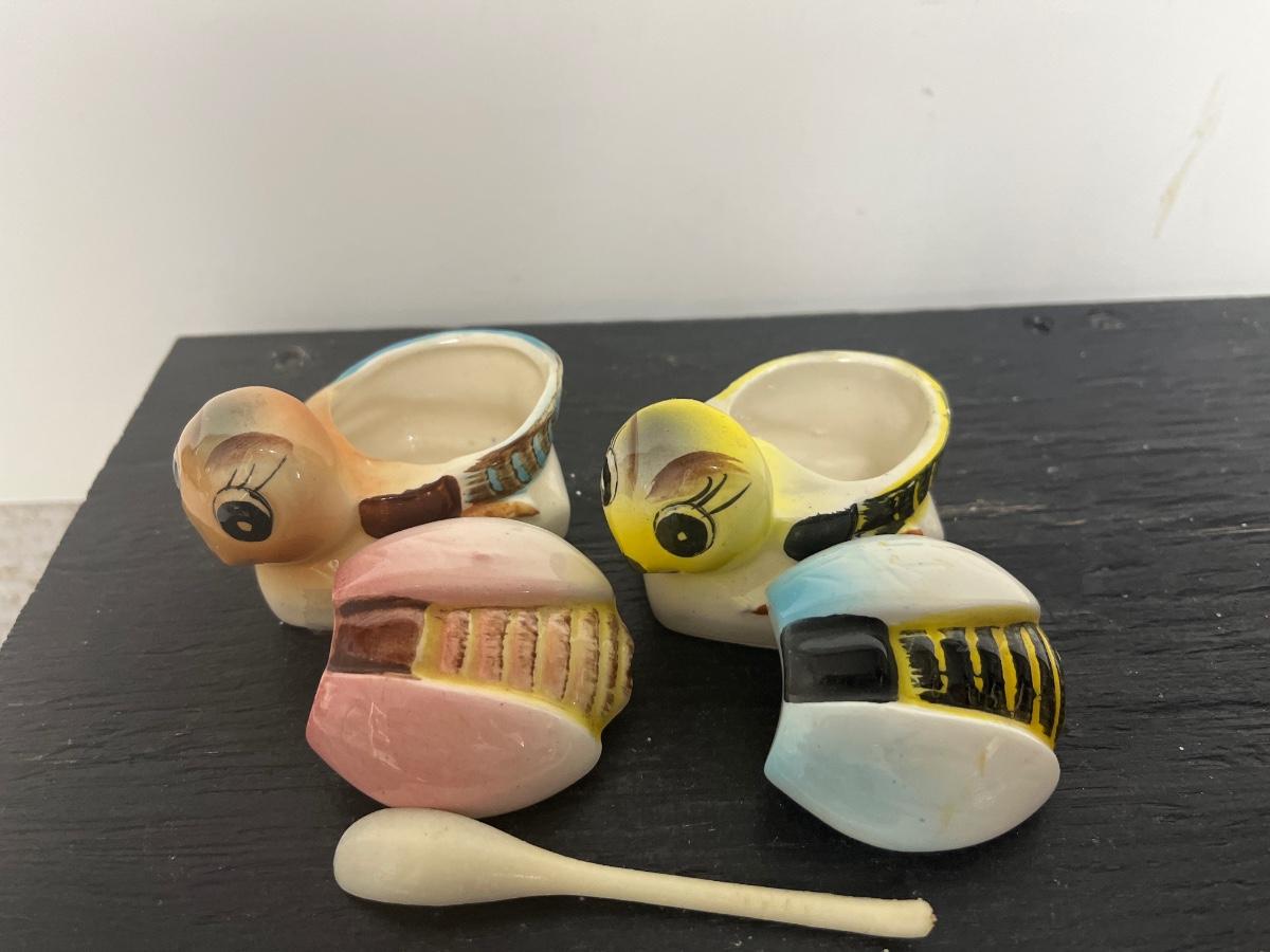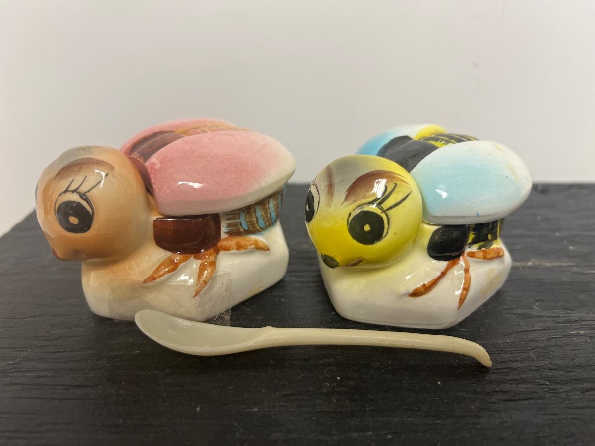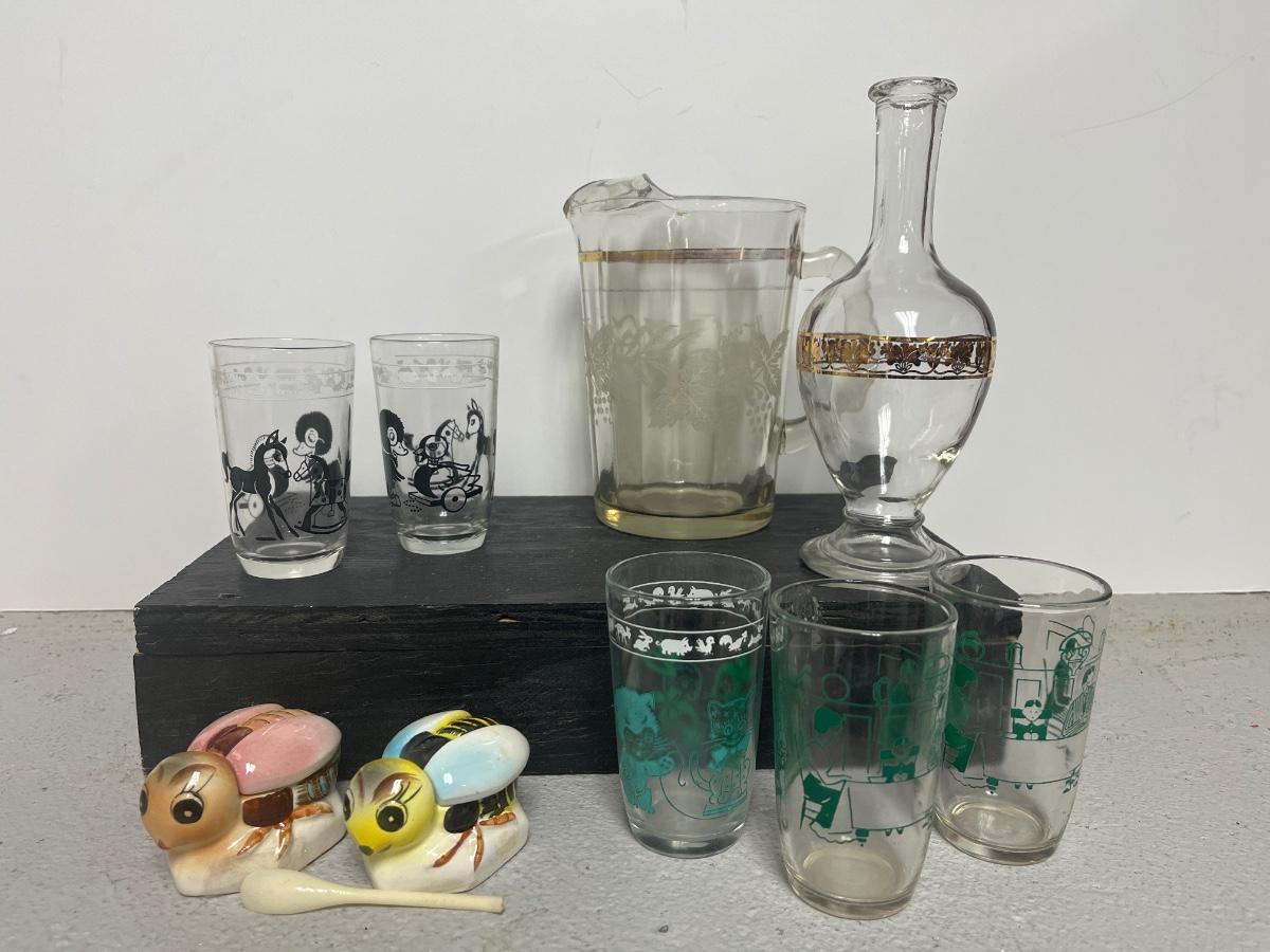 Set of two black animal swanky swigs, three green kittens swanky swigs, Bartlett Collins grapevine pitcher has some wear and a chip in spout, vintage Avon perfume decanter without stopper, and two adorable little bug mustard pots