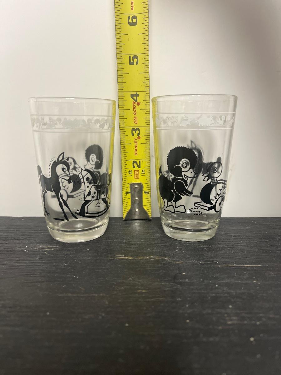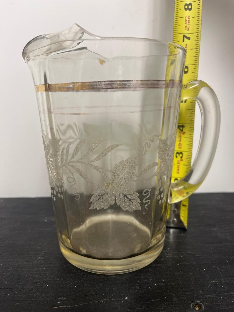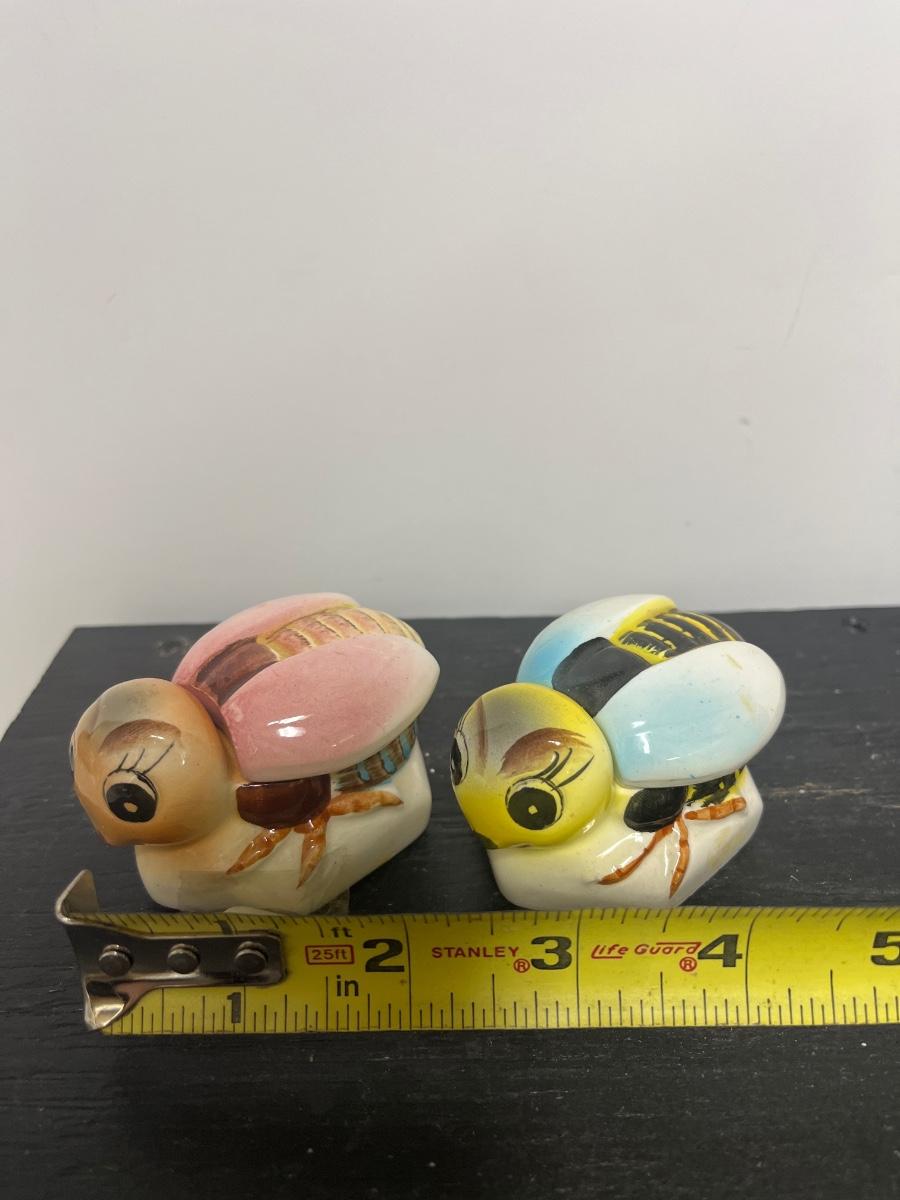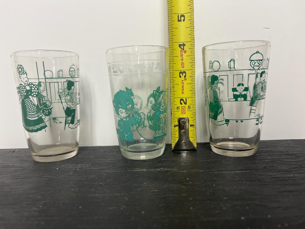 Set of two black animal swanky swigs, three green kittens swanky swigs, Bartlett Collins grapevine pitcher has some wear and a chip in spout, vintage Avon perfume decanter without stopper, and two adorable little bug mustard pots