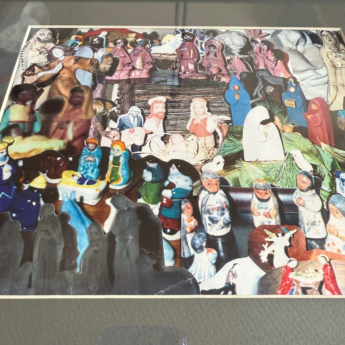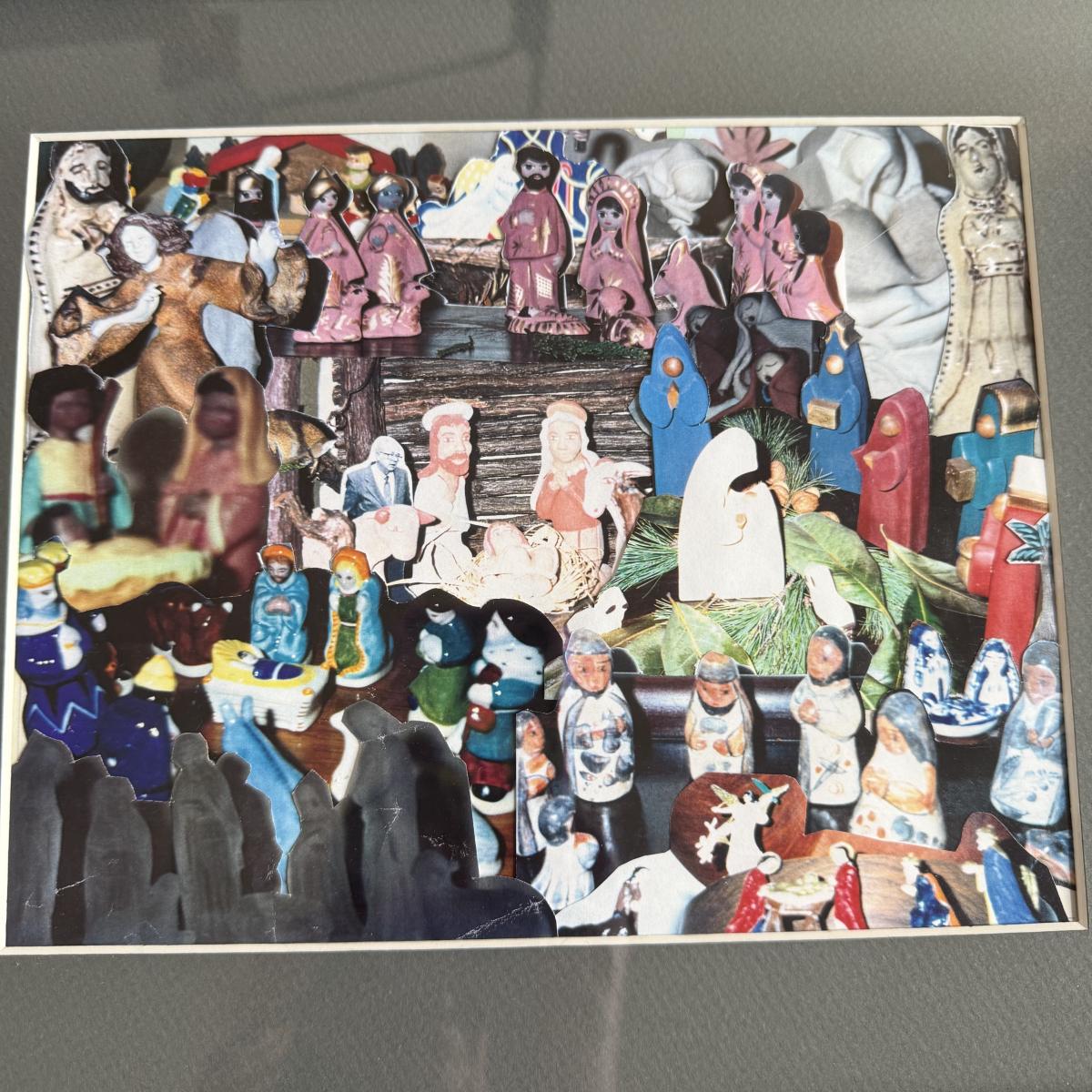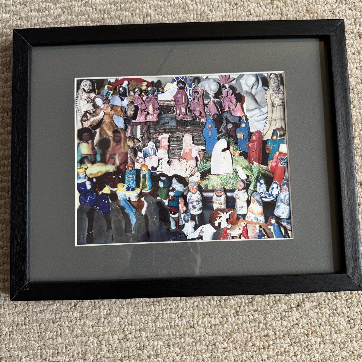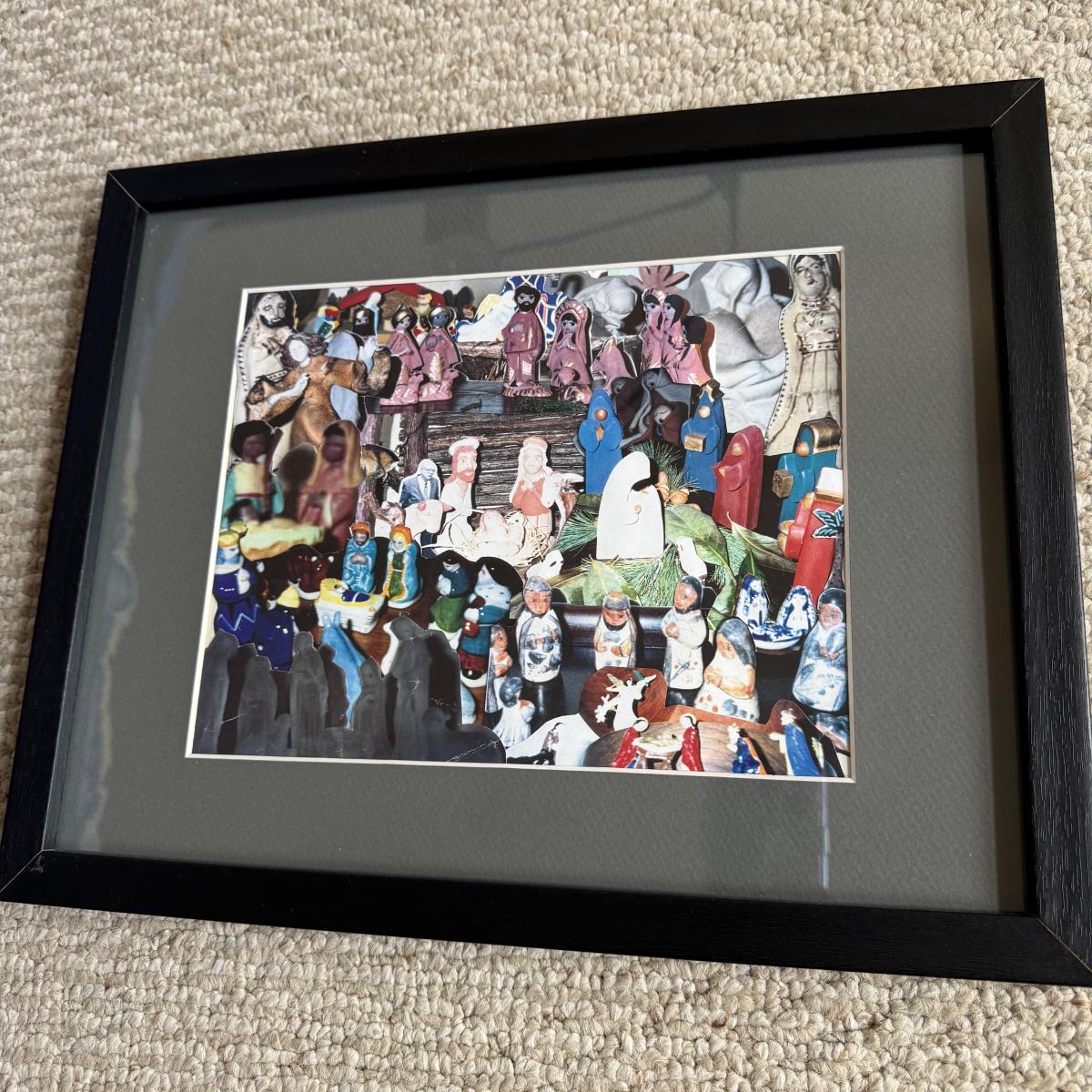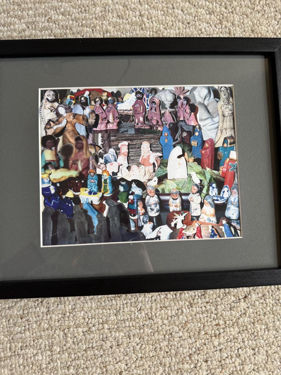 This lot contains a funky, blended collage of nativity scenes and other Christian based images. It is fun and vibrant and popping with variety. This item measures 15” x 12” and sits behind glass in a black wooden frame. It also has hardware to be hung. Shipping available.