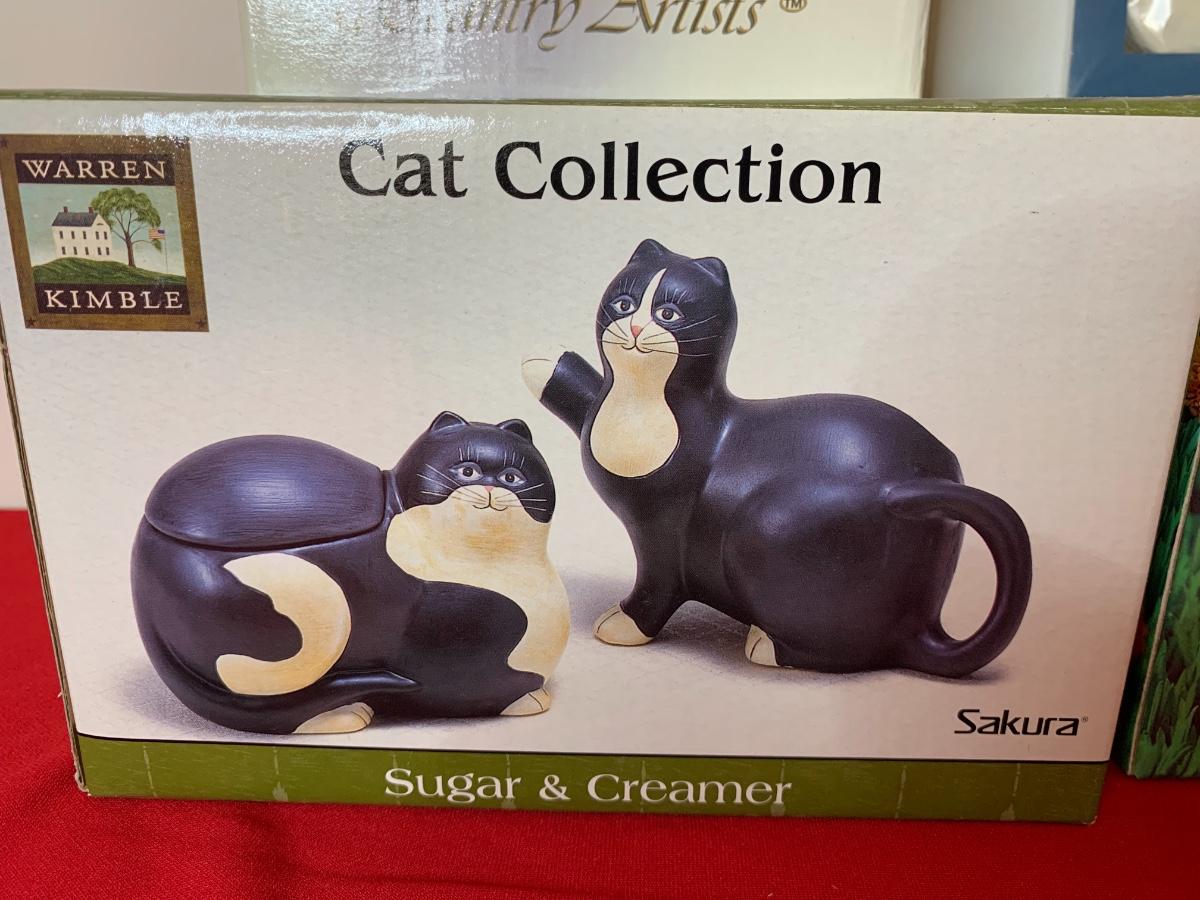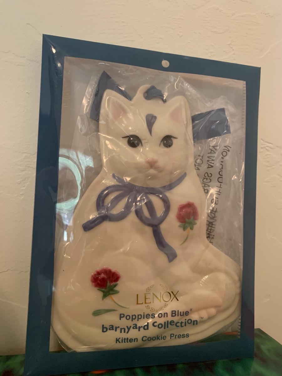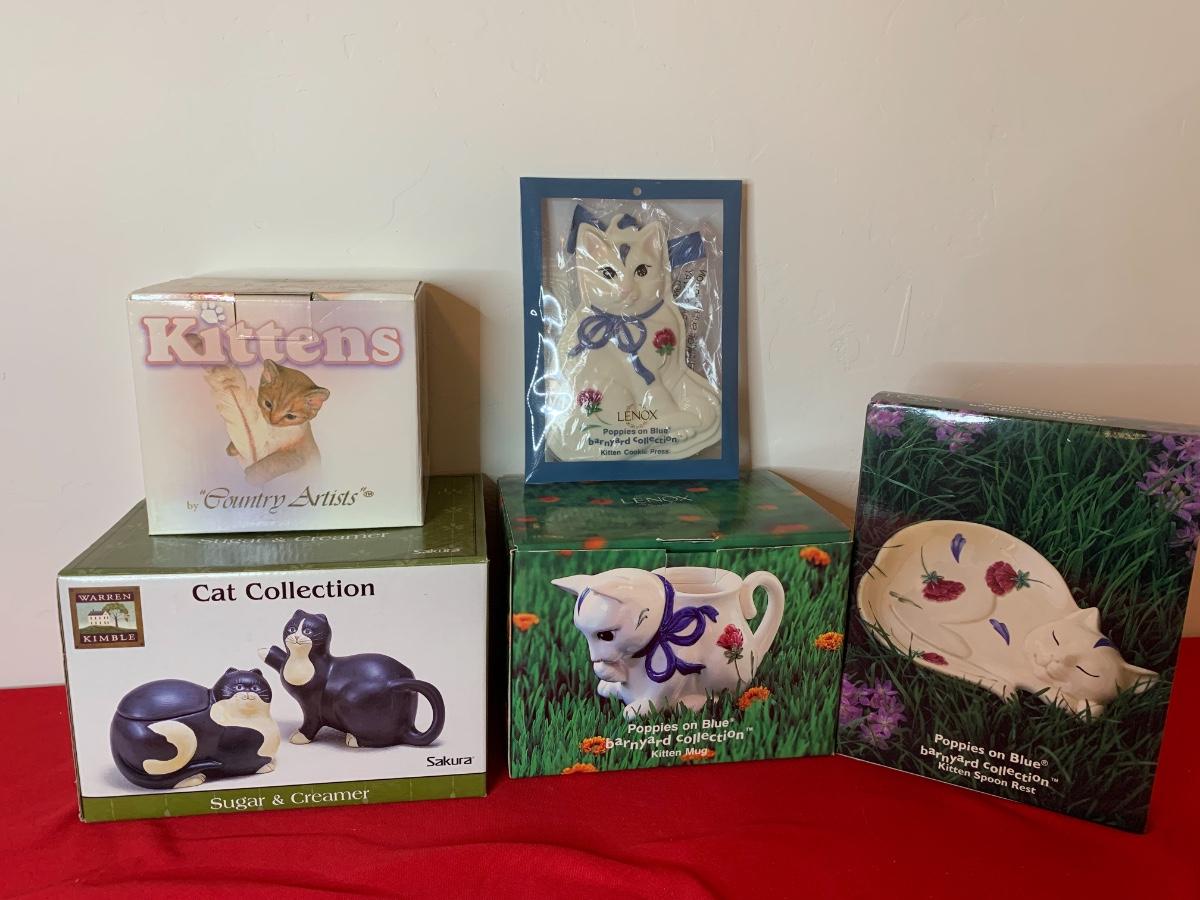 Cat sugar and creamer, Kitten figurine, Lenox cat cookie press, Lenox cat creamer, Lenox kitten spoon rest - all in original boxes, very good condition.