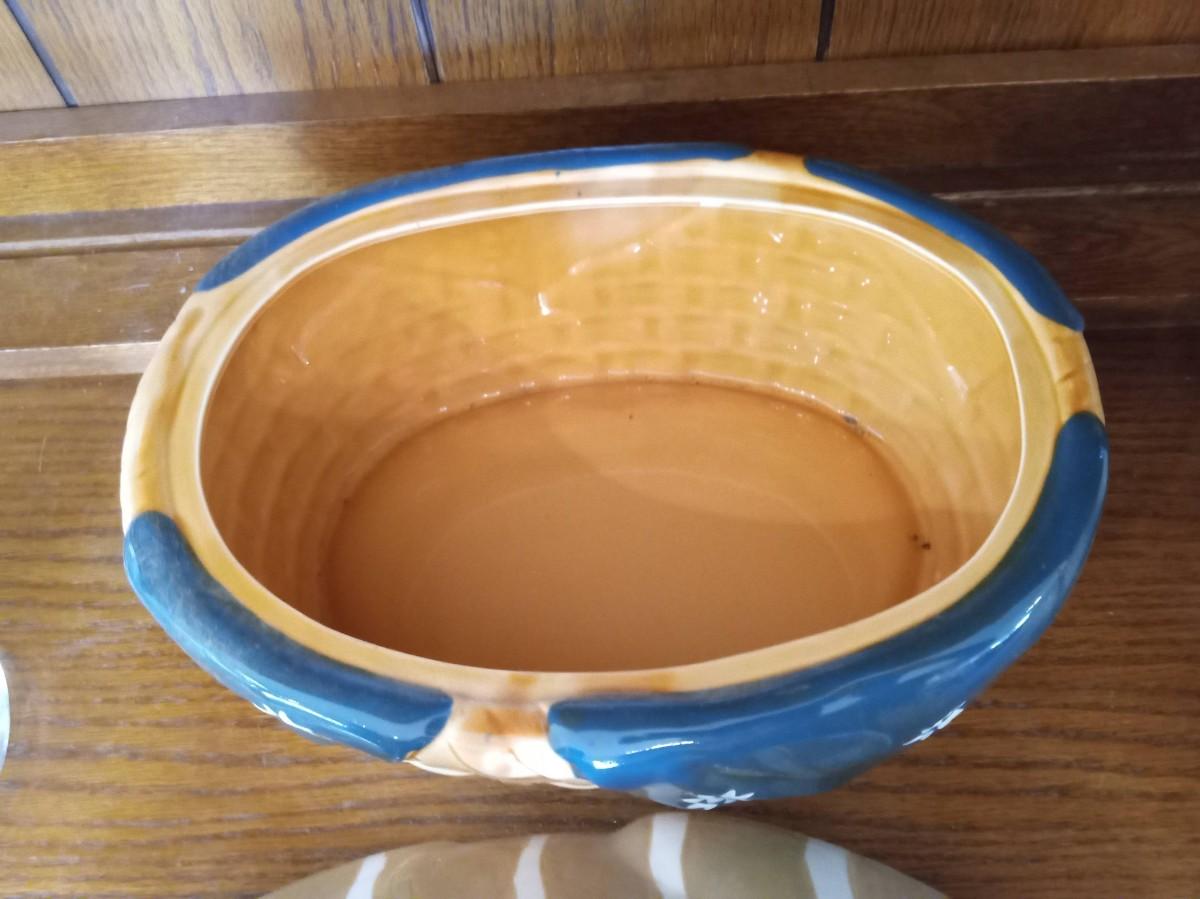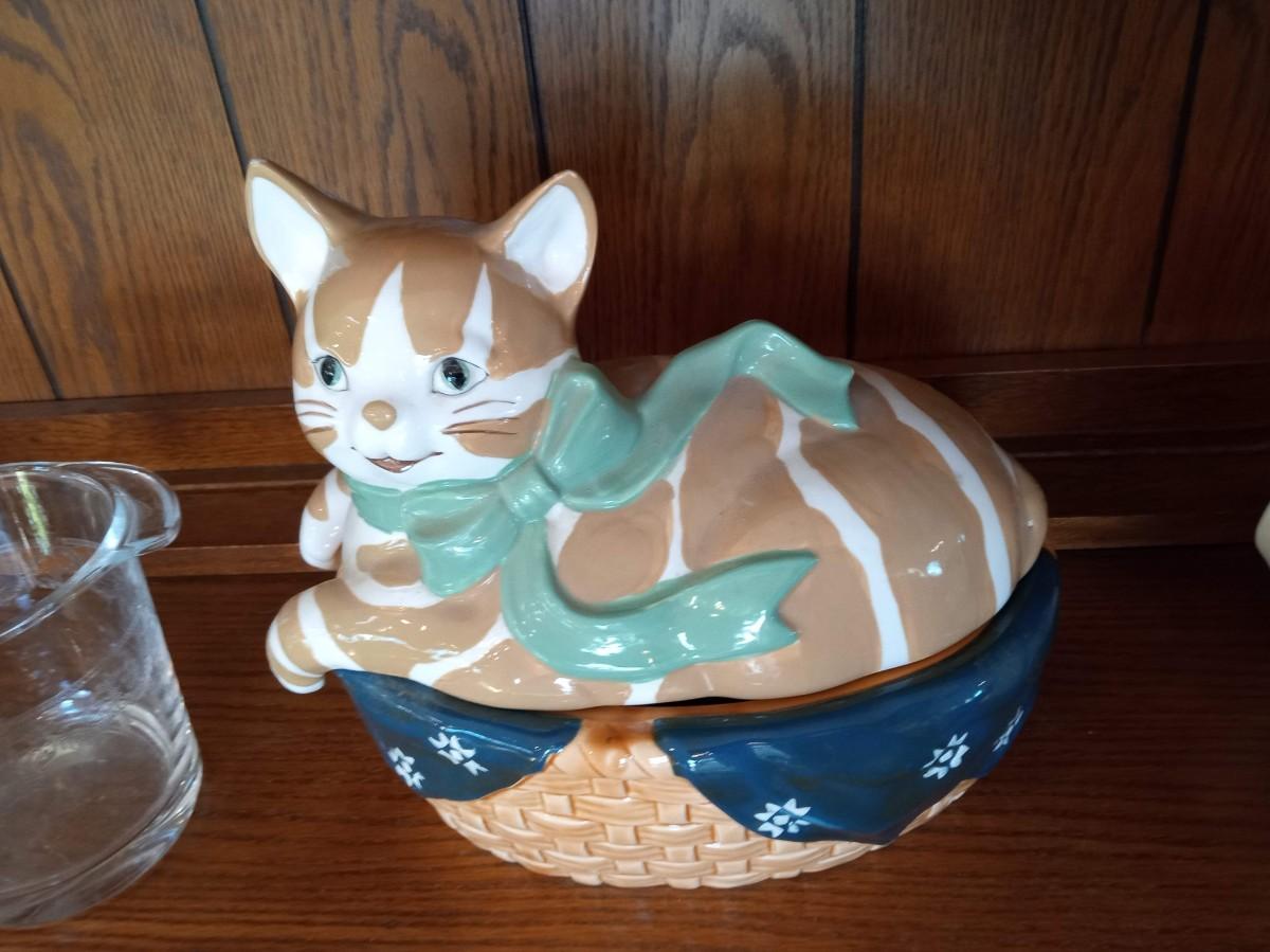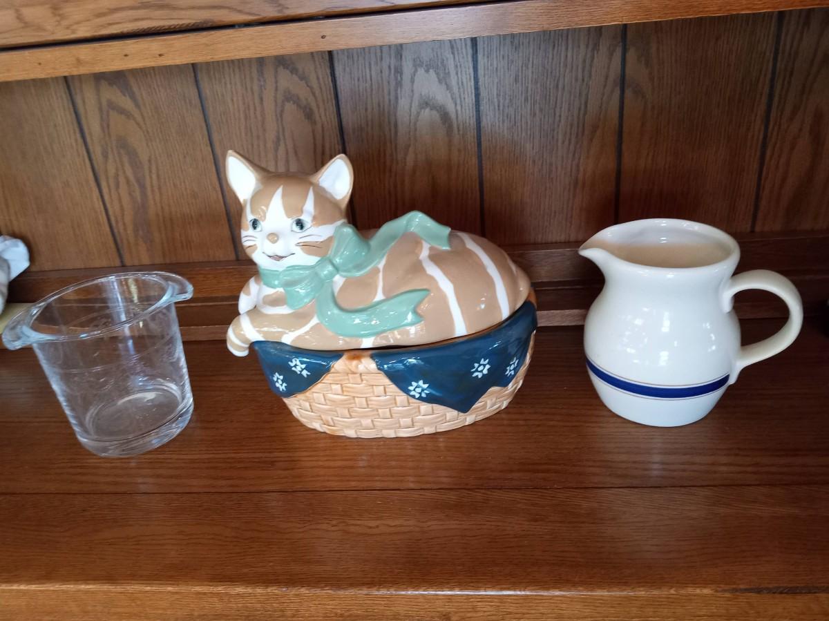 KITTY CAT COOKIE JAR, CLAY PITCHER AND GLASS DISH